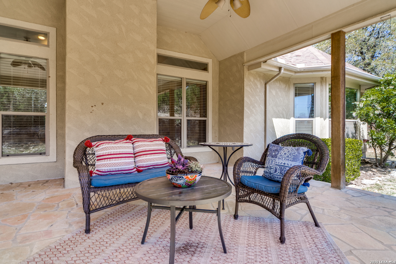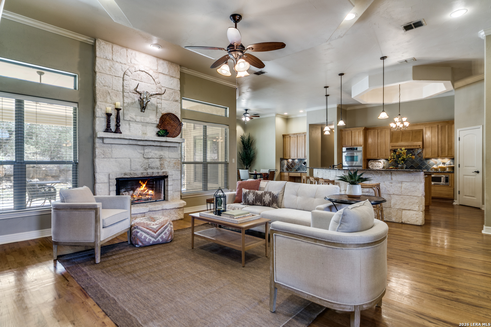 Welcome to this stunning 4-bedroom, 3.5-bath home nestled on a spacious 1.05-acre lot in the desirable River Crossing neighborhood. Designed with an open floor plan, this home offers a seamless flow between living spaces, perfect for both everyday living and entertaining.The layout features two inviting eating areas, including a separate formal dining room, providing flexibility for casual meals or special gatherings. The family room is highlighted by an impressive rock fireplace that extends to the ceiling, serving as a striking focal point. The island kitchen opens to the main living areas and features ample cabinetry, offering plenty of storage and workspace for cooking and entertaining. Added conveniences such as a central vacuum system enhance everyday functionality. Enjoy outdoor living with an oversized covered patio overlooking a private backyard shaded by mature trees, perfect for relaxing or hosting guests in a peaceful setting. The oversized primary bedroom provides a comfortable retreat, while the elegant en-suite bathroom features a unique walk-in shower that surrounds a luxurious jacuzzi tub, delivering a spa-like experience at home. Combining an open layout, thoughtful features, and a serene 1.05-acre setting, this home offers comfort, privacy, and exceptional Hill Country living.