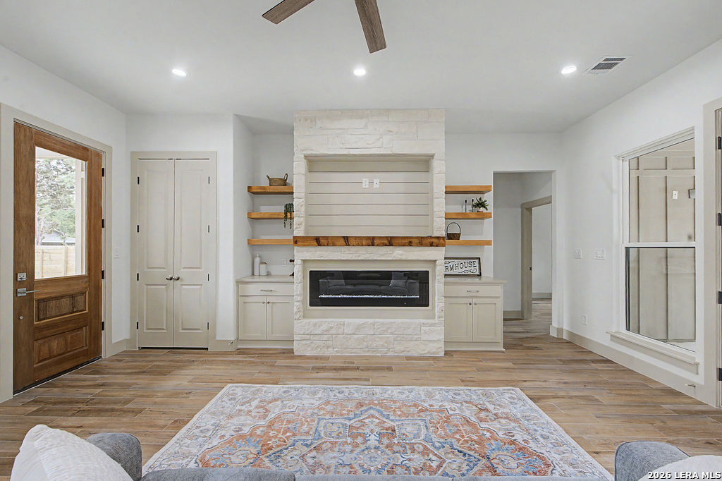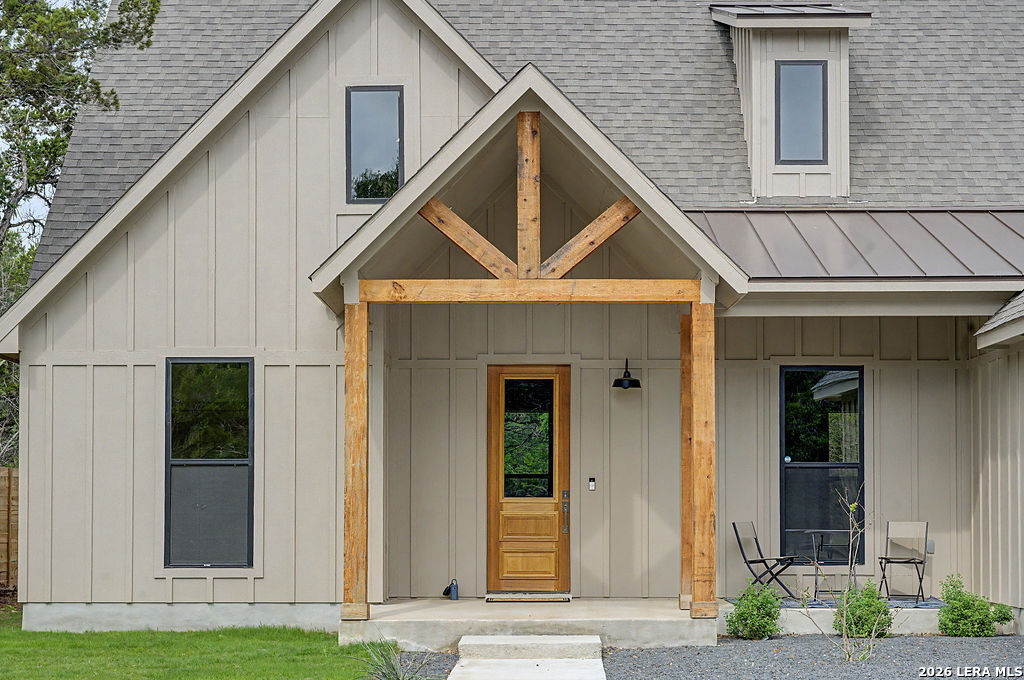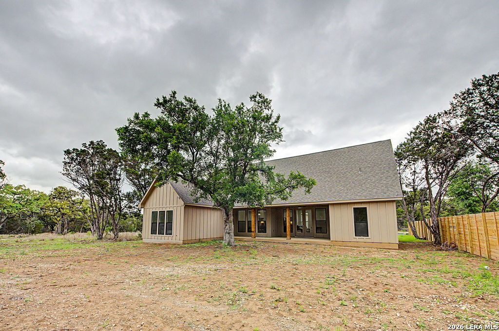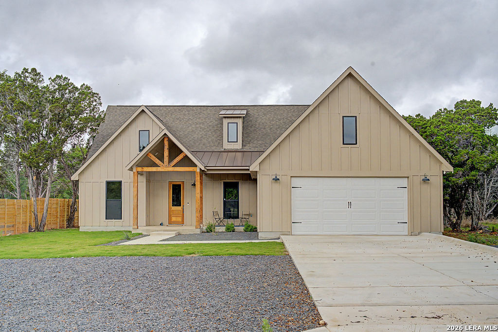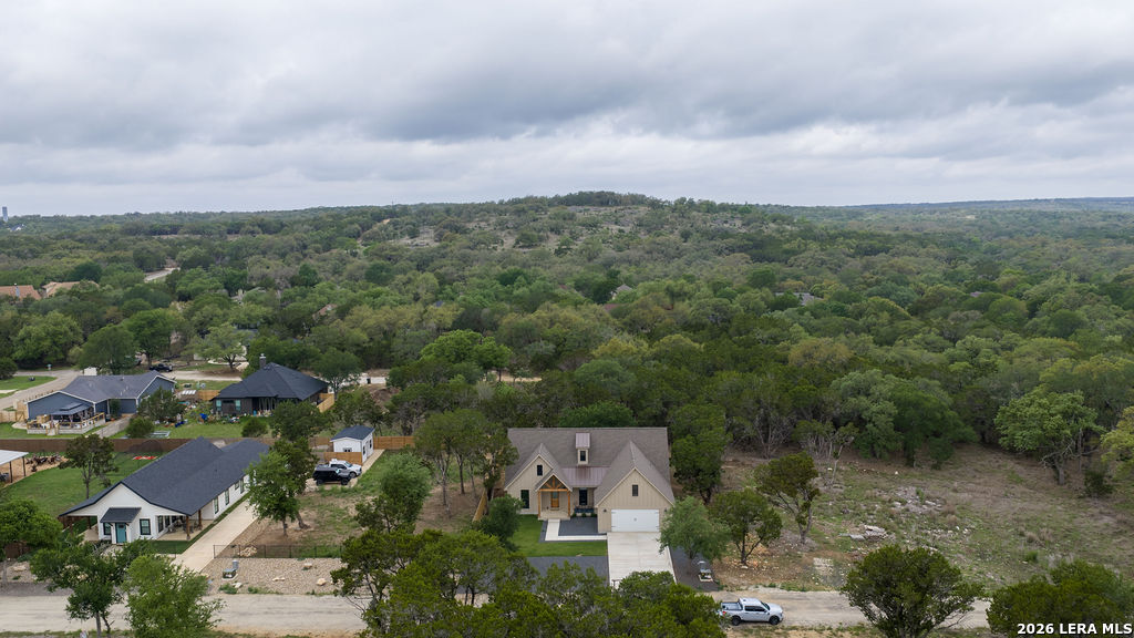 Welcome to 39 Summertime Cir, a stunning new construction modern farmhouse built by DSHRL Holdings LLC in the breathtaking Wimberley Hill Country. Masterfully built with impeccable attention to detail, this stunning residence blends sleek lines with warm, rustic charm. Offering an ideal open-concept layout, this home provides the ultimate sanctuary for relaxation and entertaining. From the moment you arrive, the home's curb appeal captivates with handsome board-and-batten siding, a timber-framed covered porch, and dark roof accents. Step inside to a bright, airy living space flooded with natural light. Soaring ceilings and stunning wood-look tile flooring flow continuously throughout-offering modern luxury with the convenience of absolutely no carpet! The heart of the home is the main living area, anchored by a magnificent floor-to-ceiling white stone fireplace. Complete with a custom shiplap TV nook, floating wood shelving, and built-in cabinetry, this space is truly beautiful. Seamlessly connected is the chef-inspired kitchen. It boasts a massive central island, pristine quartz countertops, sleek cabinetry, a custom wood-trimmed vent hood, and an incredible walk-in pantry with built-in prep space. The spacious primary suite is a private retreat with large windows. Step into the spa-like en-suite bath to discover an extended double vanity, a luxurious soaking tub, a walk-in shower, and a meticulously organized walk-in closet. The secondary bedrooms are generous and feature a stylish full bathroom featuring striking tile. Outside, your covered patio awaits. Whether enjoying morning coffee or hosting a barbecue, this outdoor space offers ultimate tranquility. The property's mature trees provide exceptional privacy. Benefit from a desirable low tax rate while living a short drive from local attractions! Spend weekends exploring Blue Hole Regional Park, Jacob's Well, local wineries, and the boutiques of downtown Wimberley Square.