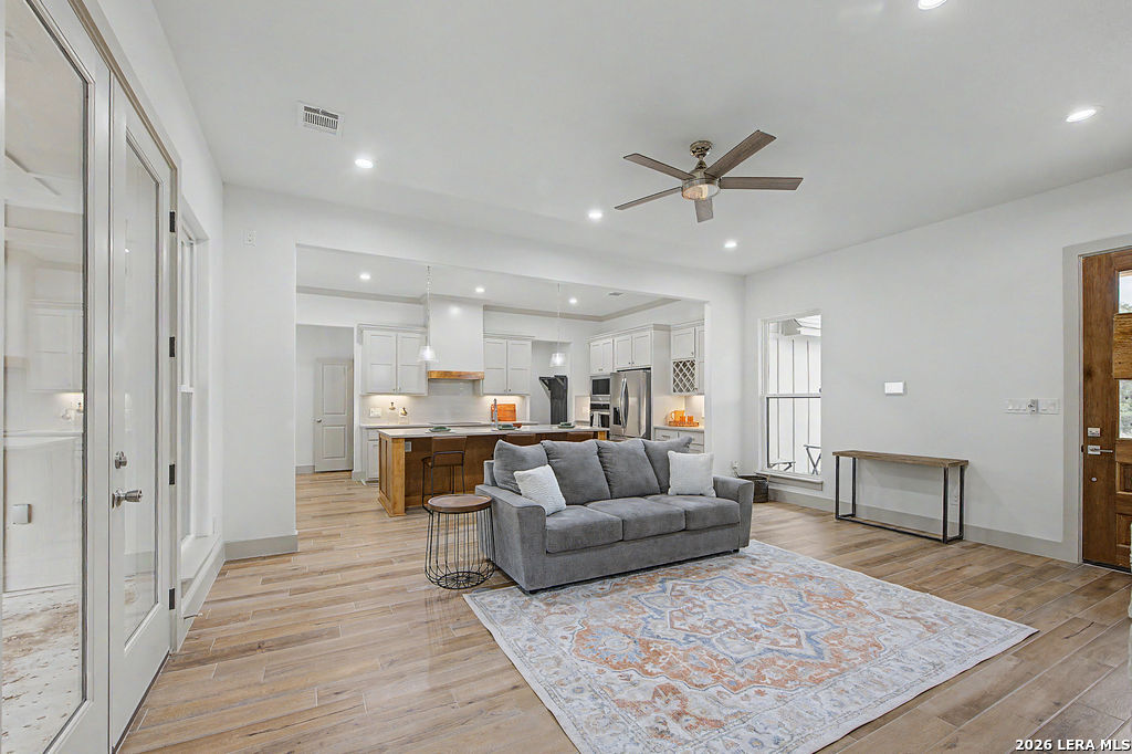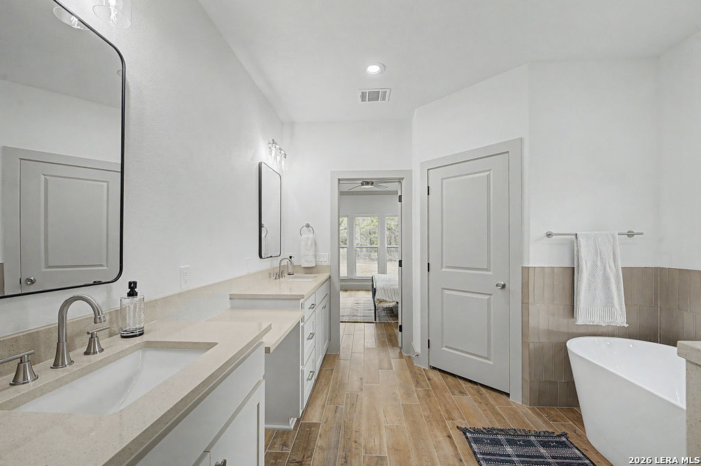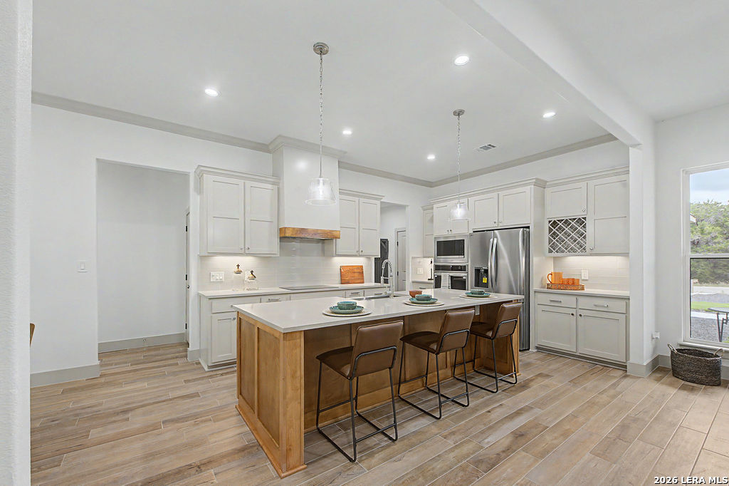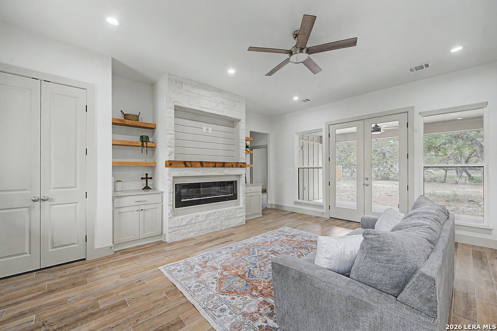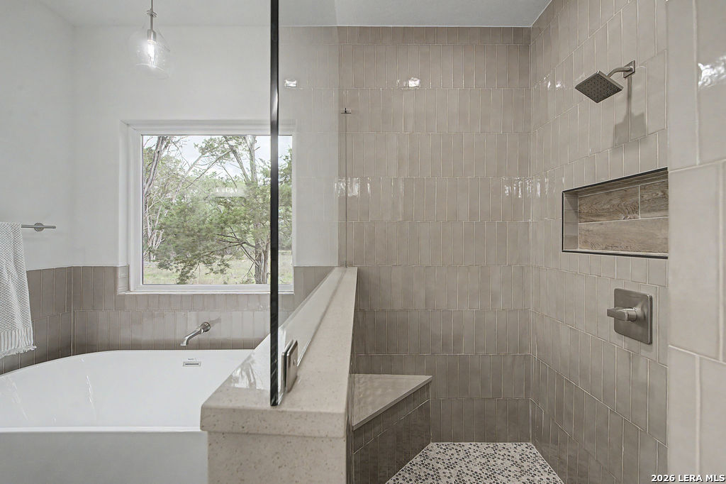 Welcome to 39 Summertime Cir, a stunning new construction modern farmhouse built by DSHRL Holdings LLC in the breathtaking Wimberley Hill Country. Masterfully built with impeccable attention to detail, this stunning residence blends sleek lines with warm, rustic charm. Offering an ideal open-concept layout, this home provides the ultimate sanctuary for relaxation and entertaining. From the moment you arrive, the home's curb appeal captivates with handsome board-and-batten siding, a timber-framed covered porch, and dark roof accents. Step inside to a bright, airy living space flooded with natural light. Soaring ceilings and stunning wood-look tile flooring flow continuously throughout-offering modern luxury with the convenience of absolutely no carpet! The heart of the home is the main living area, anchored by a magnificent floor-to-ceiling white stone fireplace. Complete with a custom shiplap TV nook, floating wood shelving, and built-in cabinetry, this space is truly beautiful. Seamlessly connected is the chef-inspired kitchen. It boasts a massive central island, pristine quartz countertops, sleek cabinetry, a custom wood-trimmed vent hood, and an incredible walk-in pantry with built-in prep space. The spacious primary suite is a private retreat with large windows. Step into the spa-like en-suite bath to discover an extended double vanity, a luxurious soaking tub, a walk-in shower, and a meticulously organized walk-in closet. The secondary bedrooms are generous and feature a stylish full bathroom featuring striking tile. Outside, your covered patio awaits. Whether enjoying morning coffee or hosting a barbecue, this outdoor space offers ultimate tranquility. The property's mature trees provide exceptional privacy. Benefit from a desirable low tax rate while living a short drive from local attractions! Spend weekends exploring Blue Hole Regional Park, Jacob's Well, local wineries, and the boutiques of downtown Wimberley Square.
