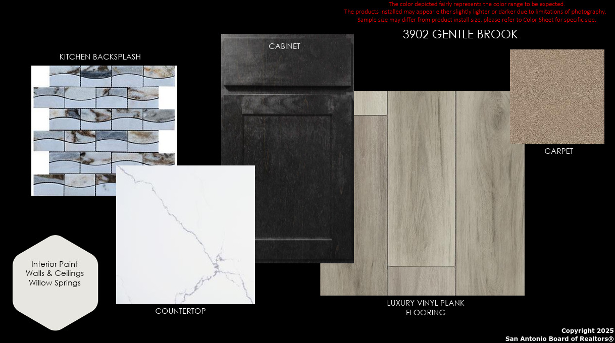 ** JANUARY READY ** Welcome to 3902 Gentle Brook, your future dream home tucked away in the vibrant NE San Antonio! This two-story beauty has all the space you need - 3 bedrooms upstairs, a cool game room loft and 2.5 stylish bathrooms. The exterior is a showstopper with a modern flair, sleek Alpine Blend Stone, Whiskers siding, and stucco. Inside, you'll find a kitchen with Kent Moore Custom Espresso cabinets topped with dazzling white quartz countertops - perfect for cooking, entertaining, or just looking fabulous. Flowing with luxury vinyl plank flooring in all main areas, this home feels cozy yet chic. The bathrooms feature rich espresso cabinets paired with trendy grey backsplashes, adding a splash of style. And did we mention? It's Energy Star certified !! Plus, you'll love the super convenient location-close to grocery stores, eateries, and easy access to 1604, I-35, and Wurbach Hwy for quick trips around town.