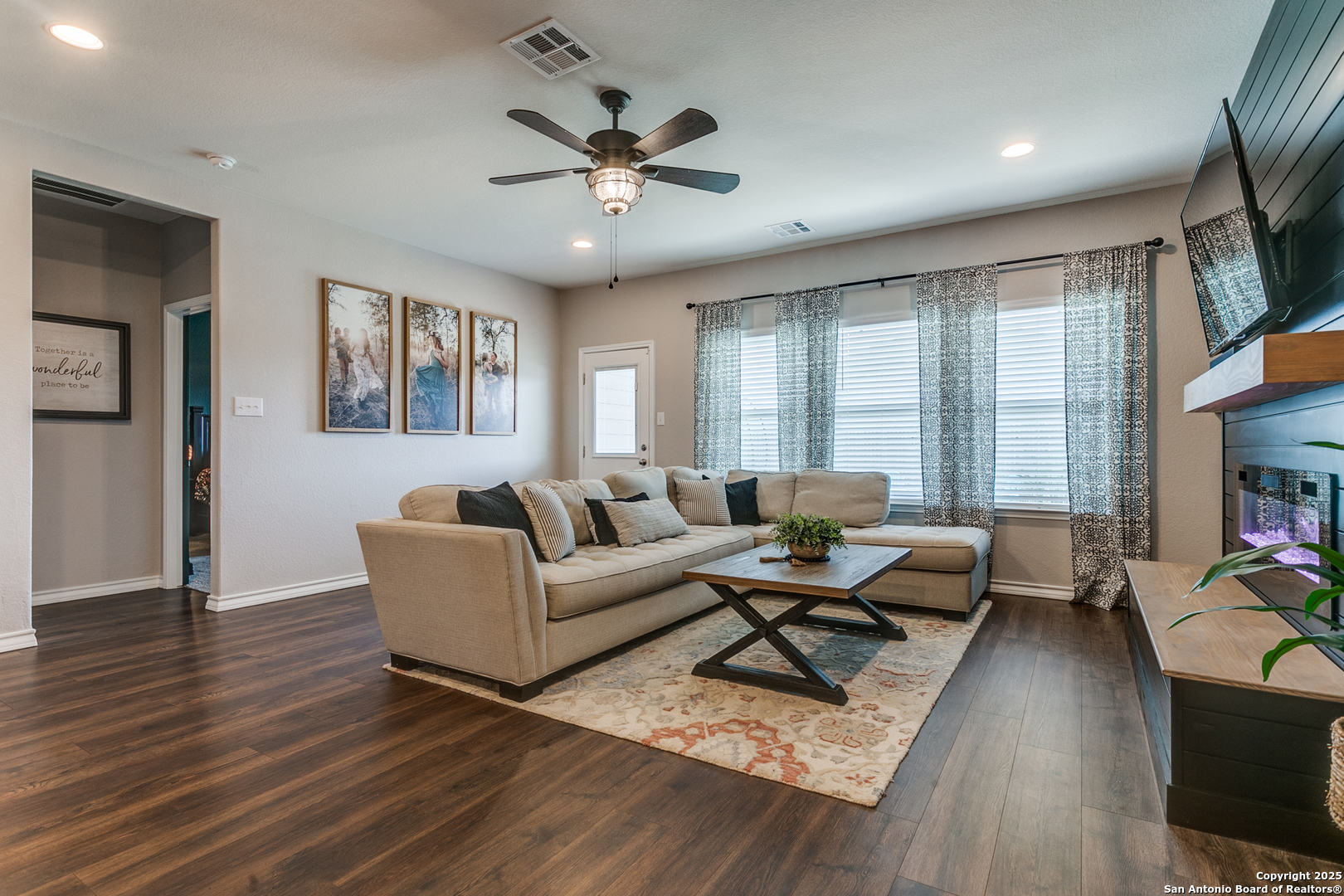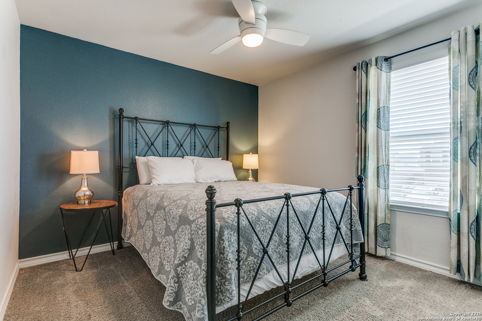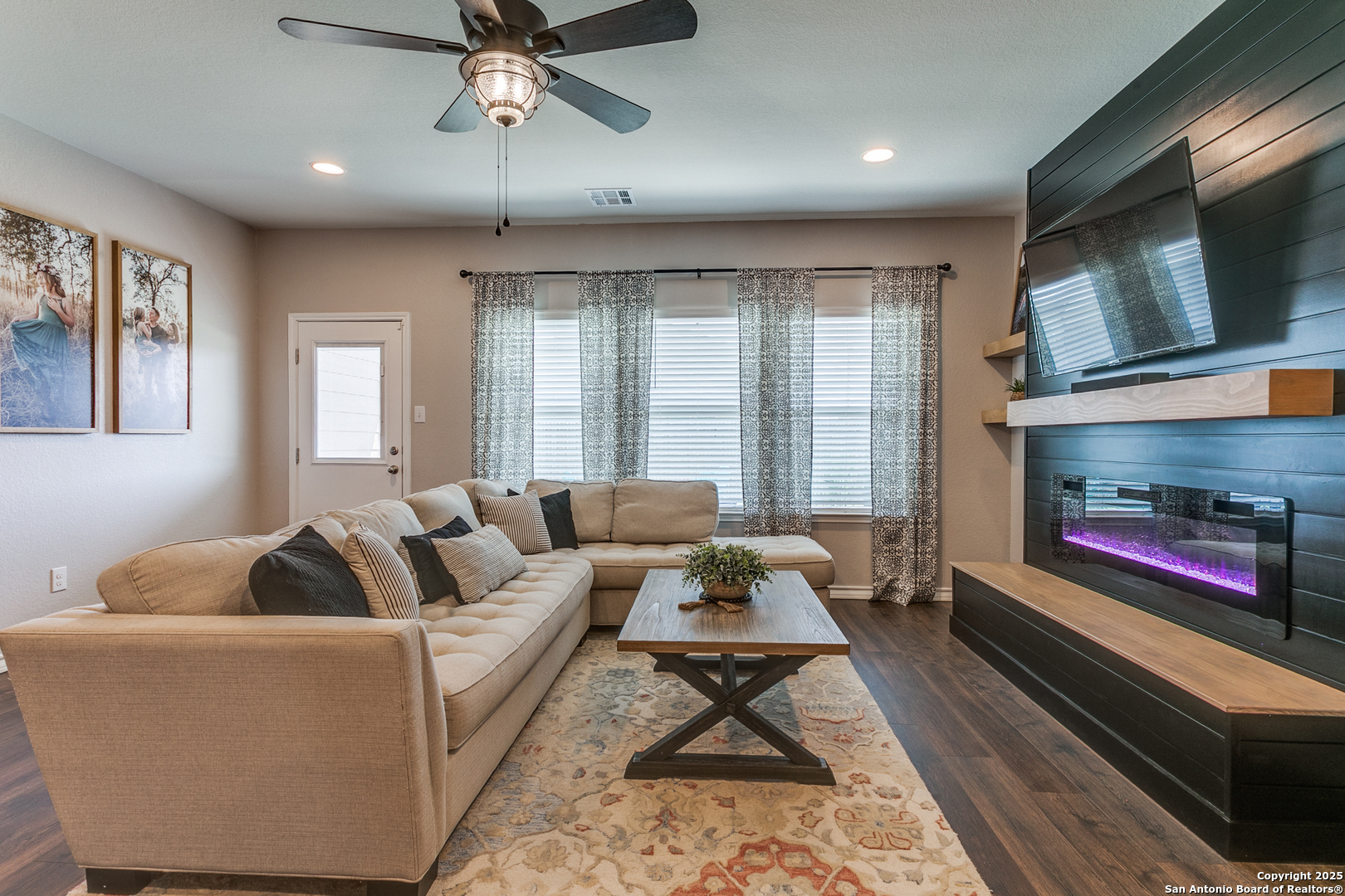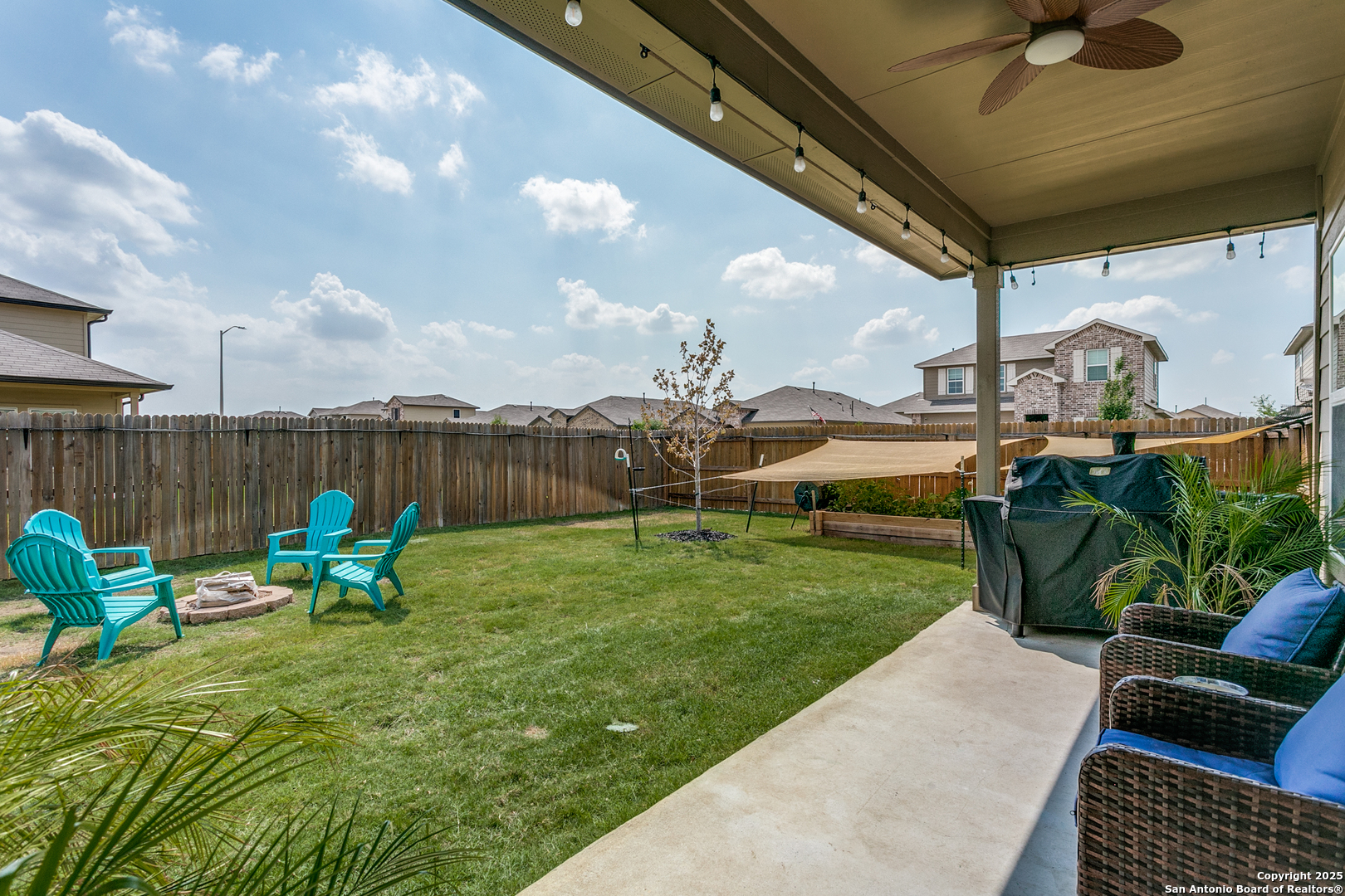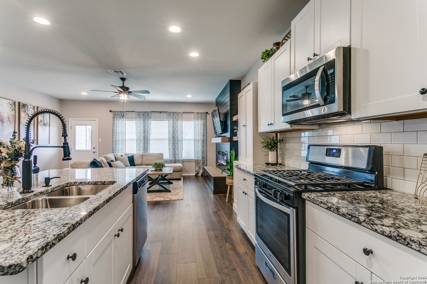 Welcome home to this stylish 4 bedroom 3 bath home filled with designer accents and finishes. This beauty is clean, move in ready and exudes pride of ownership! Downstairs boasts an open floor plan with an island kitchen, dining space and nice living area filled with natural light along with a secondary bedroom and full bath in addition to the spacious primary bedroom with a large walk in closet. Upstairs you will find a large game room with two additional bedrooms and a bath. Home sits on a nice size corner lot with a covered patio in the back including string lights, sun shades, a fire pit sitting area, raised garden beds and a sprinkler system. Light fixtures, fans and faucets have been upgraded and there is a beautiful custom built electric fireplace/entertainment unit with floating shelves. Great location close to historic Gruene, Schliterbahn, tons of shopping and everything New Braunfels has to offer.