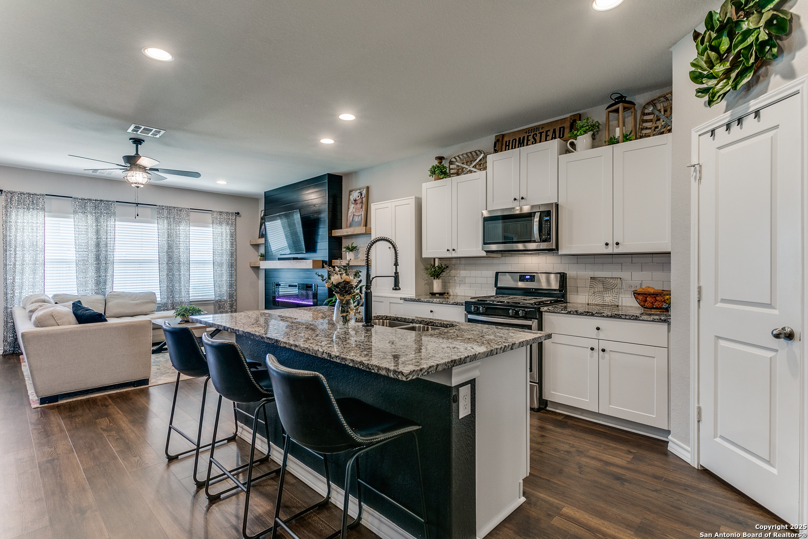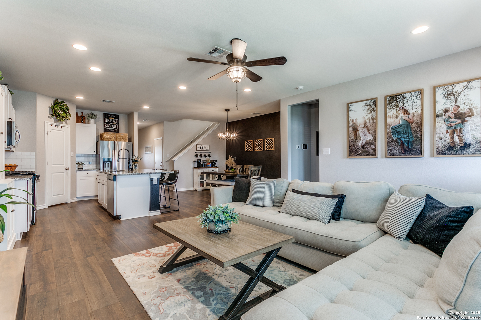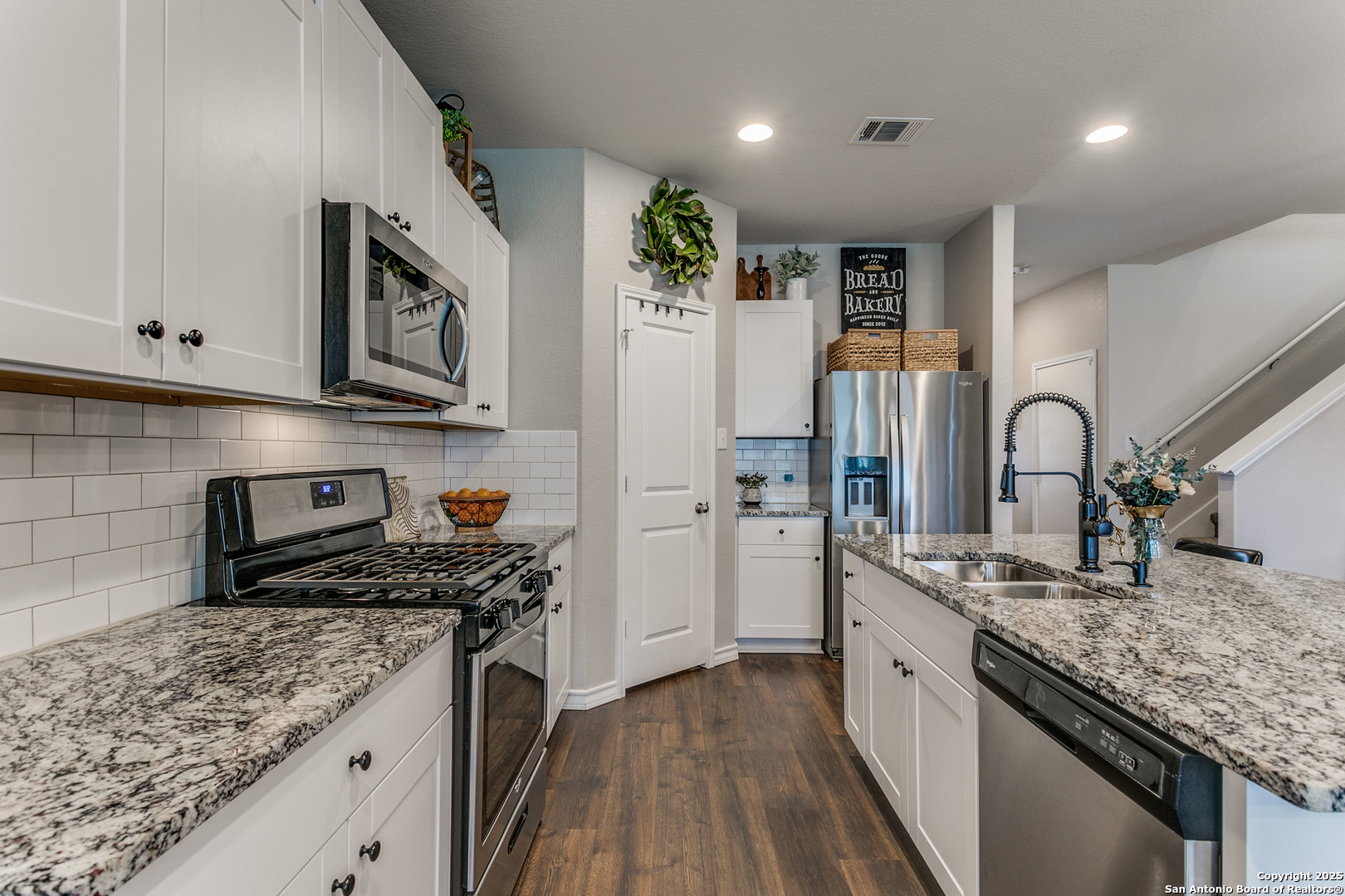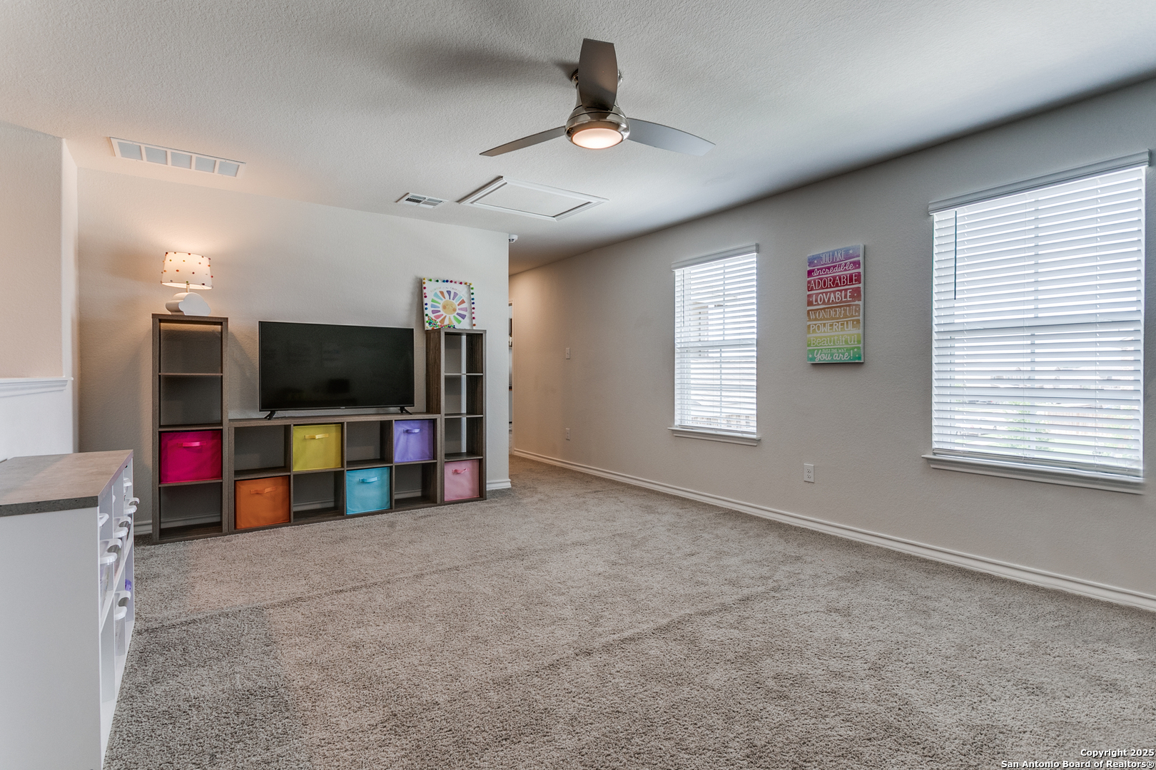 Welcome home to this stylish 4 bedroom 3 bath home filled with designer accents and finishes. This beauty is clean, move in ready and exudes pride of ownership! Downstairs boasts an open floor plan with an island kitchen, dining space and nice living area filled with natural light along with a secondary bedroom and full bath in addition to the spacious primary bedroom with a large walk in closet. Upstairs you will find a large game room with two additional bedrooms and a bath. Home sits on a nice size corner lot with a covered patio in the back including string lights, sun shades, a fire pit sitting area, raised garden beds and a sprinkler system. Light fixtures, fans and faucets have been upgraded and there is a beautiful custom built electric fireplace/entertainment unit with floating shelves. Great location close to historic Gruene, Schliterbahn, tons of shopping and everything New Braunfels has to offer.