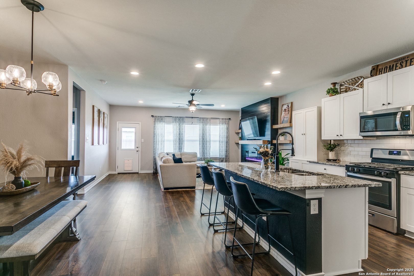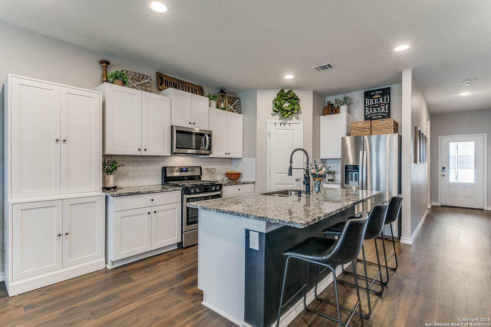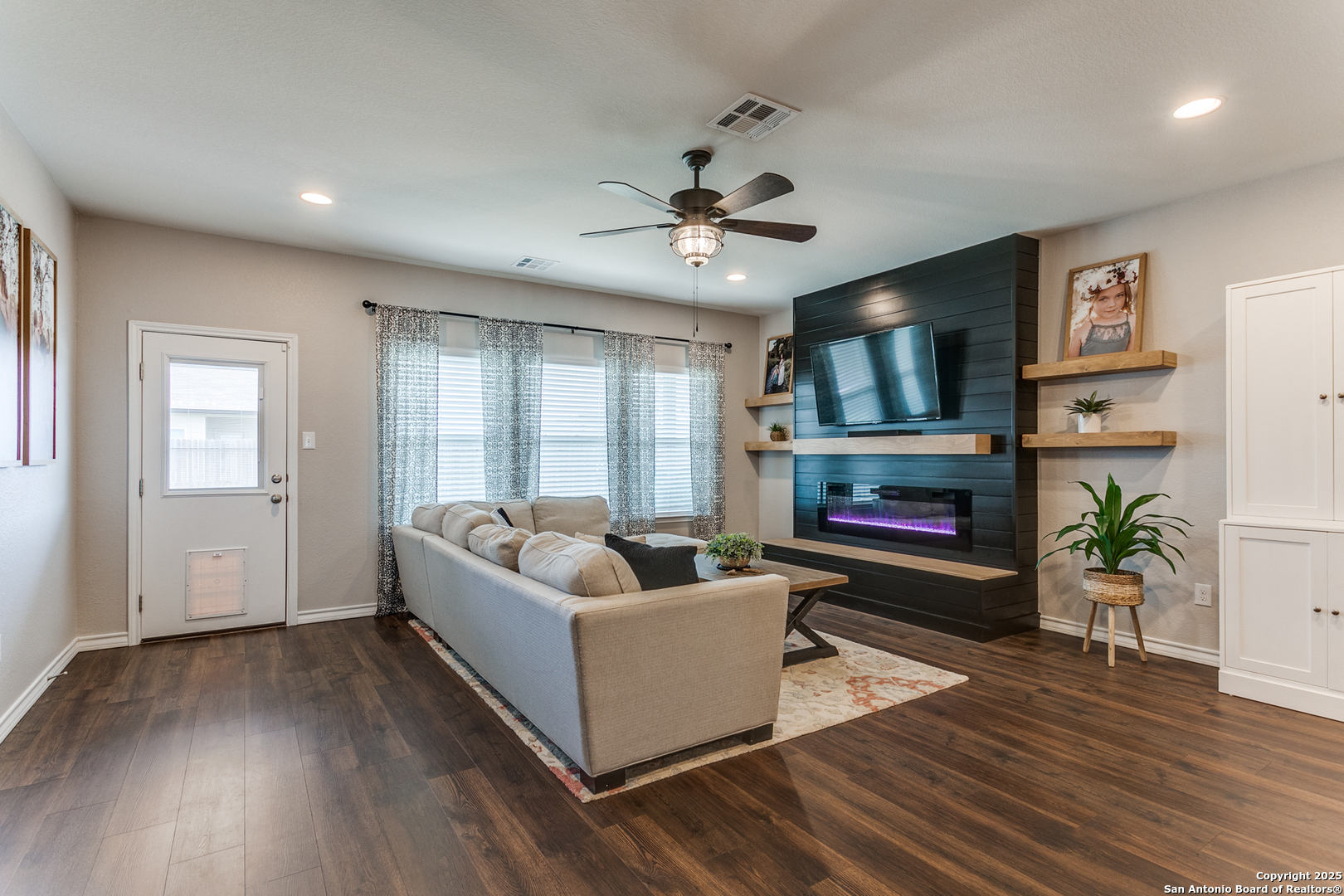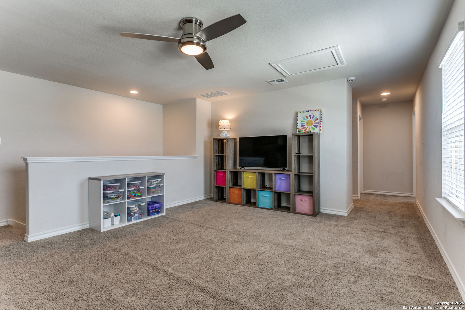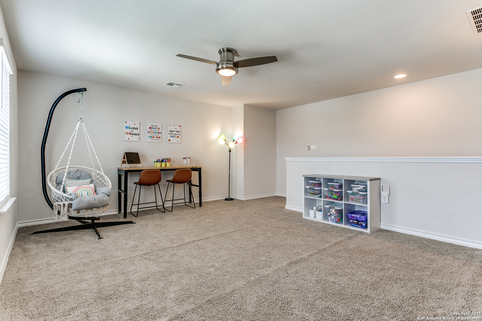Welcome home to this stylish 4 bedroom 3 bath home filled with designer accents and finishes. This beauty is clean, move in ready and exudes pride of ownership! Downstairs boasts an open floor plan with an island kitchen, dining space and nice living area filled with natural light along with a secondary bedroom and full bath in addition to the spacious primary bedroom with a large walk in closet. Upstairs you will find a large game room with two additional bedrooms and a bath. Home sits on a nice size corner lot with a covered patio in the back including string lights, sun shades, a fire pit sitting area, raised garden beds and a sprinkler system. Light fixtures, fans and faucets have been upgraded and there is a beautiful custom built electric fireplace/entertainment unit with floating shelves. Great location close to historic Gruene, Schliterbahn, tons of shopping and everything New Braunfels has to offer.