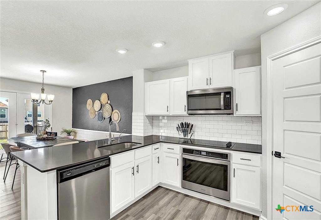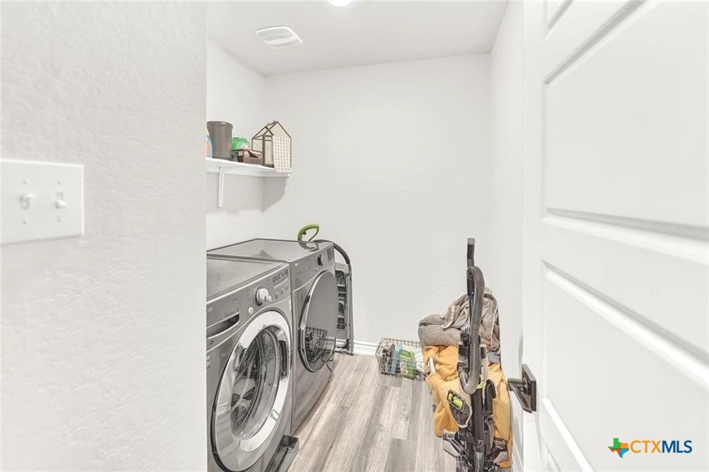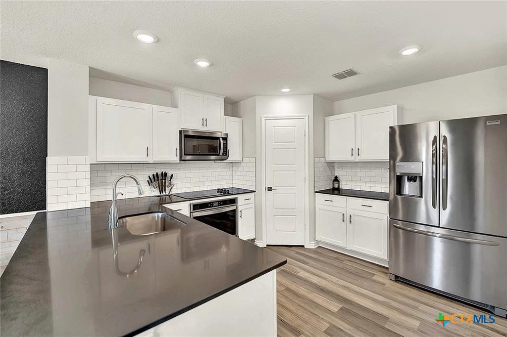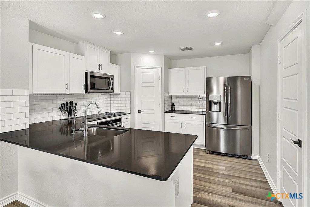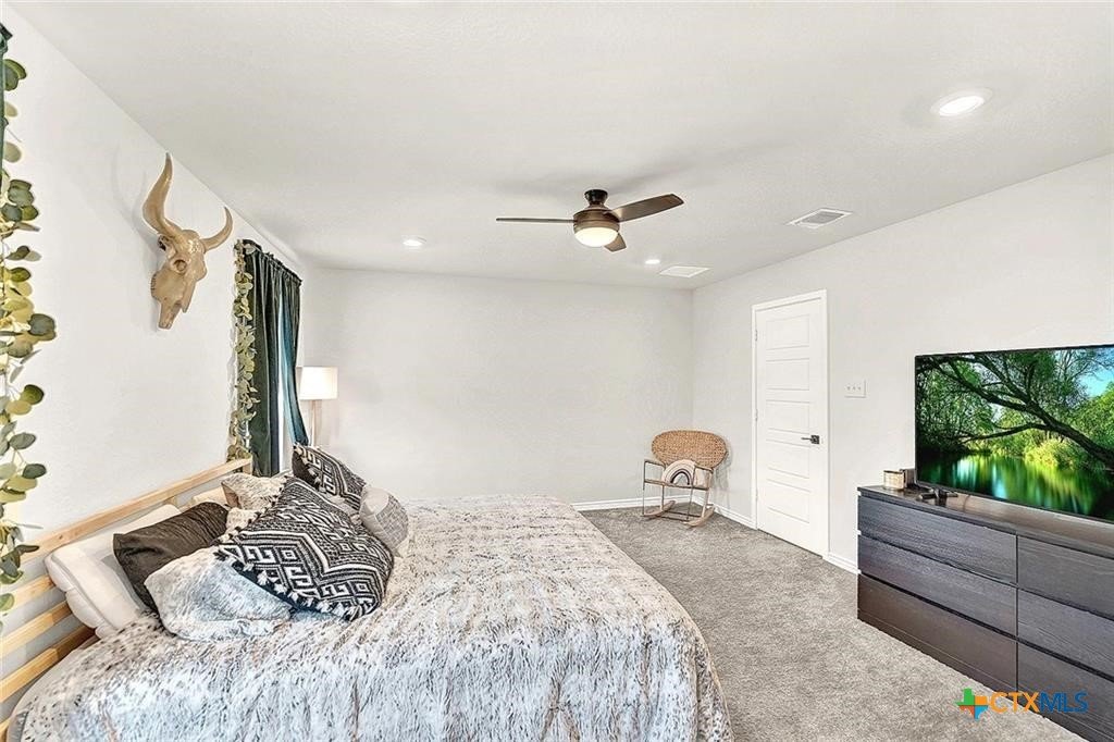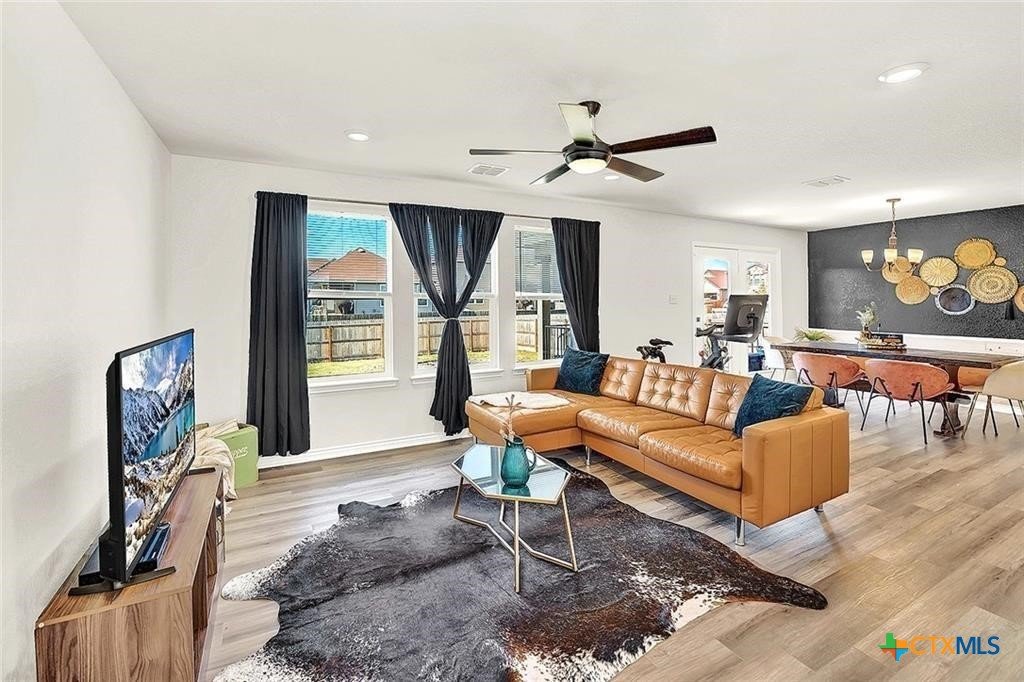 Attractive three bedroom, two bath home with two living areas and a big backyard with a covered patio. A beautiful kitchen features a breakfast bar with ample counter and cabinet space, as well as stainless appliances. A loft area upstairs serves as a second living area or flex space. The spacious primary suite has double vanities, as does the secondary bath. A laundry room upstairs close to all the bedrooms makes everyday life convenient. Recessed lighting, ceiling fans, and wood-look flooring throughout this open floor plan.