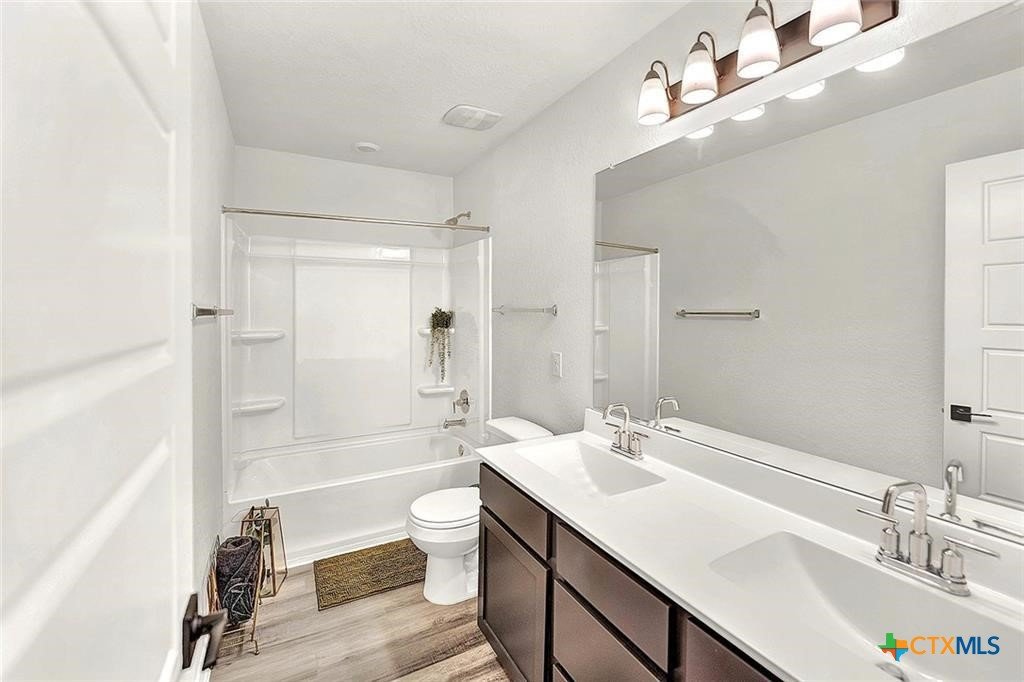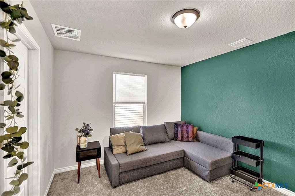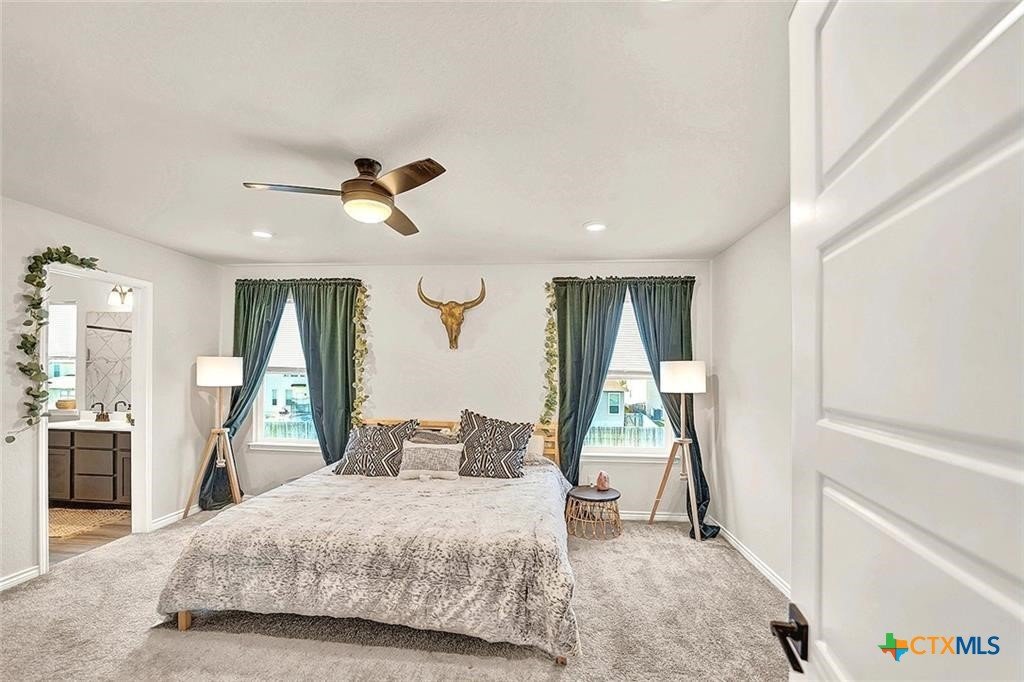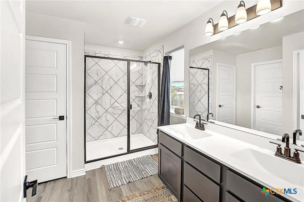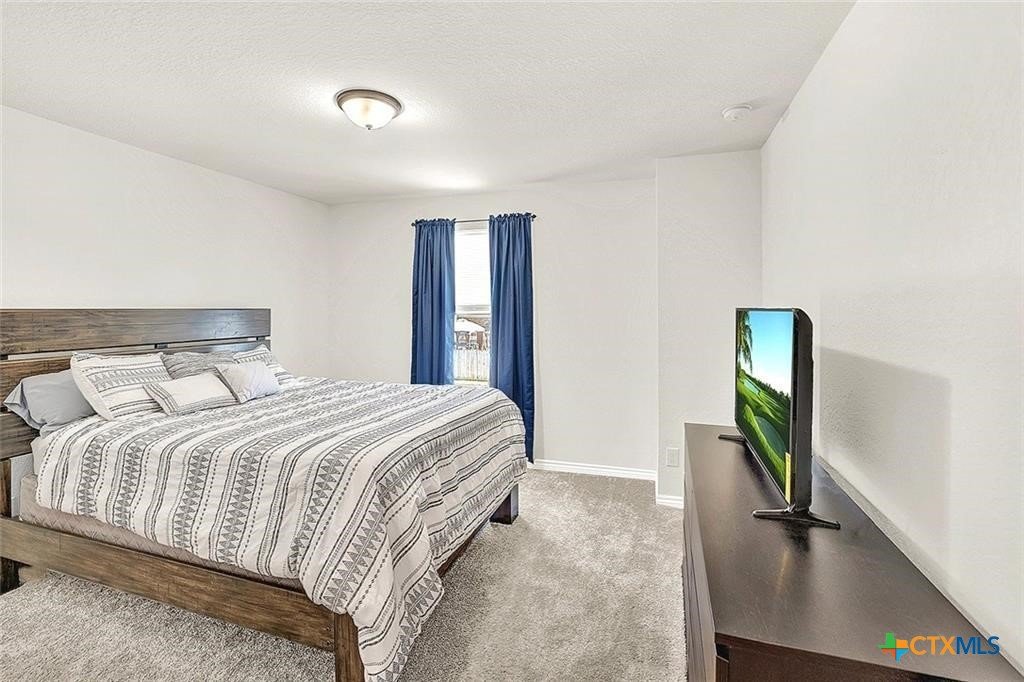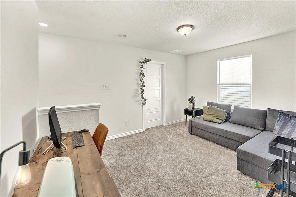 Attractive three bedroom, two bath home with two living areas and a big backyard with a covered patio. A beautiful kitchen features a breakfast bar with ample counter and cabinet space, as well as stainless appliances. A loft area upstairs serves as a second living area or flex space. The spacious primary suite has double vanities, as does the secondary bath. A laundry room upstairs close to all the bedrooms makes everyday life convenient. Recessed lighting, ceiling fans, and wood-look flooring throughout this open floor plan.