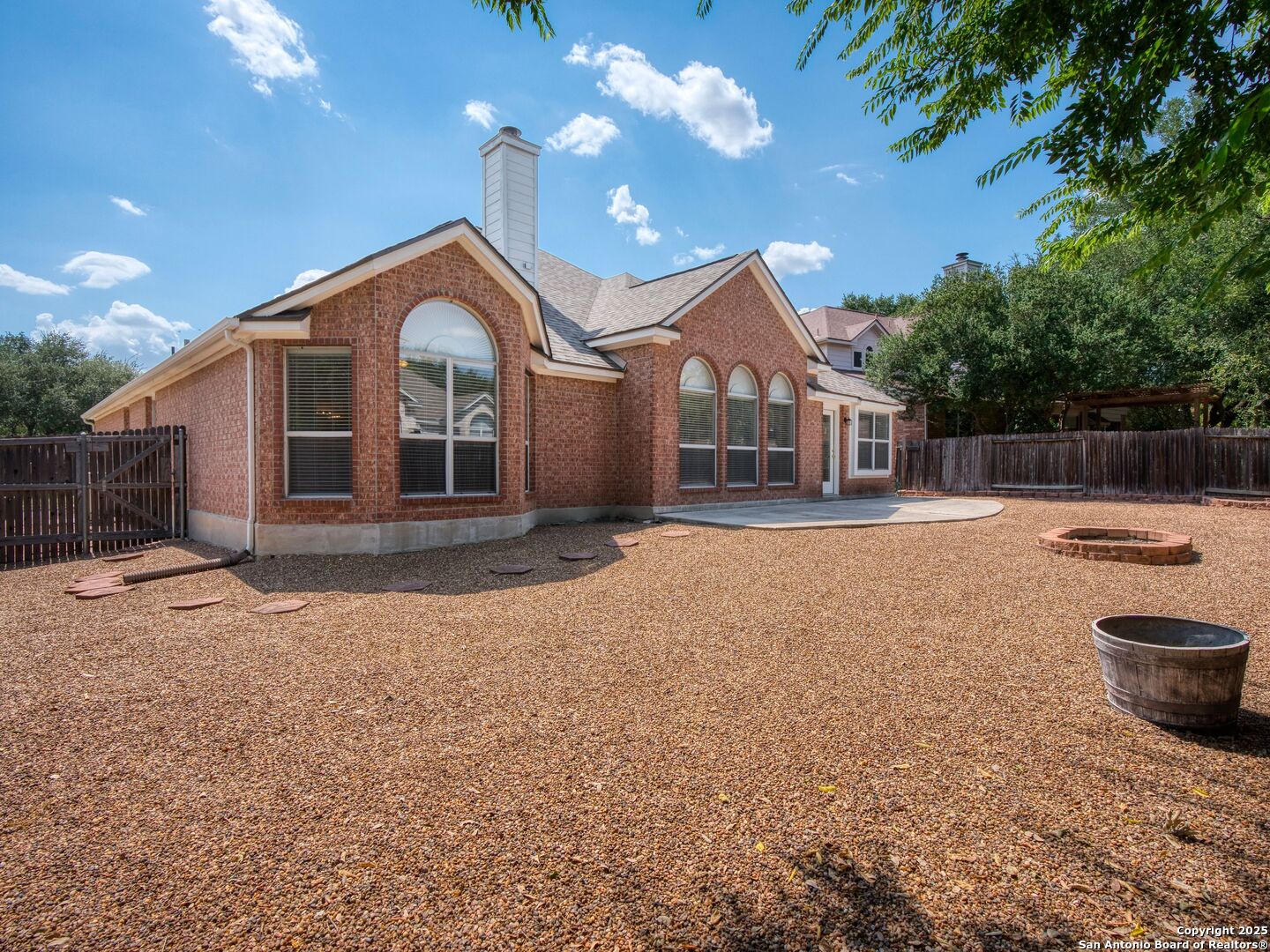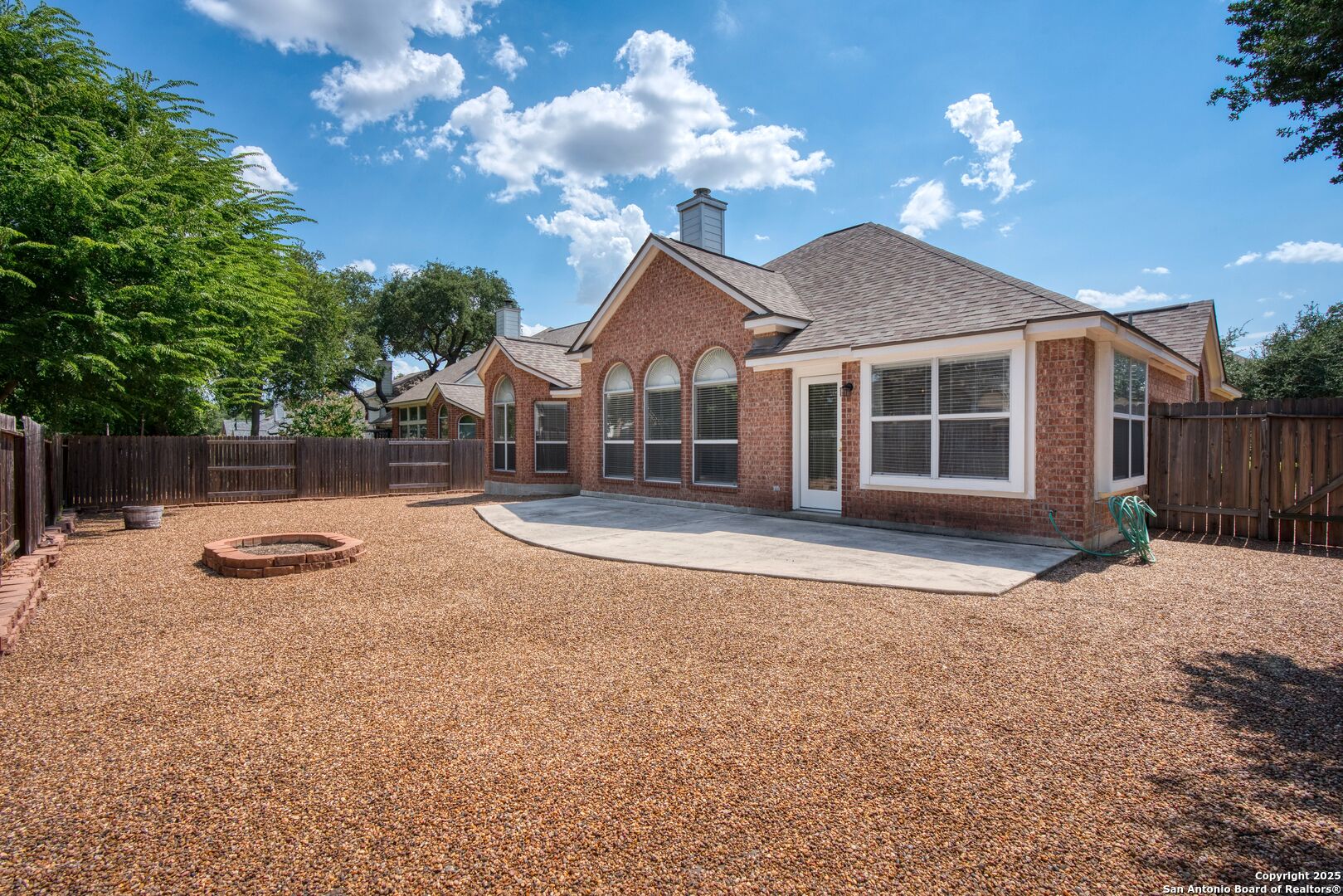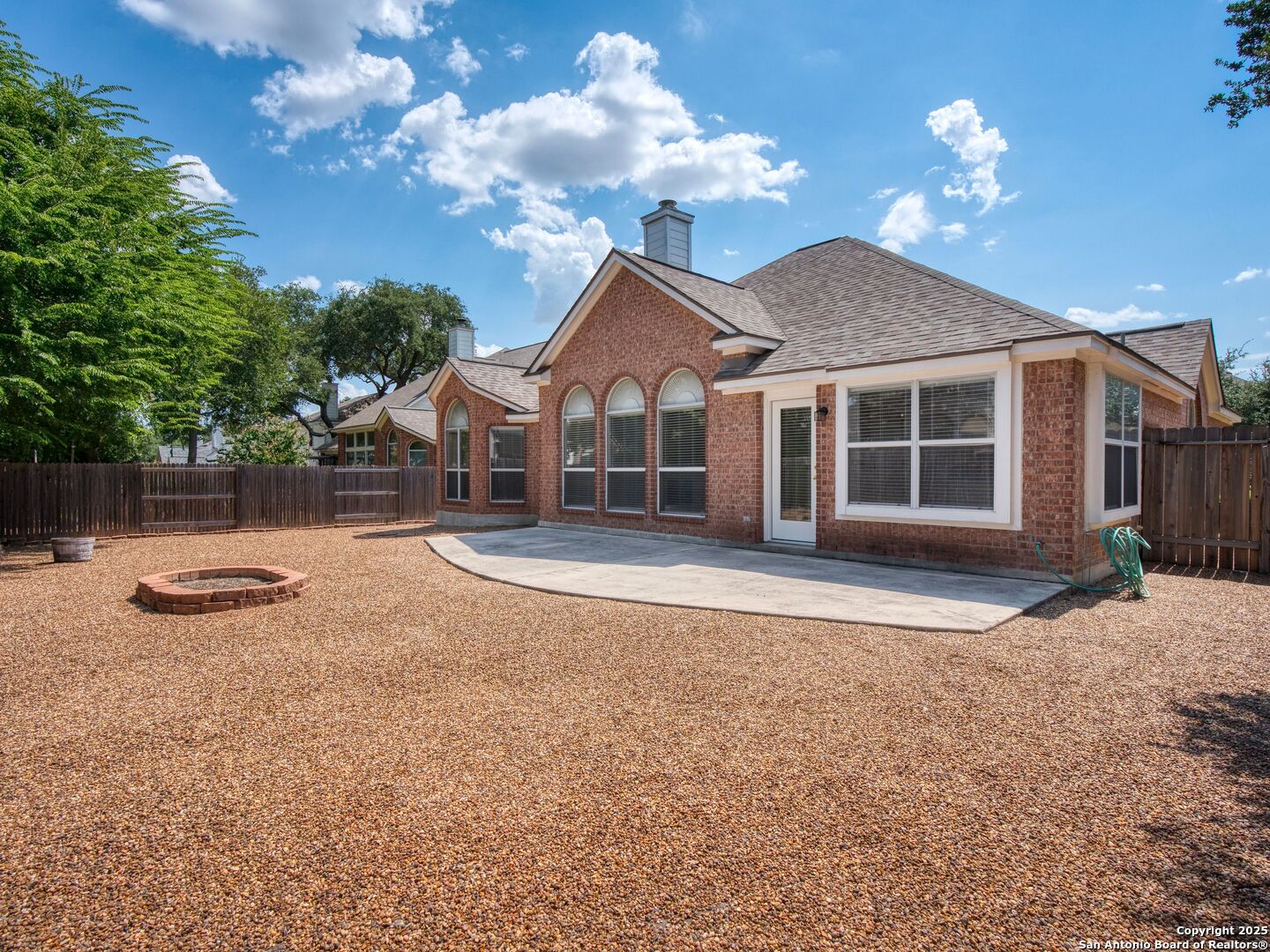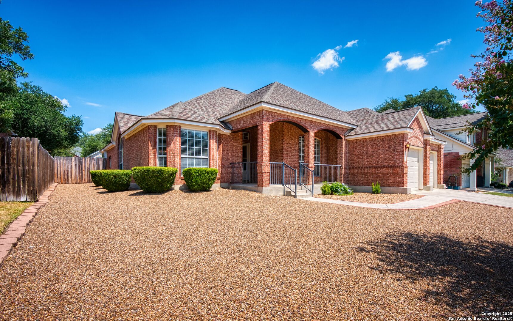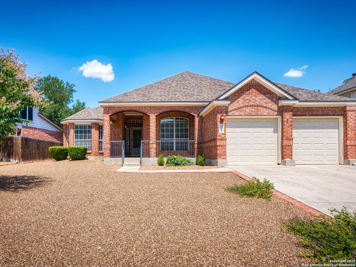 Meticulously maintained and move-in ready, this inviting single-story home sits on a beautifully landscaped lot with full xeriscaping for easy upkeep and year-round curb appeal. A classic brick exterior and charming covered porch set the tone for the well-cared-for interior, where abundant natural light fills each space and thoughtful details add a touch of warmth throughout. Inside, the open and airy layout features elegant arched transitions, high ceilings, and classic trim details. The spacious living room centers around a cozy fireplace and overlooks the private backyard, while the adjoining dining area is ideal for gatherings. The bright kitchen offers ample cabinet storage, solid-surface counters, a breakfast bar, and a casual dining nook with backyard views. The large primary suite provides a peaceful retreat with a vaulted ceiling and sitting area, along with a spa-style bath featuring dual vanities, a soaking tub, and a separate shower. Two additional bedrooms and a full bath complete the home's comfortable design, offering flexibility for guests, family, or a home office. This home has been exceptionally cared for, with thoughtful updates that include a new dishwasher (2025), new air conditioner (2024), new water heater (2021), and a new roof (2018)-providing peace of mind for years to come. Outside, the backyard is fully xeriscaped for effortless maintenance, creating a serene setting with a patio and fire pit area-perfect for relaxing evenings or weekend entertaining. Every inch of this property reflects care and pride of ownership, inside and out. Conveniently located near Randolph AFB, I-35, and excellent Schertz-Cibolo schools, this home offers the ideal combination of easy living and timeless appeal-all within minutes of shopping, dining, and parks.