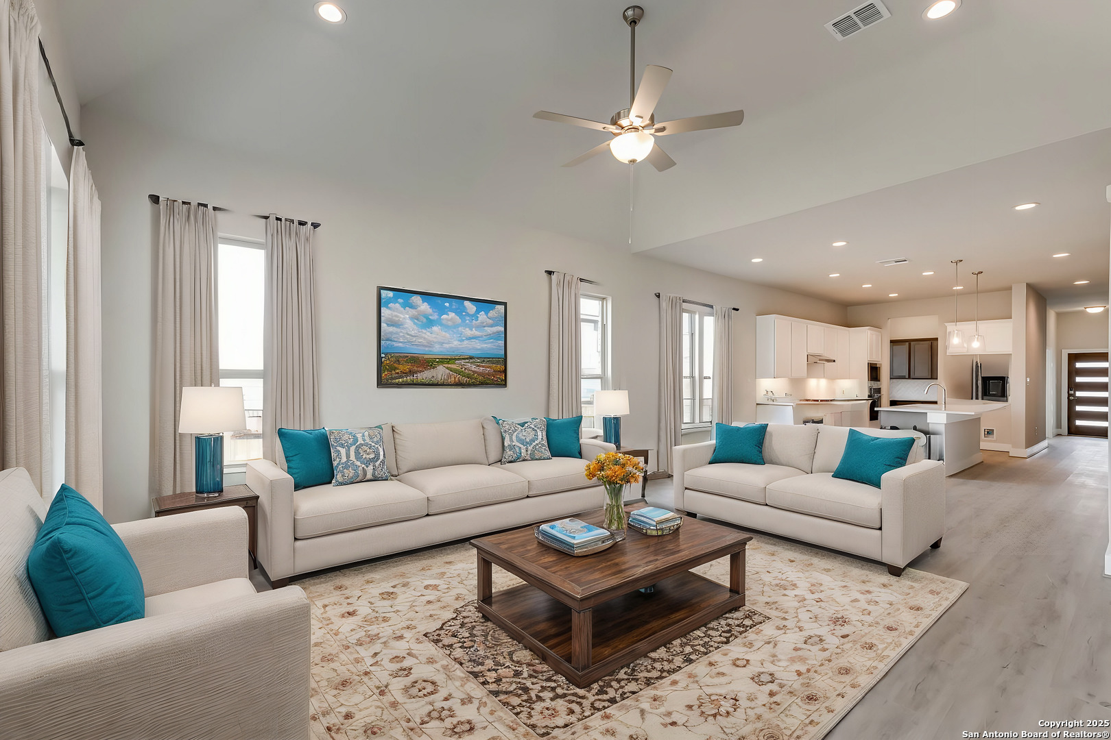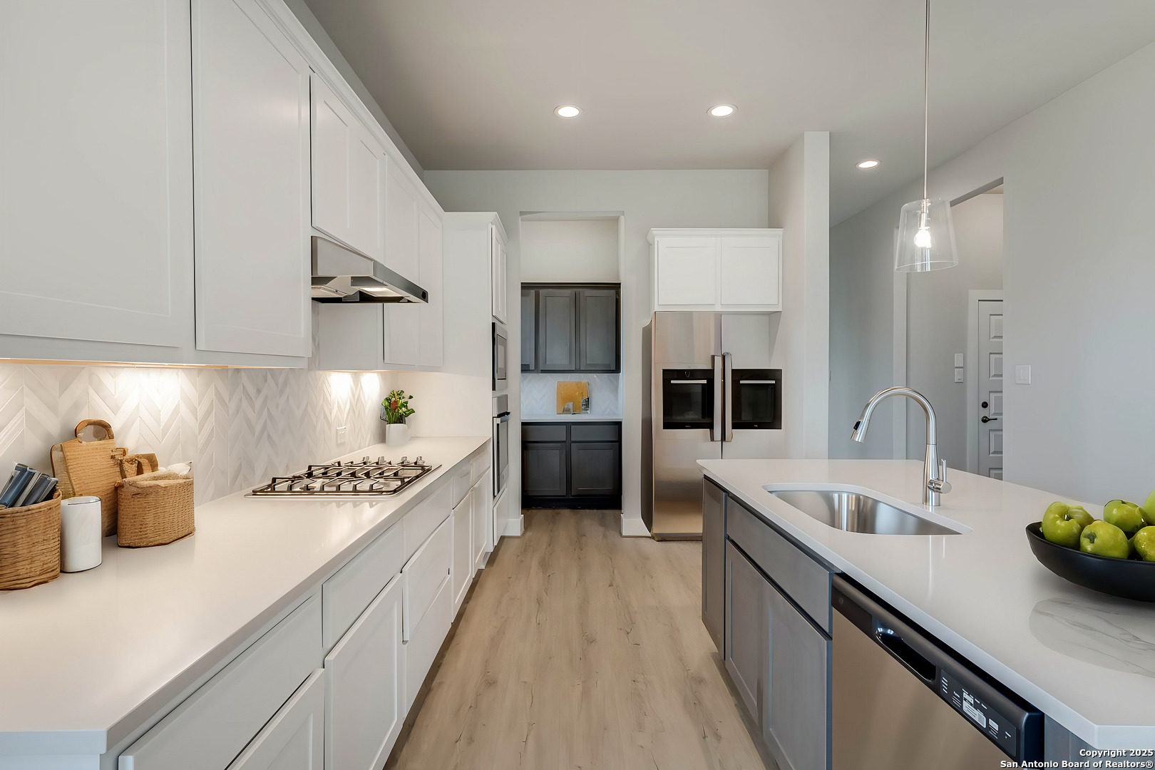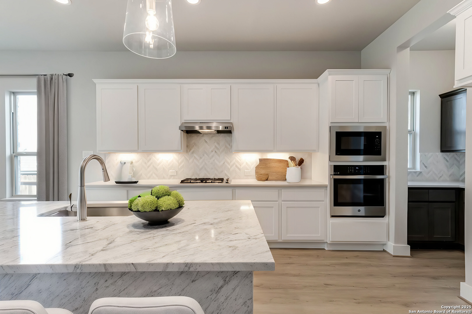 Nestled in the highly sought-after Cibolo Canyons community, this stunning single-story home blends modern design with thoughtful functionality. With 1,964 sq. ft. of well-planned living space, this 3-bedroom, 2-bathroom home is perfect for families or those looking to downsize. The open-concept floor plan features a dedicated study, a mud bench for added convenience, and a morning kitchen/coffee bar for your daily routine. The gourmet kitchen impresses with quartz countertops, custom cabinetry, under-counter lighting, and a large island with a built-in recycling center, plus two spacious walk-in pantries. The primary suite offers a serene escape, finished with a bay window and a luxurious ensuite bathroom with dual vanities, a walk-in shower, and a generous linen closet. High-end finishes, including upgraded wood flooring and tile, create a sophisticated ambiance throughout the home. Step outside to enjoy a fully sodded front and back yard, enclosed by a 6-foot privacy fence, and enhanced by a professional landscape package. The in-ground, programmable irrigation system ensures easy maintenance year-round. Located in Cibolo Canyons, this home offers the perfect balance of comfort, luxury, and convenience.