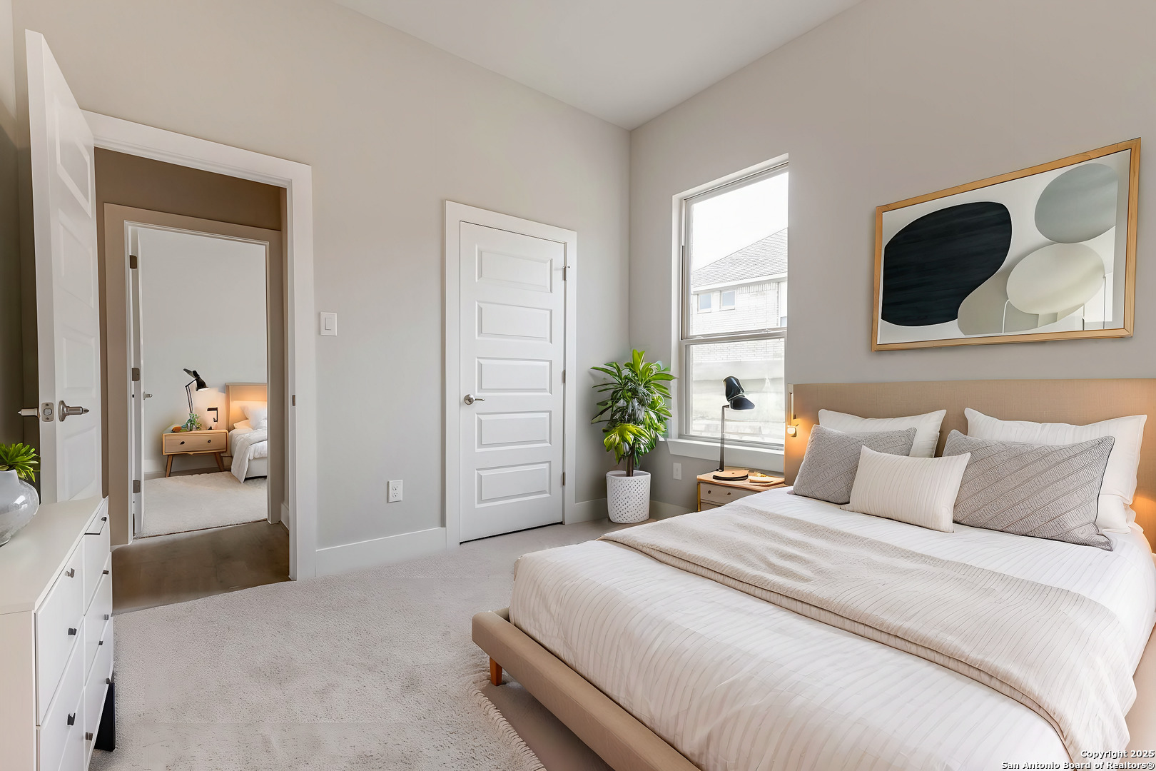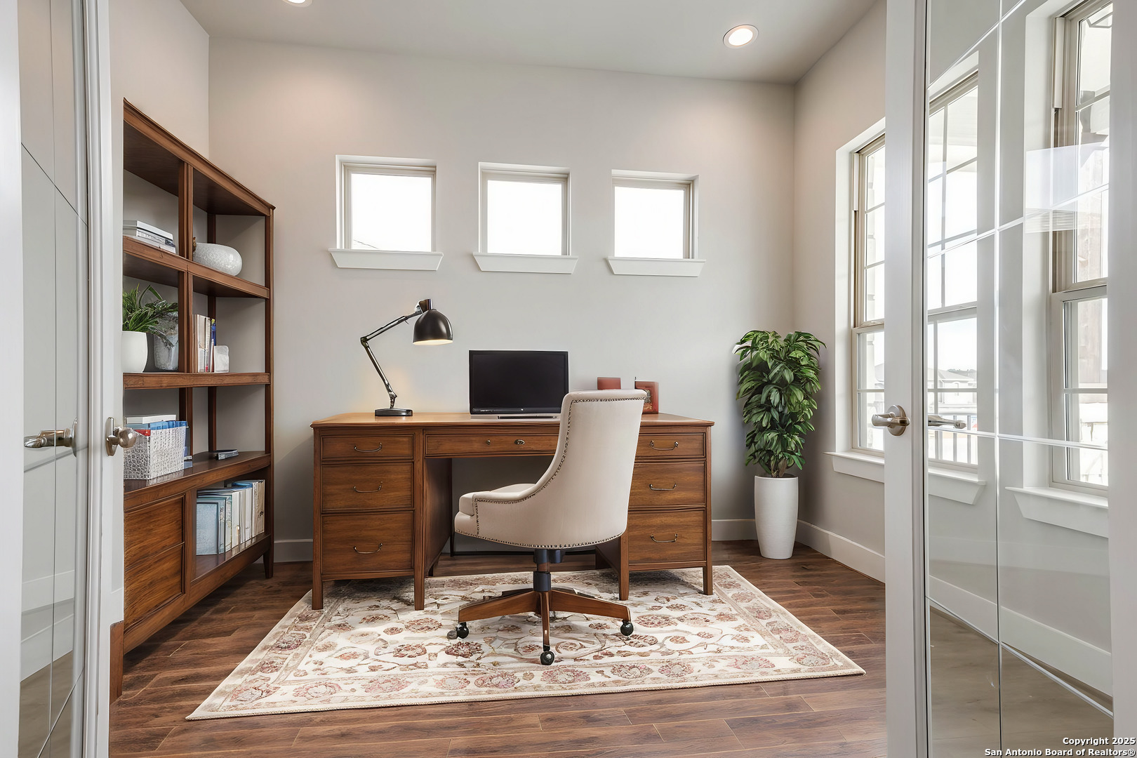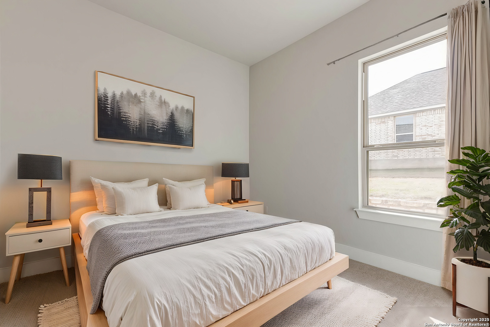 Nestled in the highly sought-after Cibolo Canyons community, this stunning single-story home blends modern design with thoughtful functionality. With 1,964 sq. ft. of well-planned living space, this 3-bedroom, 2-bathroom home is perfect for families or those looking to downsize. The open-concept floor plan features a dedicated study, a mud bench for added convenience, and a morning kitchen/coffee bar for your daily routine. The gourmet kitchen impresses with quartz countertops, custom cabinetry, under-counter lighting, and a large island with a built-in recycling center, plus two spacious walk-in pantries. The primary suite offers a serene escape, finished with a bay window and a luxurious ensuite bathroom with dual vanities, a walk-in shower, and a generous linen closet. High-end finishes, including upgraded wood flooring and tile, create a sophisticated ambiance throughout the home. Step outside to enjoy a fully sodded front and back yard, enclosed by a 6-foot privacy fence, and enhanced by a professional landscape package. The in-ground, programmable irrigation system ensures easy maintenance year-round. Located in Cibolo Canyons, this home offers the perfect balance of comfort, luxury, and convenience.