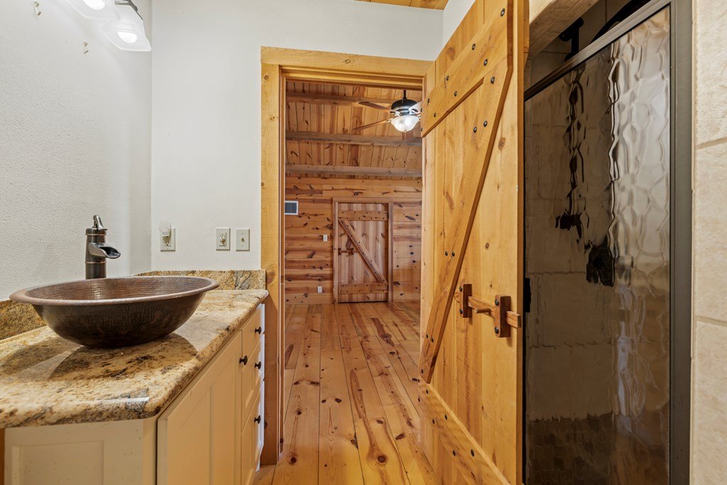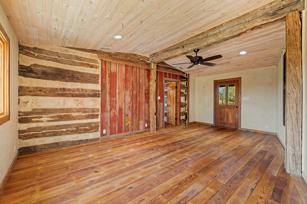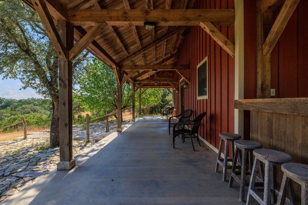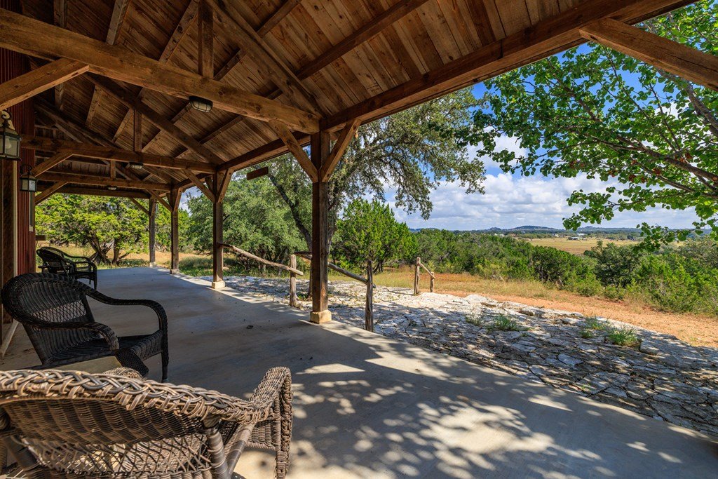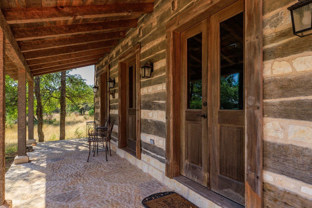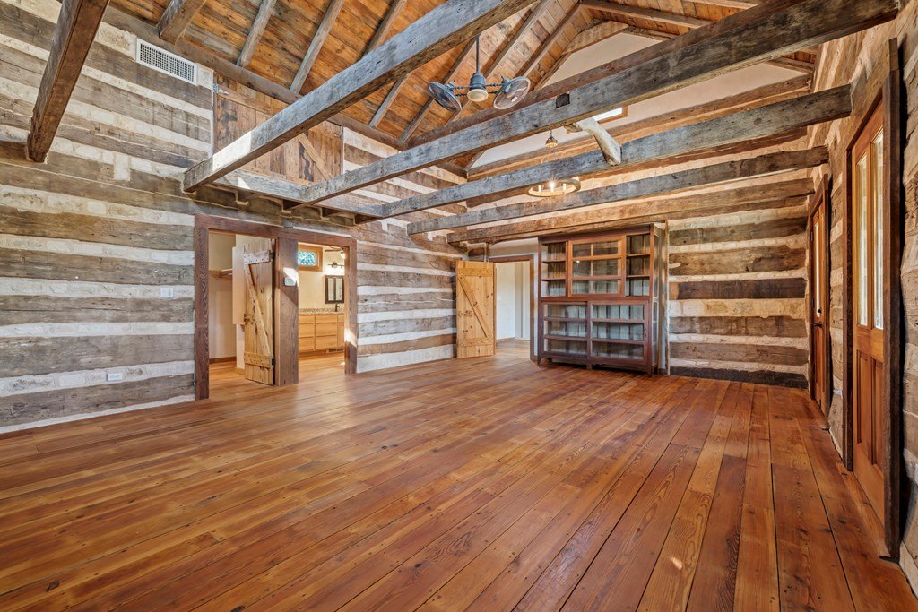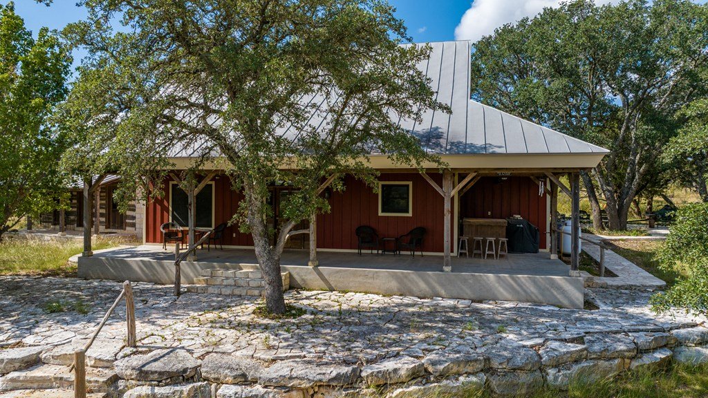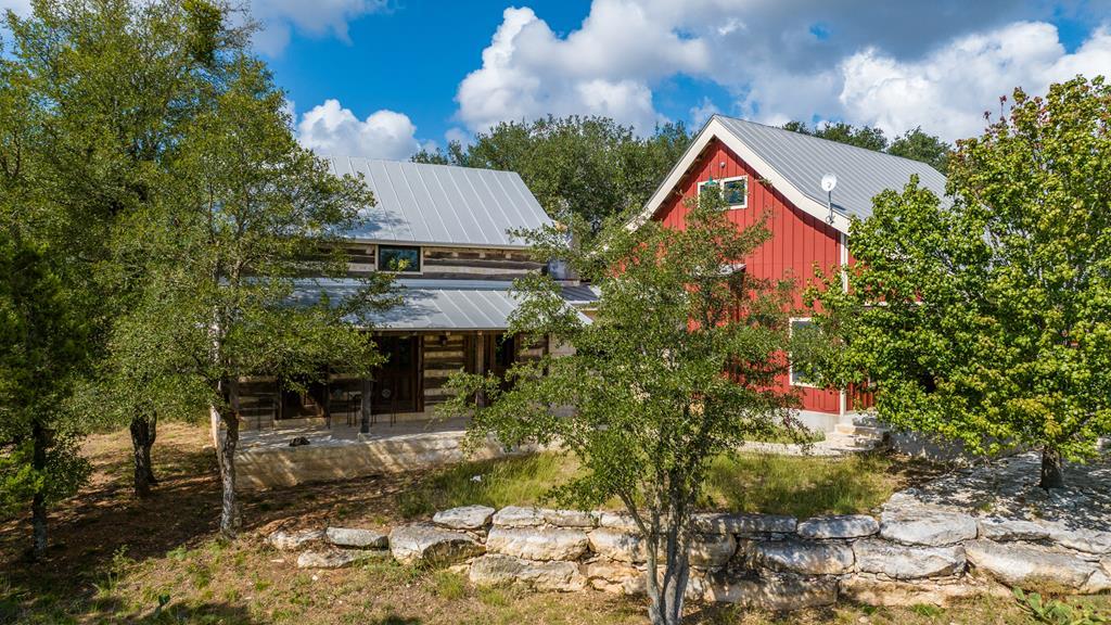 Tucked into the rolling hills of Fredericksburg, this one-of-a-kind Hill Country property blends rustic heritage with modern comfort. The property spans both sides of Live Oak Creek and captures sweeping views from its inviting front porch—perfect for morning coffee or sunset breezes. The main residence embraces cabin-style warmth with an open-concept living, dining, and kitchen area anchored by a stone fireplace. There are four bedrooms and four full baths, offering flexible space for family and guests. At the heart of the home, the primary suite tells a story all its own: a historic log cabin relocated from Kentucky, carefully reassembled on site to create an intimate retreat with a dedicated covered porch and access. The adjoining sitting room features reclaimed wood flooring salvaged from Fredericksburg's iconic Stroeher & Son building, adding a true sense of heritage. Outside, a relocated vintage water tank from a nearby ranch provides a sculptural focal point and nod to local history. The property also includes an exceptionally oversized metal barn with a second-story loft, as well as fully finished guest quarters—ideal as a game room, studio, or private apartment. A two-car covered carport connects seamlessly, offering easy access and sheltered parking. With a blend of craftsmanship, serenity, and wide-open space, only minutes from downtown, this home captures the soul of Fredericksburg's Hill Country lifestyle