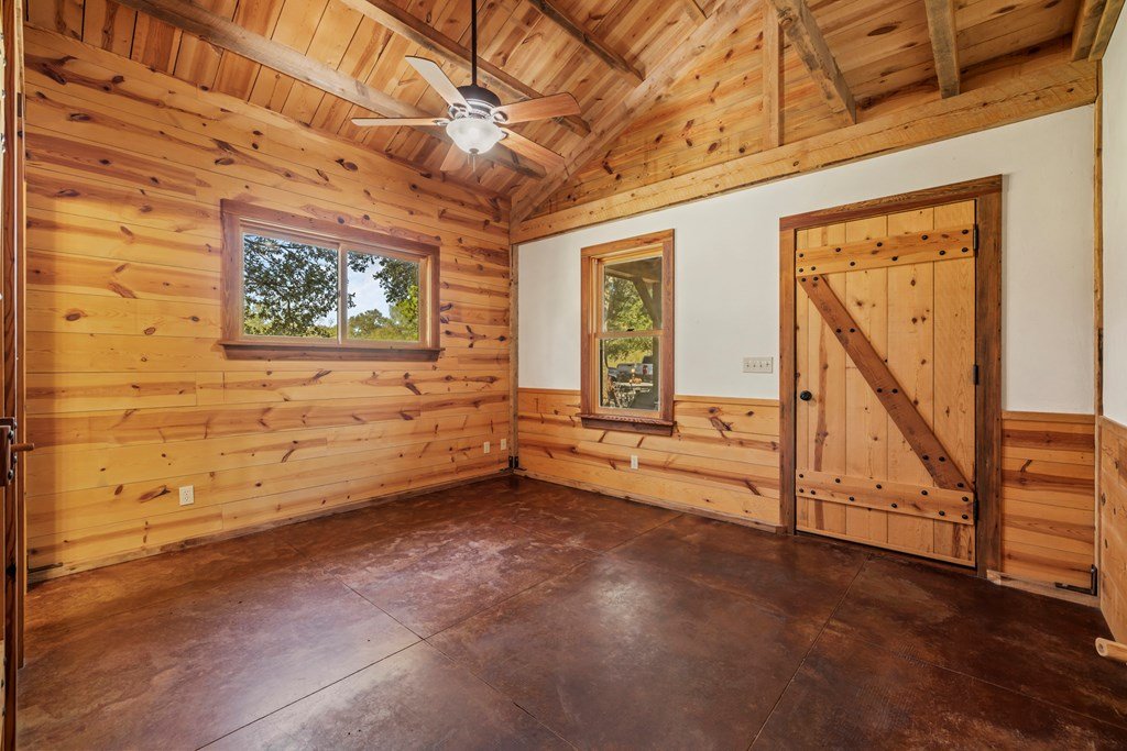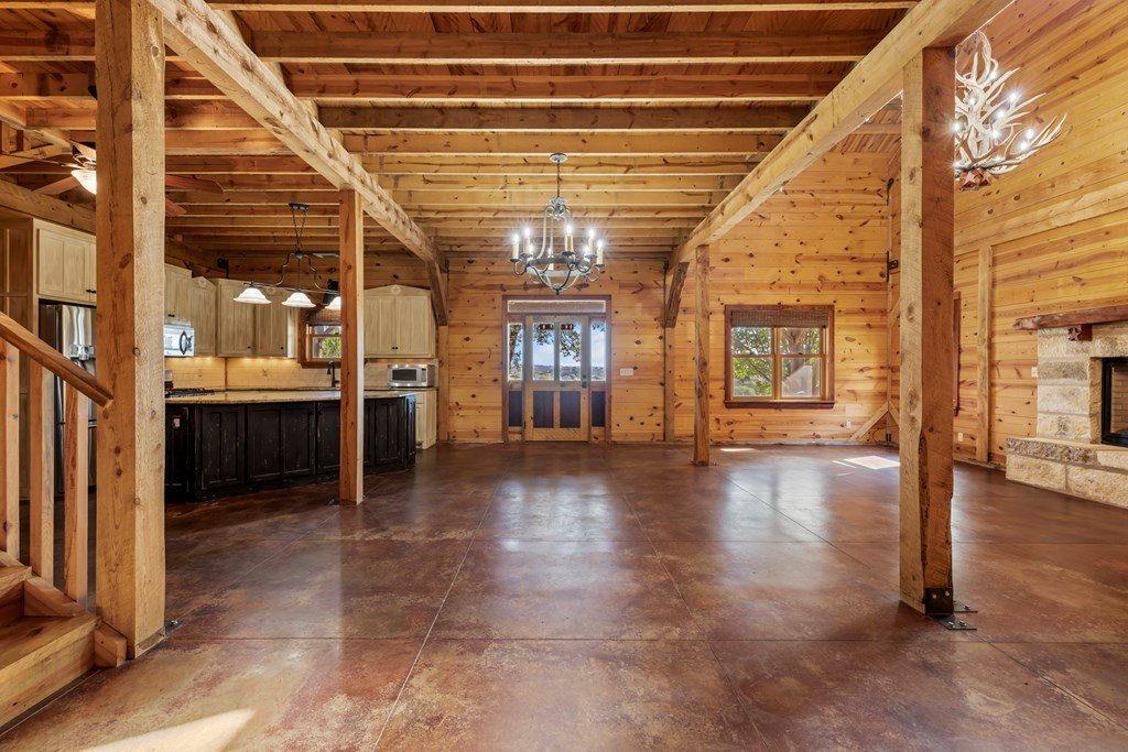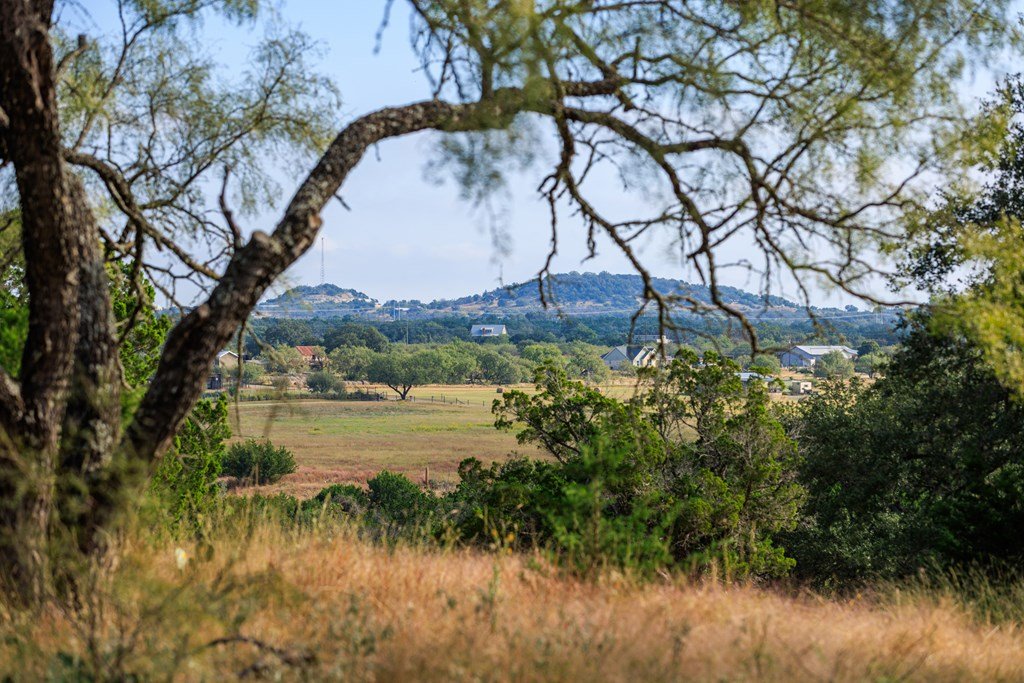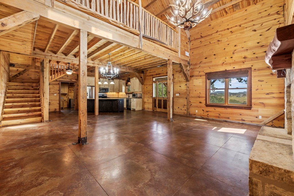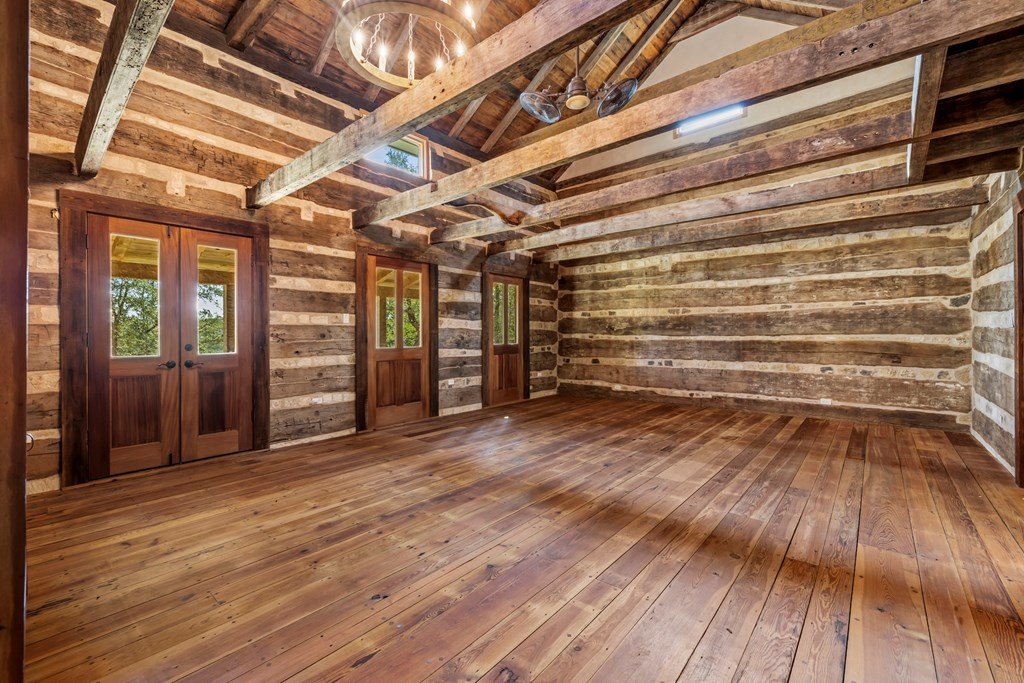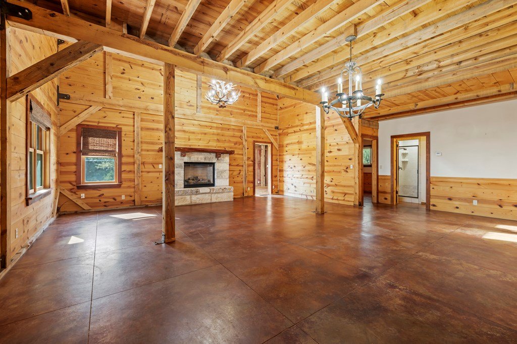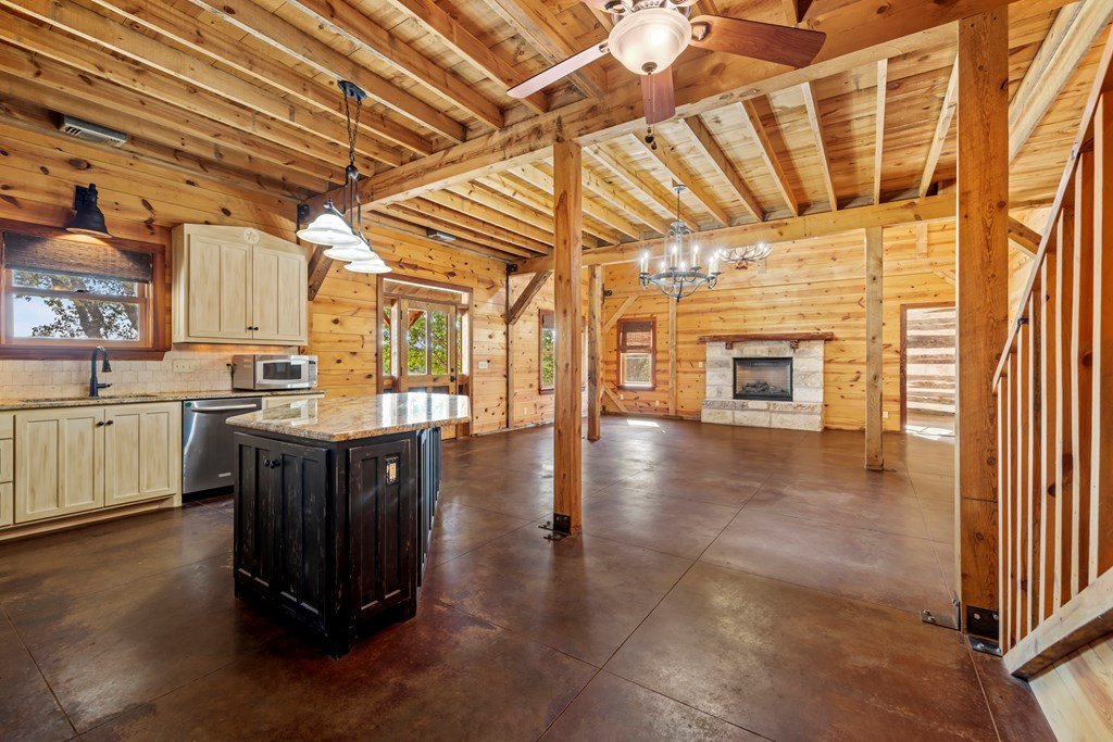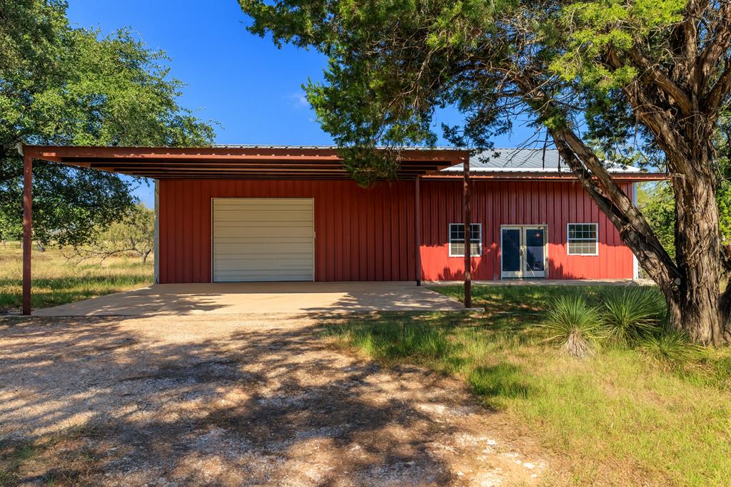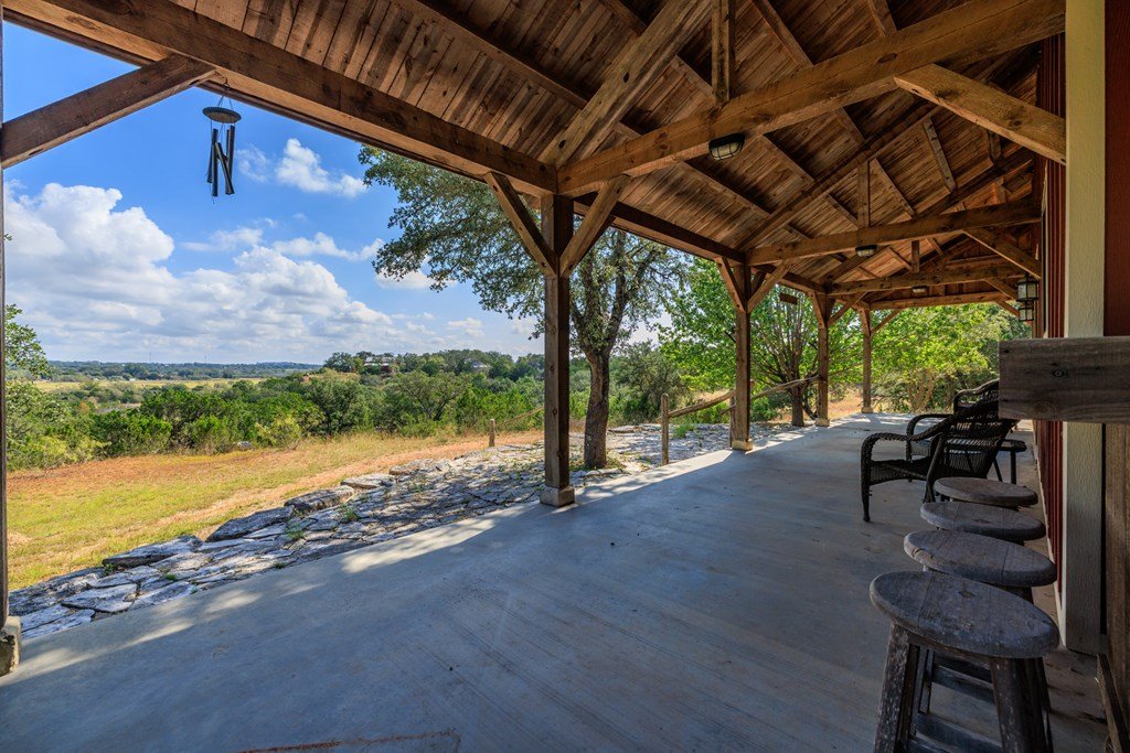 Tucked into the rolling hills of Fredericksburg, this one-of-a-kind Hill Country property blends rustic heritage with modern comfort. The property spans both sides of Live Oak Creek and captures sweeping views from its inviting front porch—perfect for morning coffee or sunset breezes. The main residence embraces cabin-style warmth with an open-concept living, dining, and kitchen area anchored by a stone fireplace. There are four bedrooms and four full baths, offering flexible space for family and guests. At the heart of the home, the primary suite tells a story all its own: a historic log cabin relocated from Kentucky, carefully reassembled on site to create an intimate retreat with a dedicated covered porch and access. The adjoining sitting room features reclaimed wood flooring salvaged from Fredericksburg's iconic Stroeher & Son building, adding a true sense of heritage. Outside, a relocated vintage water tank from a nearby ranch provides a sculptural focal point and nod to local history. The property also includes an exceptionally oversized metal barn with a second-story loft, as well as fully finished guest quarters—ideal as a game room, studio, or private apartment. A two-car covered carport connects seamlessly, offering easy access and sheltered parking. With a blend of craftsmanship, serenity, and wide-open space, only minutes from downtown, this home captures the soul of Fredericksburg's Hill Country lifestyle