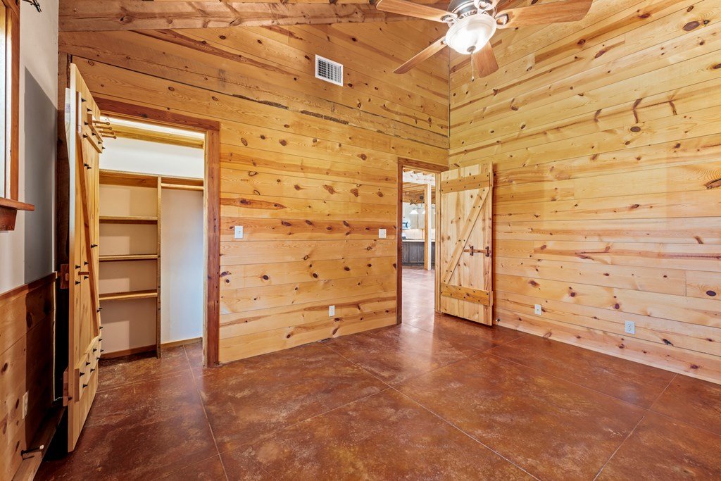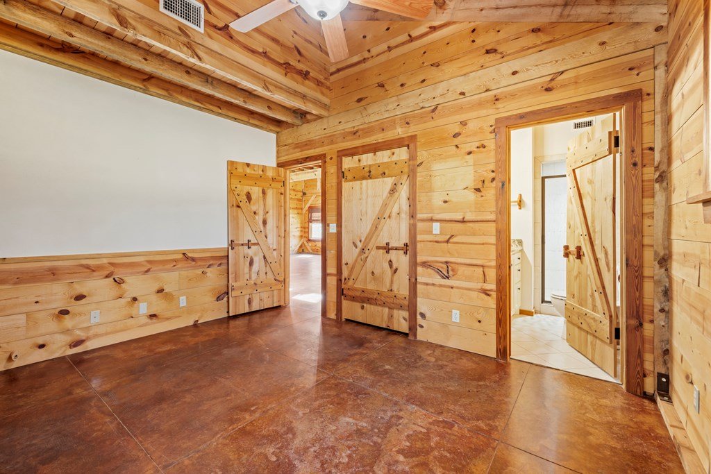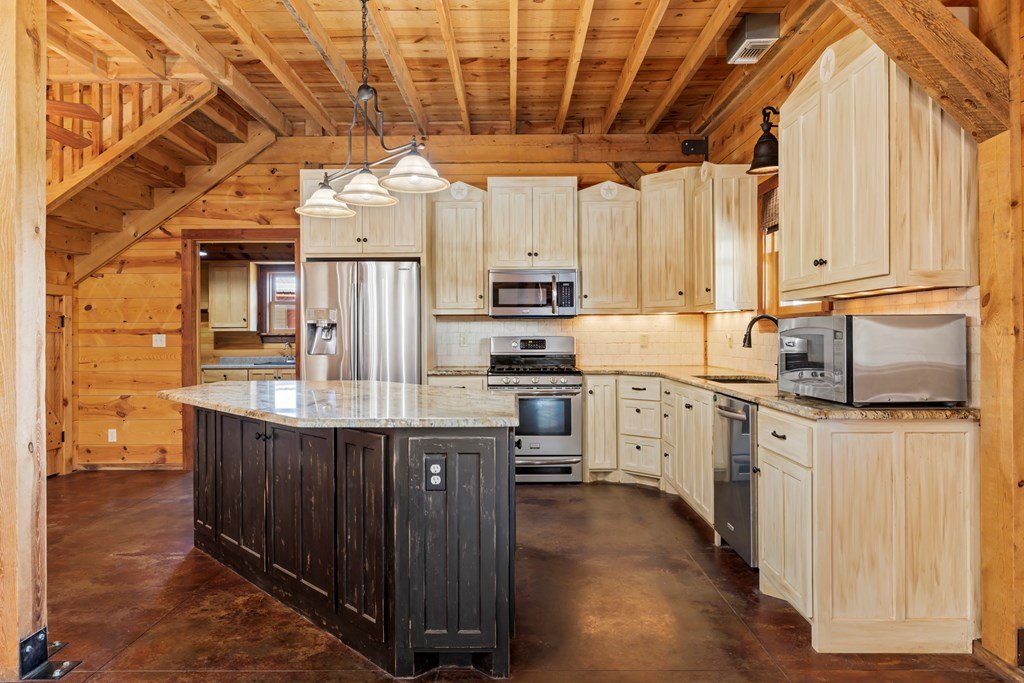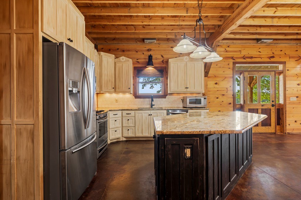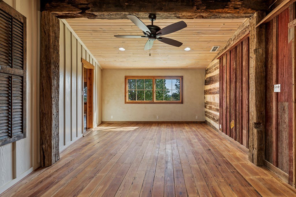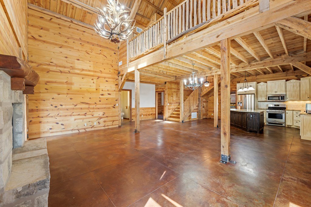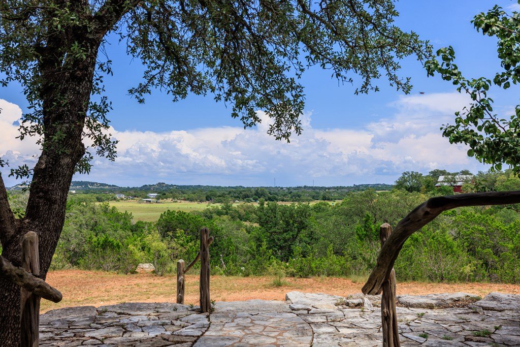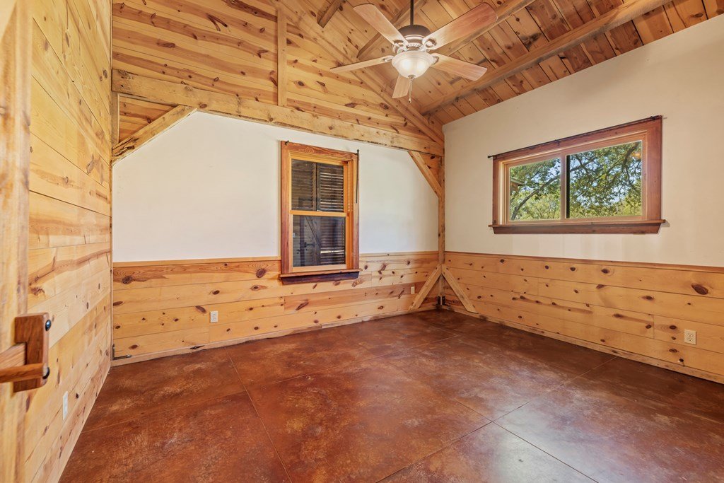 Tucked into the rolling hills of Fredericksburg, this one-of-a-kind Hill Country property blends rustic heritage with modern comfort. The property spans both sides of Live Oak Creek and captures sweeping views from its inviting front porch—perfect for morning coffee or sunset breezes. The main residence embraces cabin-style warmth with an open-concept living, dining, and kitchen area anchored by a stone fireplace. There are four bedrooms and four full baths, offering flexible space for family and guests. At the heart of the home, the primary suite tells a story all its own: a historic log cabin relocated from Kentucky, carefully reassembled on site to create an intimate retreat with a dedicated covered porch and access. The adjoining sitting room features reclaimed wood flooring salvaged from Fredericksburg's iconic Stroeher & Son building, adding a true sense of heritage. Outside, a relocated vintage water tank from a nearby ranch provides a sculptural focal point and nod to local history. The property also includes an exceptionally oversized metal barn with a second-story loft, as well as fully finished guest quarters—ideal as a game room, studio, or private apartment. A two-car covered carport connects seamlessly, offering easy access and sheltered parking. With a blend of craftsmanship, serenity, and wide-open space, only minutes from downtown, this home captures the soul of Fredericksburg's Hill Country lifestyle