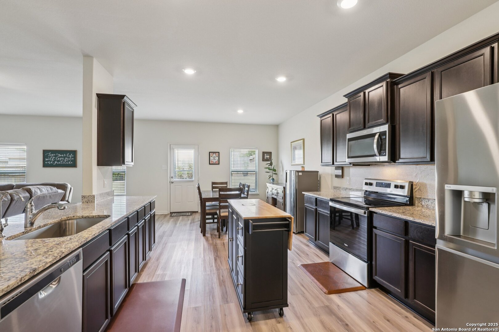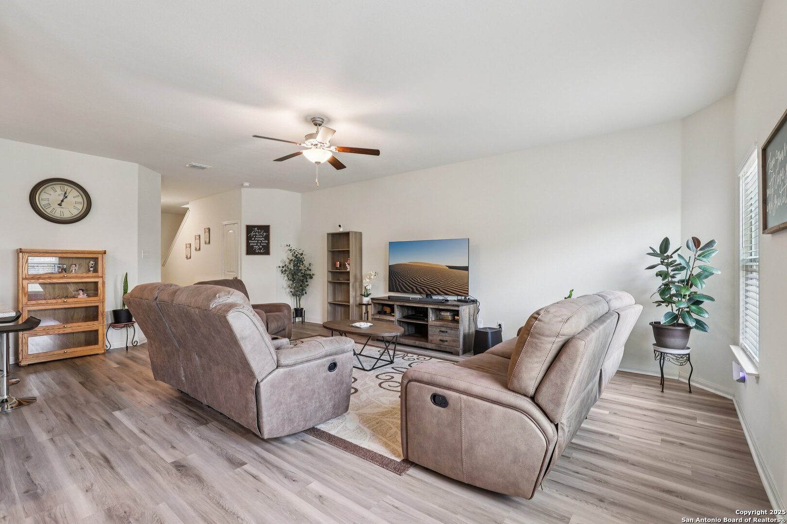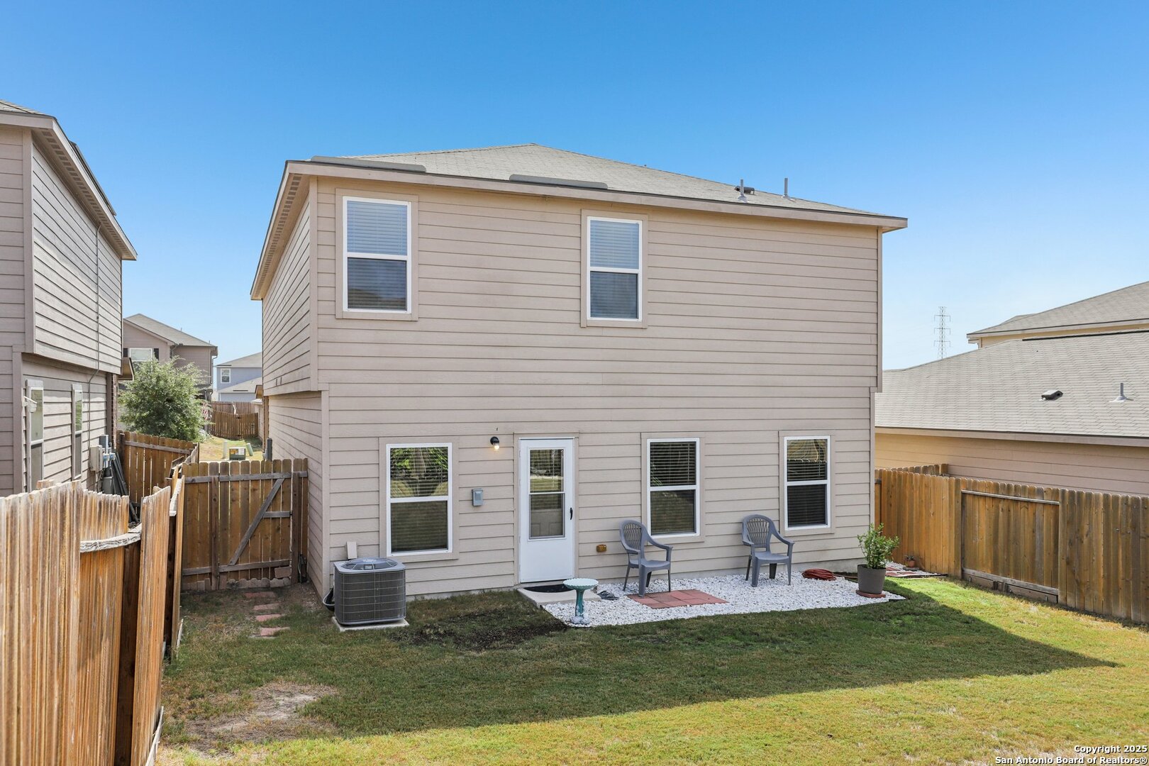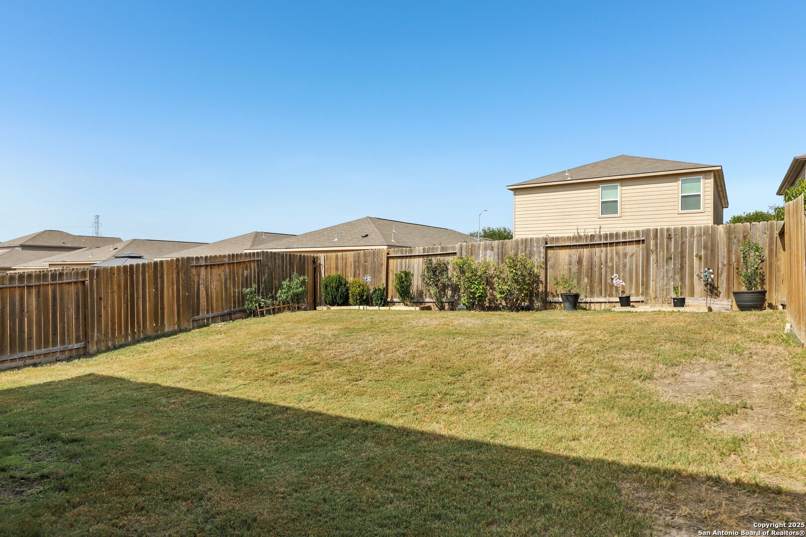 This beautifully maintained two-story home offers the perfect blend of comfort and convenience. Step inside to find an open floor plan with two spacious living areas and luxury vinyl plank flooring with no carpet on the first floor-ideal for easy maintenance. The kitchen features dark cabinetry, granite counters, a breakfast bar, and blinds on all windows, creating a warm and inviting space for everyday living or entertaining. Upstairs, you'll find four generously sized bedrooms, including a large primary suite with a separate shower and garden tub. The home sits on an elevated lot, giving the backyard-lined with bushes-a private, peaceful feel. Additional highlights include a spring door on both front and back entries, a water filtration system, and a garage door with decorative hardware. Located in a community with a splash pad and park, and offering quick access to I-35, this home makes travel to Austin or San Antonio effortless. With its thoughtful upgrades and functional layout, this home delivers exceptional value, space, and location-all in one.