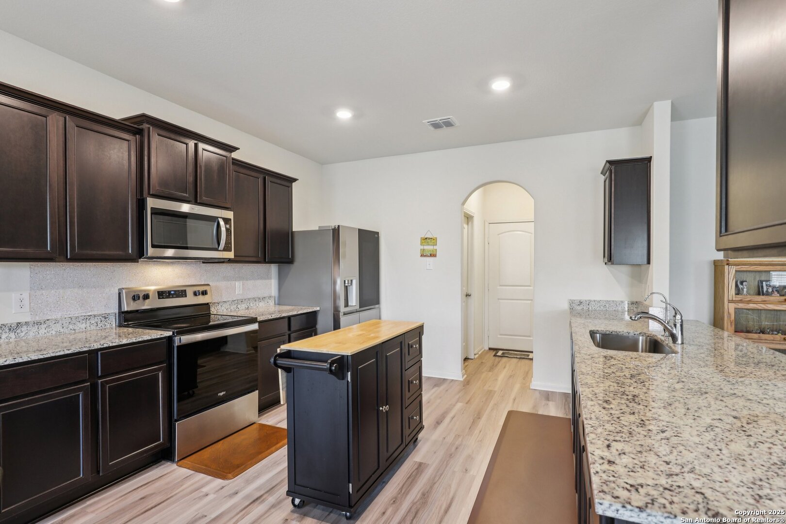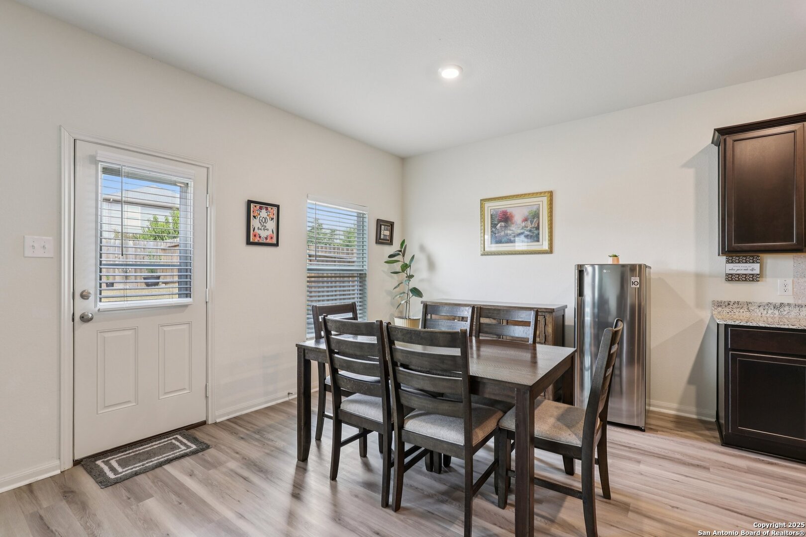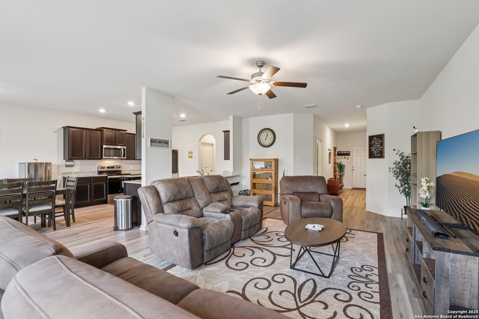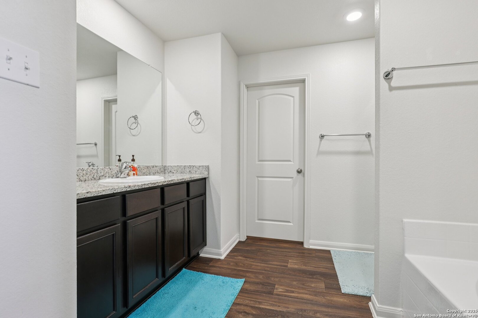 This beautifully maintained two-story home offers the perfect blend of comfort and convenience. Step inside to find an open floor plan with two spacious living areas and luxury vinyl plank flooring with no carpet on the first floor-ideal for easy maintenance. The kitchen features dark cabinetry, granite counters, a breakfast bar, and blinds on all windows, creating a warm and inviting space for everyday living or entertaining. Upstairs, you'll find four generously sized bedrooms, including a large primary suite with a separate shower and garden tub. The home sits on an elevated lot, giving the backyard-lined with bushes-a private, peaceful feel. Additional highlights include a spring door on both front and back entries, a water filtration system, and a garage door with decorative hardware. Located in a community with a splash pad and park, and offering quick access to I-35, this home makes travel to Austin or San Antonio effortless. With its thoughtful upgrades and functional layout, this home delivers exceptional value, space, and location-all in one.