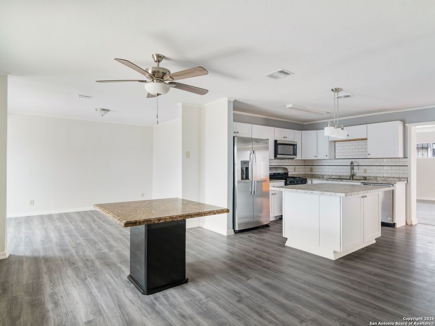 LOCATION, LOCATION! A unique opportunity to own an updated home with an open floor plan in a prime area. Step into a spacious foyer that welcomes you into the grand family room featuring a cozy fireplace. The updated kitchen is a must-see, offering solid-surface countertops, updated cabinetry, stainless steel appliances, and an easy flow into the inviting dining area-perfect for everyday living and entertaining. The primary suite includes an updated, spa-like bath, along with two additional bedrooms and a full secondary bath. A utility room with extra storage is conveniently located inside the home. Foundation work has been completed, with too many updates to list. Ideally located close to Fort Sam Houston and Randolph AFB, and just minutes from Downtown San Antonio and the airport.