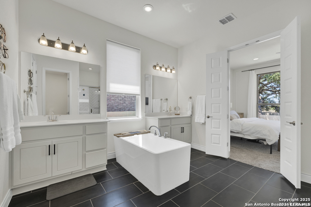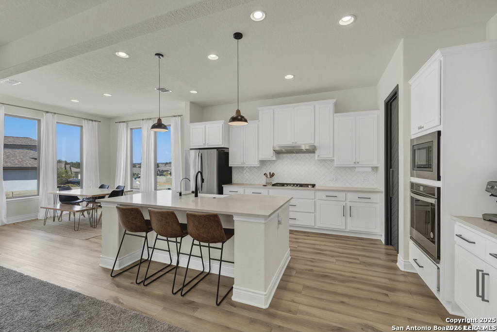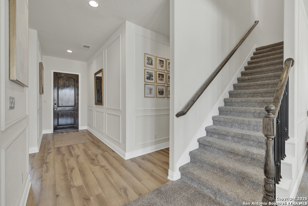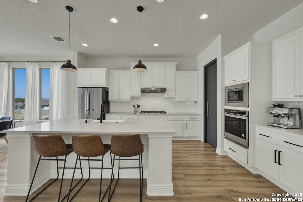 Welcome home to this lovely two-story home built by Monticello Custom Homes, offering 4 bedrooms, 2.5 bathrooms, and exceptional craftsmanship throughout. Situated on a desirable corner lot in the highly sought-after Vintage Oaks community, this residence blends Hill Country charm with modern luxury. Inside, the home features an open-concept floor plan with seamless flow for both entertaining and everyday living. The chef's kitchen includes a gas cooktop, farmhouse sink, built-in range and microwave, custom woodwork, and ample storage, while the adjoining dining space creates a perfect gathering spot for family and friends. The spacious primary suite is a true retreat, complete with a garden tub, dual vanities, and a generous walk-in closet. Additional highlights include a private office and an upstairs family room. The outdoor living spaces are equally impressive; A covered patio, privacy fence, and custom-built entertaining area make this backyard ideal for hosting. Four raised planting beds with custom irrigation provide the perfect space for gardening, while the three-car garage offers epoxy flooring, plenty of room for vehicles, storage, or a workshop. Beyond the home, Vintage Oaks offers a lifestyle unlike any other, with access to four resort-style swimming pools, a lazy river, a state-of-the-art fitness center, tennis, pickleball, volleyball, and basketball courts, as well as soccer and baseball fields, playgrounds, and picnic areas shaded by century-old oak trees. Miles of hiking and biking trails wind through the community, and a Tuscan style clubhouse hosts year-round events and gatherings. Adding to the appeal, the property is surrounded by natural beauty with scenic views and local wildlife including deer and native birds, creating a serene and private setting. This property presents a rare opportunity to enjoy a luxurious lifestyle immersed in nature, all within one of the most desirable communities in the Texas Hill Country. Don't miss your chance to make this exceptional home your own slice of paradise in Vintage Oaks