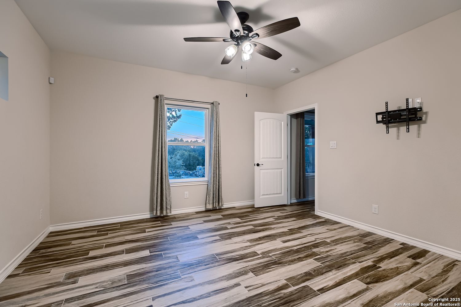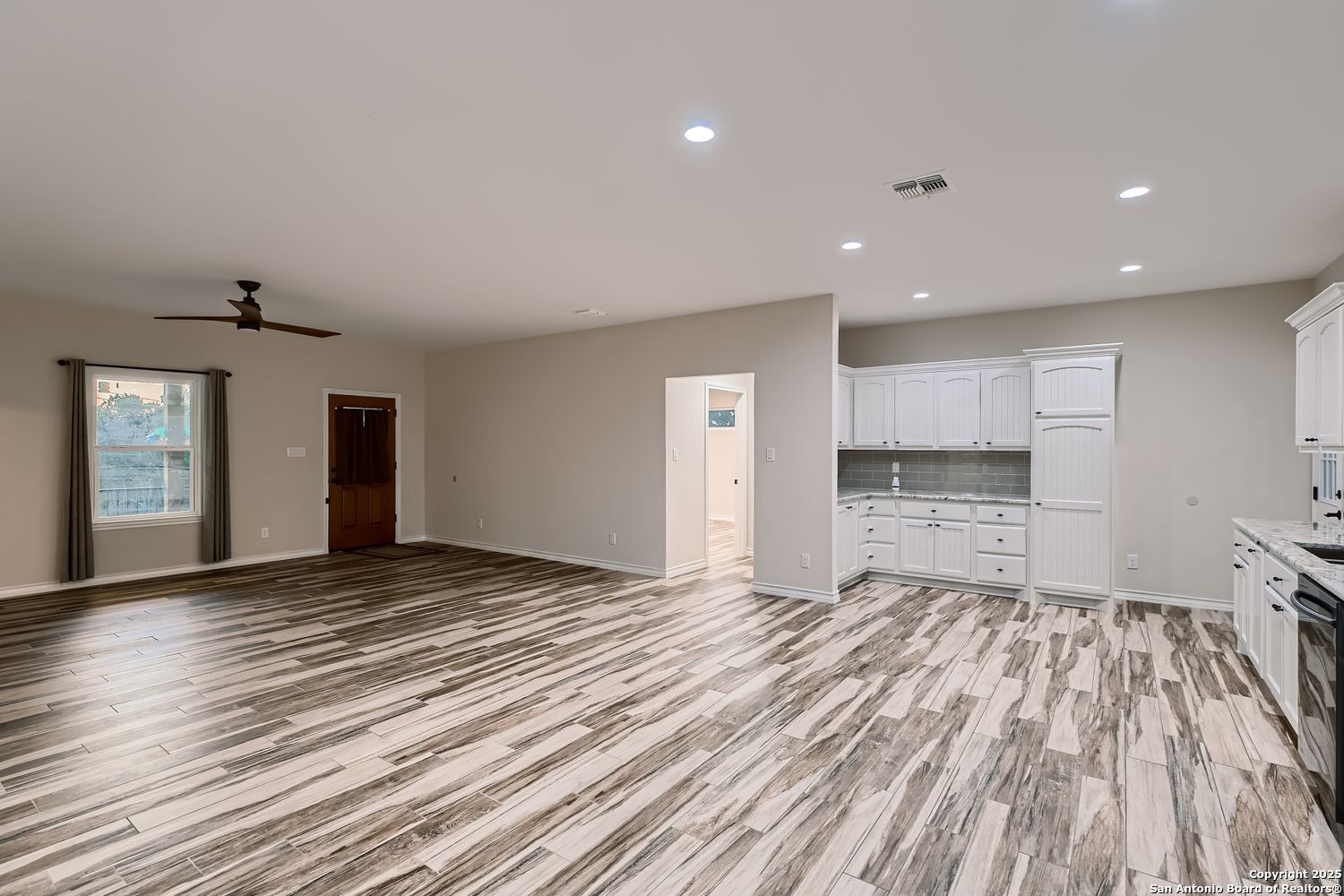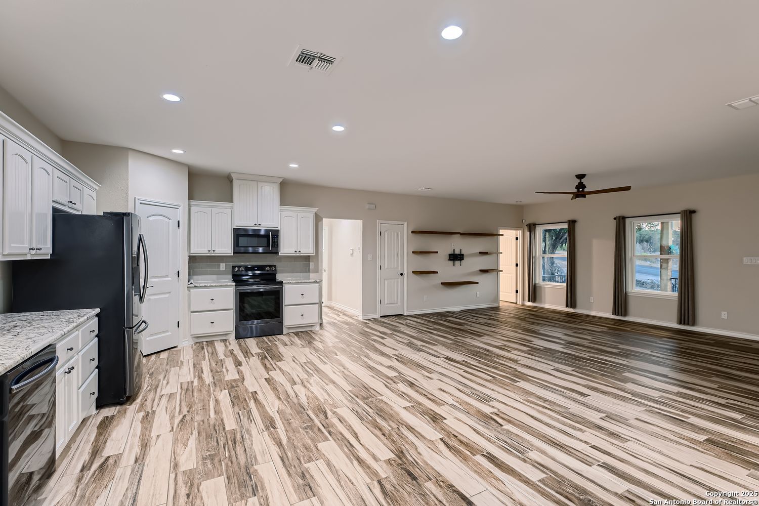Welcome to this custom built beautiful single-story home featuring a welcoming covered front porch-perfect for enjoying your morning coffee. Inside, you'll find an open-concept layout that seamlessly connects the kitchen, living, and dining areas, creating an ideal space for both relaxing and entertaining. The kitchen offers plenty of counter space, abundant cabinetry, and a great flow into the main living area. The spacious primary bedroom includes a private full bath with a double vanity and a walk-in shower. Large garage space big enough for your car, golf cart and plenty of room left for storage. Step outside to a large open backyard with a deck overlooking the hill country, perfect for gatherings, grilling, or simply enjoying the outdoors. This inviting home combines comfort, function, and charm-all in one level of easy living. No HOA and easy access to concert venues, river and shopping.