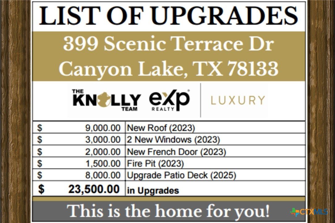 OVER $23,500 IN RECENT UPGRADES! POSSIBLE SELLER FINANCING. Former STR earning $199/night and up to $4K/mo. Welcome to 399 Scenic Terrace Dr, a one-of-a-kind Hill Country retreat with character, history, and incredible potential just minutes from beautiful Canyon Lake. This property began as a manufactured home and was later expanded and partially converted to add valuable living space and custom touches throughout. Set on a peaceful 0.23-acre lot with mature trees and a partial view of the lake from the back deck, it’s the perfect spot for relaxing, entertaining, or enjoying the lake lifestyle. THIS PROPERTY NEEDS SOME RENOVATION/TLC - AND HERE'S WHY: When the current owner purchased the property in 2021, he completely transformed it into a warm, rustic-style cabin filled with antique furnishings and charm. As an Airbnb, it became a guest favorite, earning 4.6-star ratings and generating up to $4,000 per month at $199 per night. Guests loved the quiet setting, the proximity to the water, and the cozy, inviting feel of the space. When the owner relocated to Miami for a new CFO position, long-distance hosting became difficult, so he rented the home to a long-term tenant who unfortunately left it in need of some TLC. The home is now being sold AS-IS and needs mostly cosmetic updates such as flooring, interior paint, and HVAC repair or replacement, but the structure is solid and many major improvements have already been completed, including a new roof, two new windows, a new French door, a fire pit, and a rebuilt patio deck—more than $20,000 in recent upgrades. With its strong bones, partial lake view, and proven short-term rental success, this home offers an incredible opportunity for investors, flippers, or DIY buyers looking for a great deal near Canyon Lake. Update it as a weekend getaway, or bring it back as a profitable Airbnb. Don’t miss this chance to own a unique lake-area property with a great story and a bright future.
