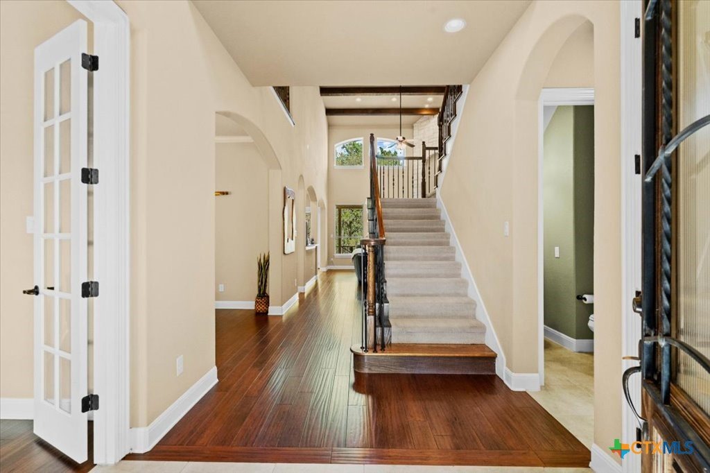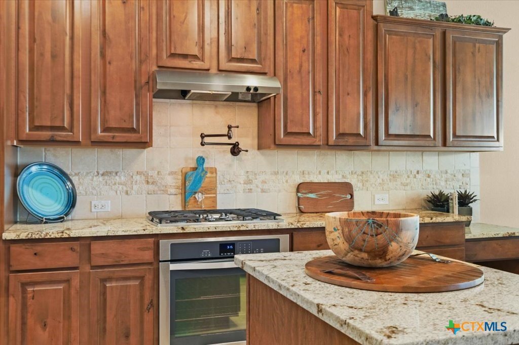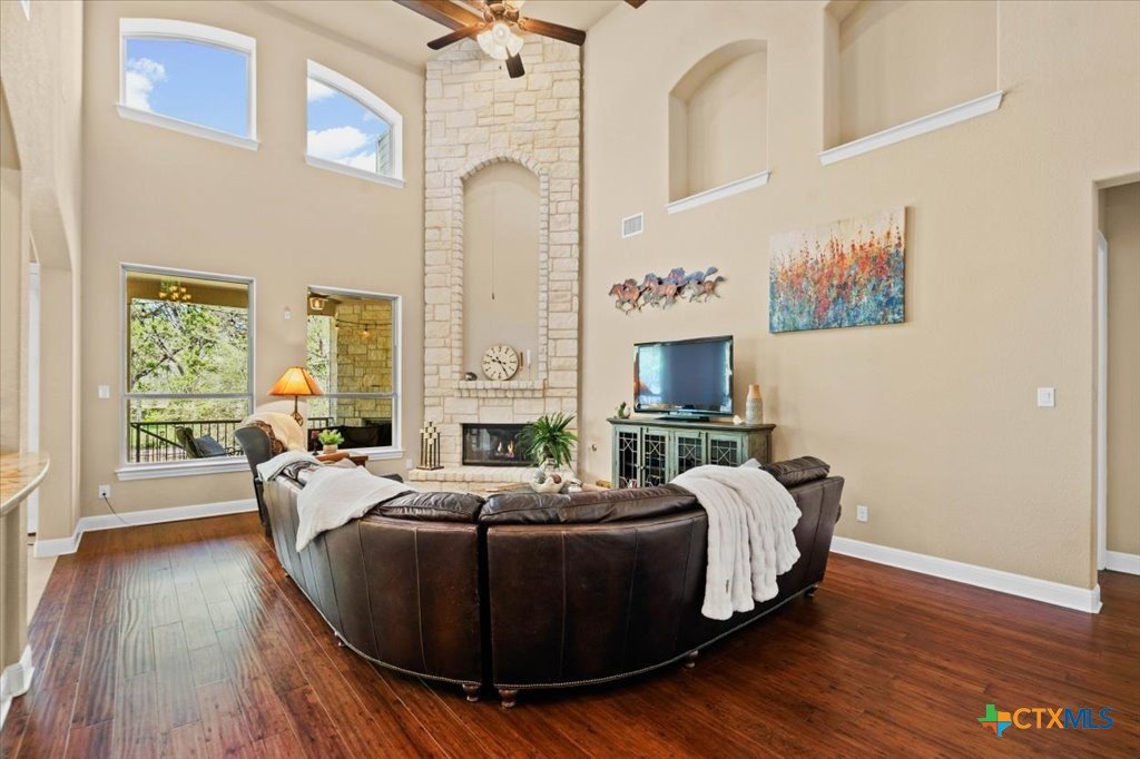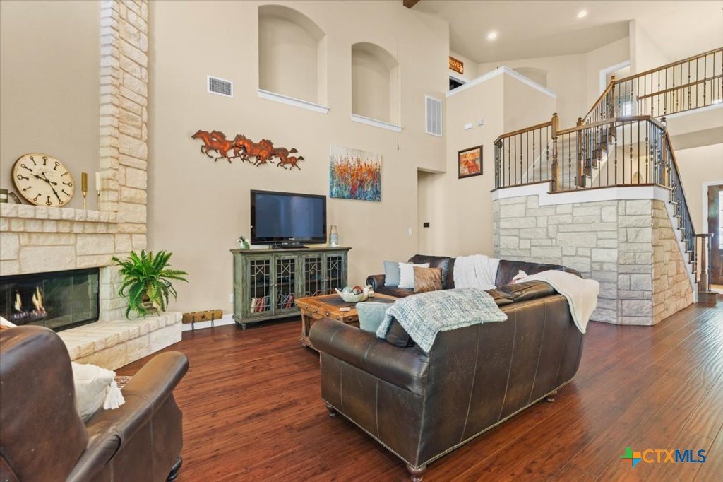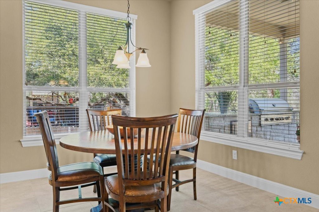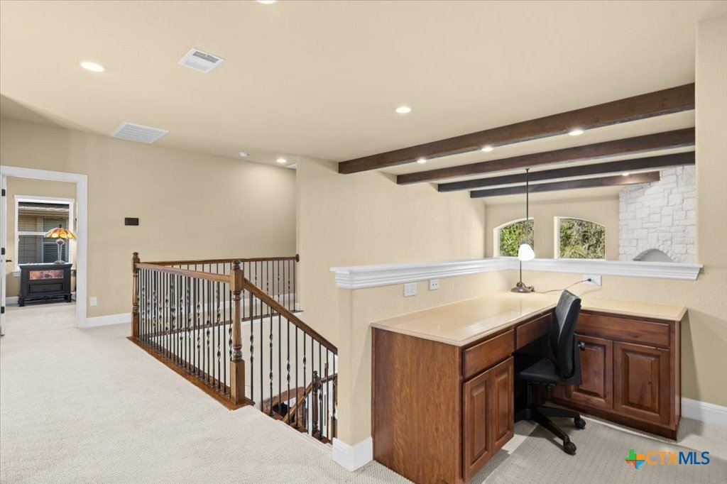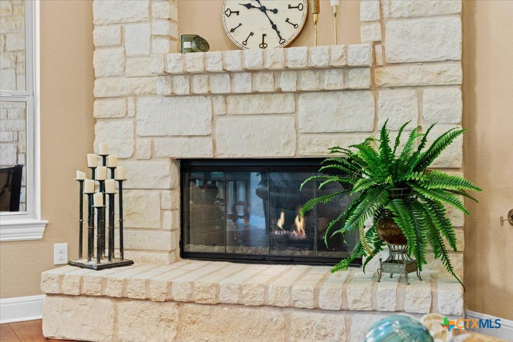Discover your dream home bordering the beautiful Brushy Creek and greenbelt, providing direct access to miles of scenic walking, jogging, and biking trails right from your backyard. Outdoor living is elevated with an extended back patio, showcasing a custom rocked fireplace and a full outdoor kitchen, including a built-in gas grill and refrigerator for effortless al fresco dining and year-round enjoyment. Inside, this two-story gem features an extended, oversized primary suite on the main level with two separate walk-in closets for maximum convenience. The first floor also includes a dedicated study/office with custom built-ins, a formal dining room, a central living area with soaring beamed ceiling and a floor to ceiling rocked fireplace, and a kitchen equipped with premium amenities like a convenient pot filler over the gas cooktop, two ovens, and a breakfast nook. Upstairs, find a large game room, bonus built-in study area, three generous bedrooms, two full baths, and a state-of-the-art theatre room, reclining seats with everything to enjoy your favorite movie. Space, luxury, and nature converge in this exceptional property. This property's energy efficiency is superb, thanks to 25 Solar World solar panels and a Lennox ML18XC2 2-Stage AC system, with electric bills ranging from just $35 to $170 over the last year. With its unbeatable location and incredible features, this home is a must-see