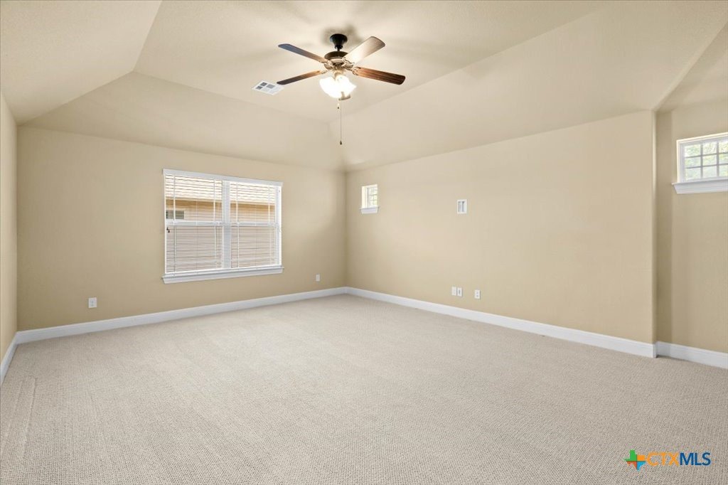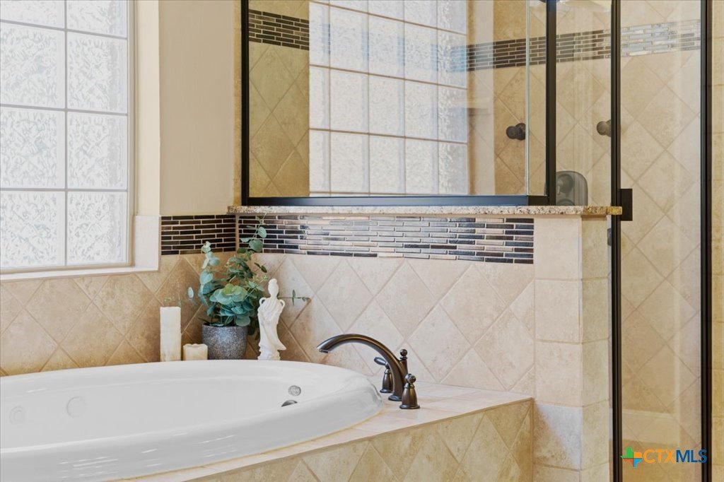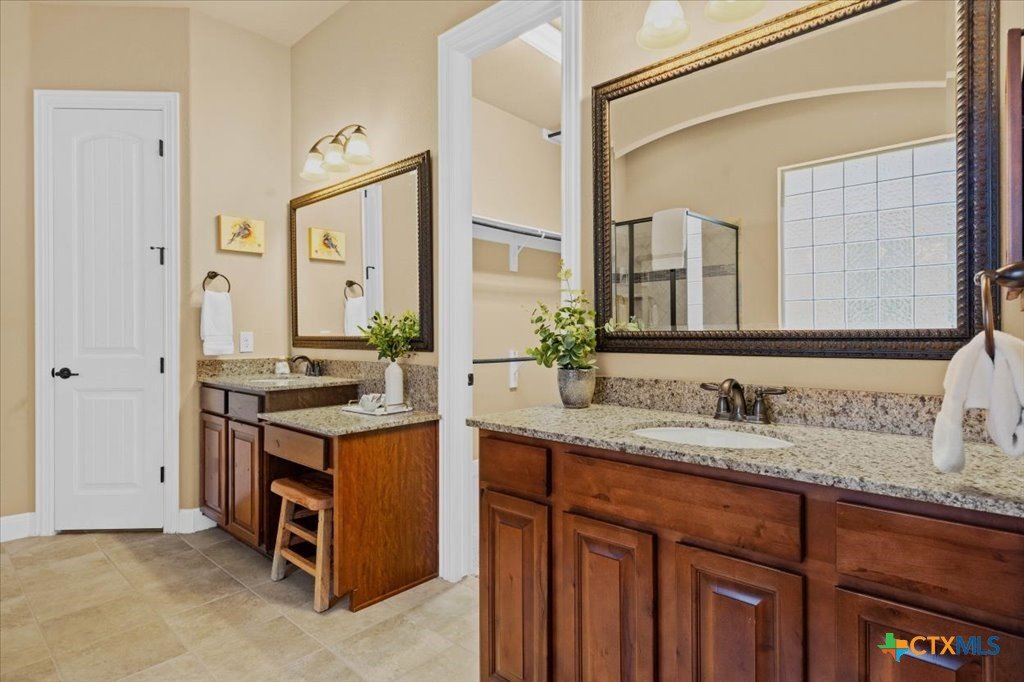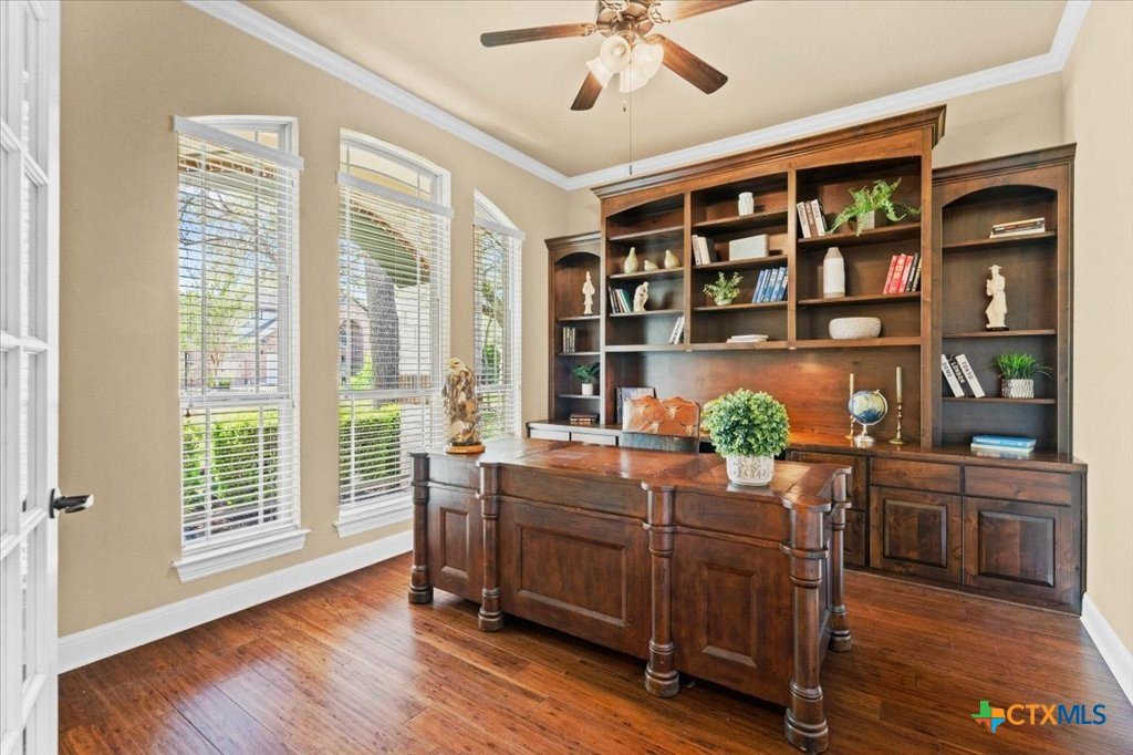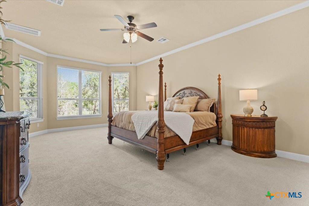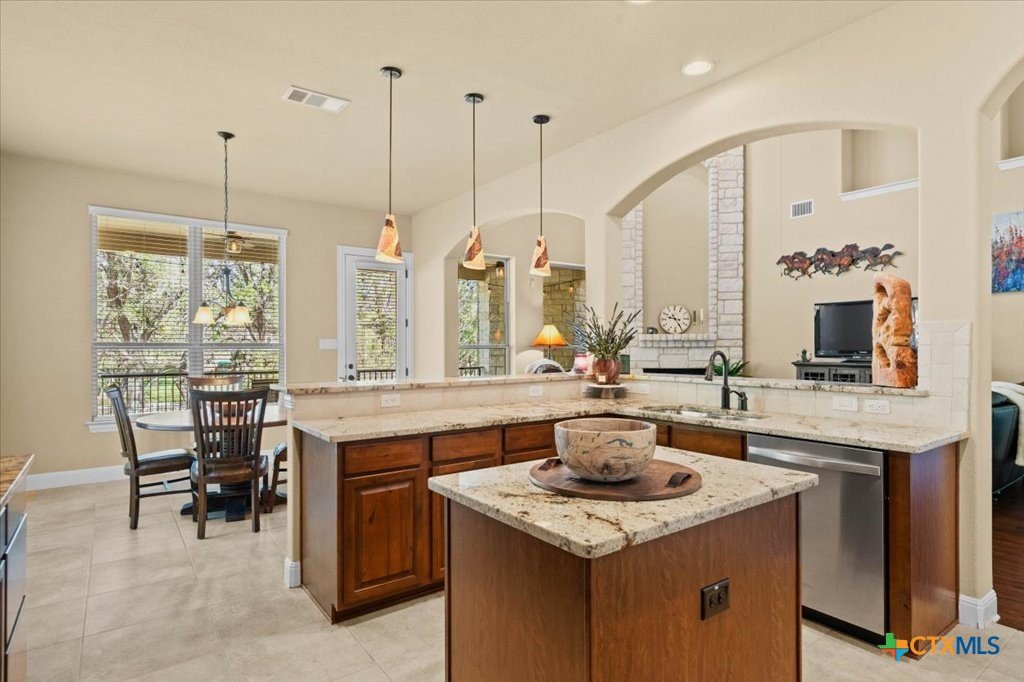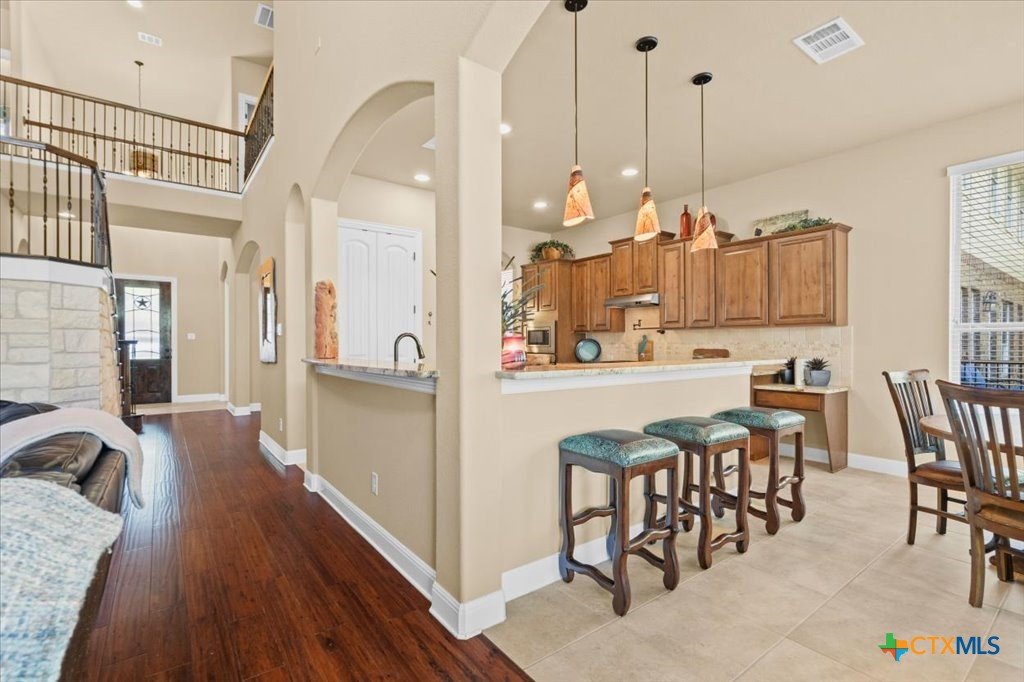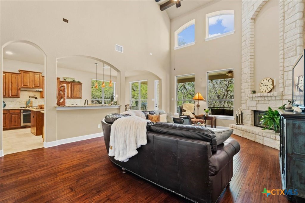 Discover your dream home bordering the beautiful Brushy Creek and greenbelt, providing direct access to miles of scenic walking, jogging, and biking trails right from your backyard. Outdoor living is elevated with an extended back patio, showcasing a custom rocked fireplace and a full outdoor kitchen, including a built-in gas grill and refrigerator for effortless al fresco dining and year-round enjoyment. Inside, this two-story gem features an extended, oversized primary suite on the main level with two separate walk-in closets for maximum convenience. The first floor also includes a dedicated study/office with custom built-ins, a formal dining room, a central living area with soaring beamed ceiling and a floor to ceiling rocked fireplace, and a kitchen equipped with premium amenities like a convenient pot filler over the gas cooktop, two ovens, and a breakfast nook. Upstairs, find a large game room, bonus built-in study area, three generous bedrooms, two full baths, and a state-of-the-art theatre room, reclining seats with everything to enjoy your favorite movie. Space, luxury, and nature converge in this exceptional property. This property's energy efficiency is superb, thanks to 25 Solar World solar panels and a Lennox ML18XC2 2-Stage AC system, with electric bills ranging from just $35 to $170 over the last year. With its unbeatable location and incredible features, this home is a must-see