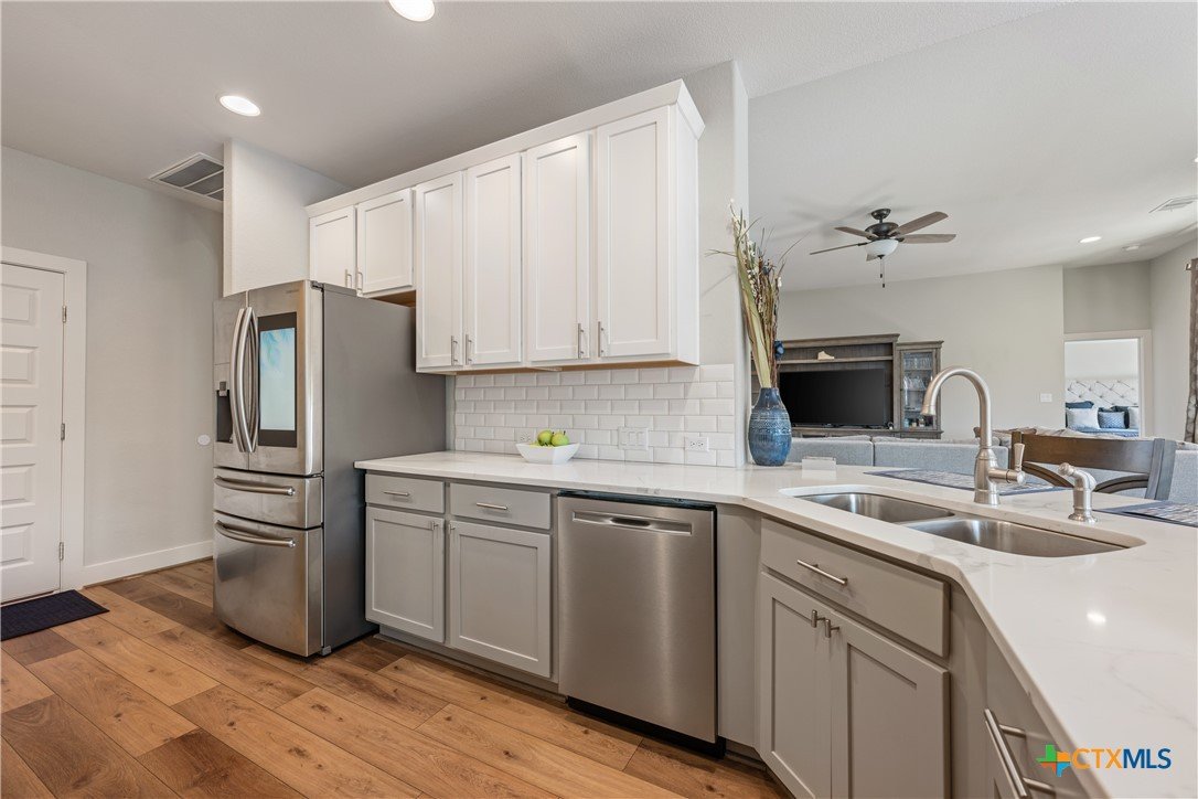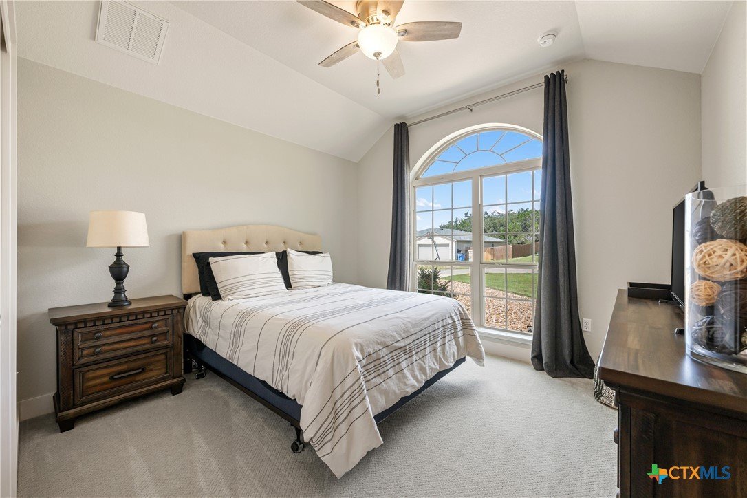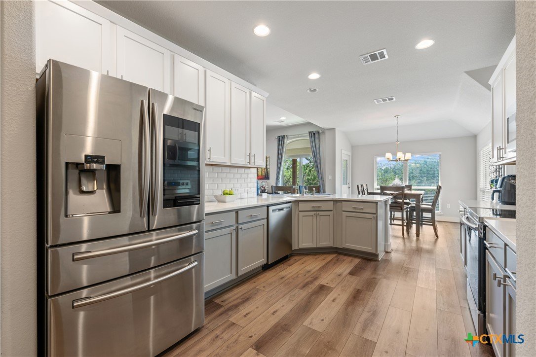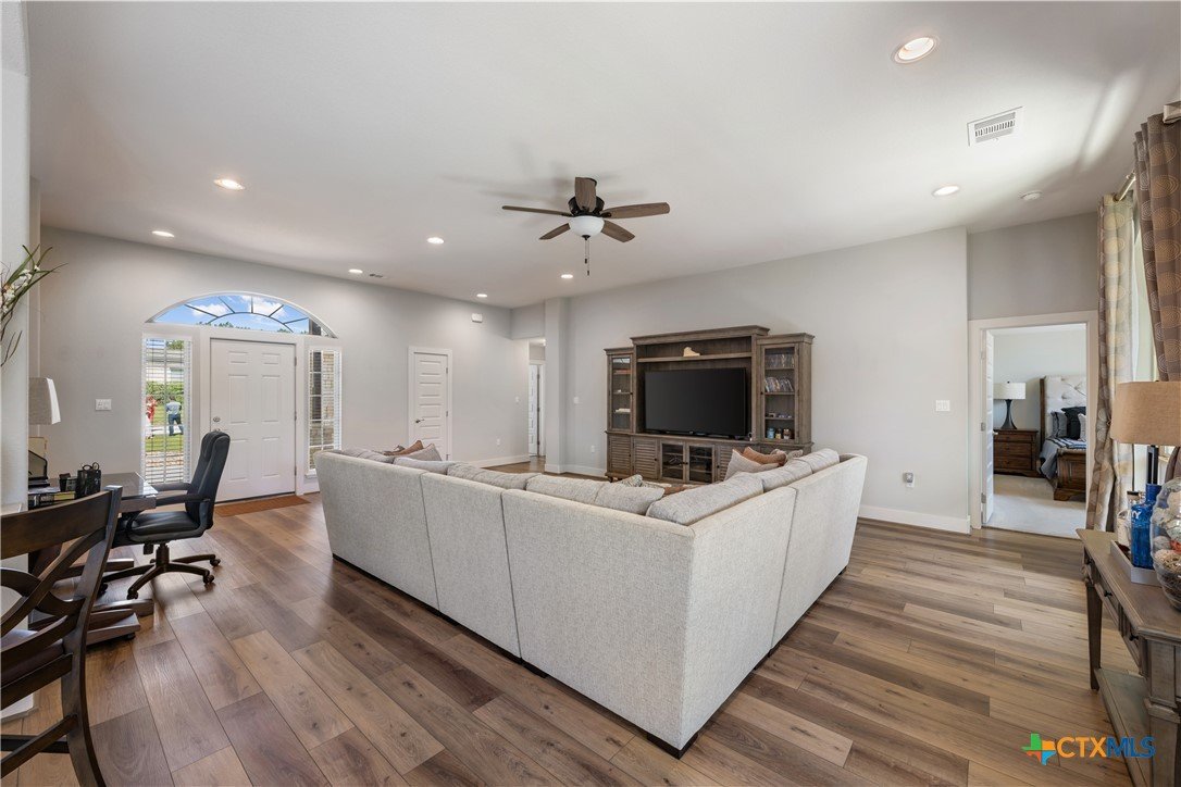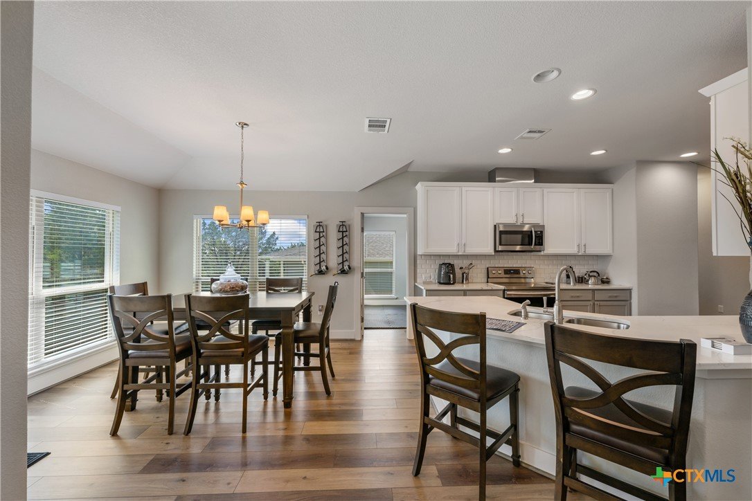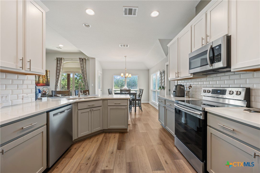 Enjoy the quiet and luxury of Lago Vista in this like-new Aria Custom Home featuring 3 bedrooms, 2 full bathrooms, and an office space. This gently used home asserts comfort from the moment you enter with an oversized living area that flows into the dining space and is partially opened to the extraordinary eat-in kitchen. This space is a culinary artist's delight with beautifully veined quartz countertops, stainless steel appliances, and state of the art Samsung refrigerator. The office is conveniently located just off of the dining area, yet tucked away for privacy. Bask in natural lighting illuminating from the impressively tall cathedral window in the primary bedroom with accompanying bathroom spotlighting a sizeable shower, dual-sink vanity, and separate dressing table. The Lago Vista community is highly sought with its scenic views, various lakes, walking trails, golf courses, and engaging nature. Come out and view this property then make the offer that will make this charismatic house your next home!