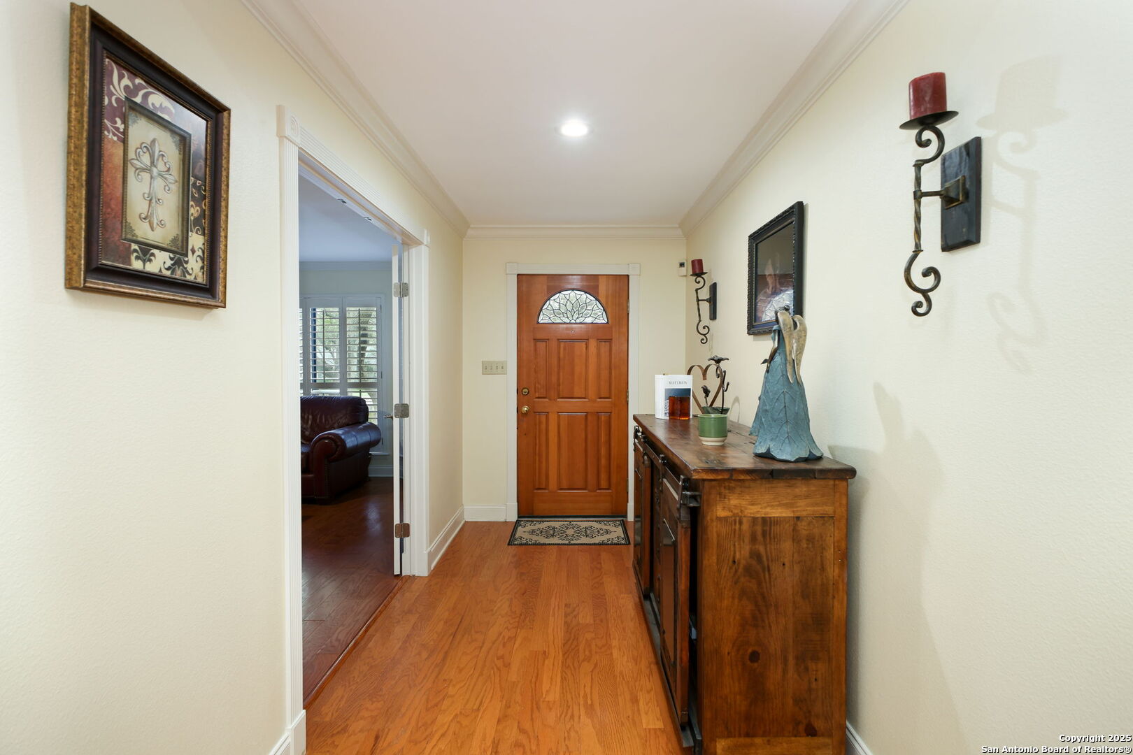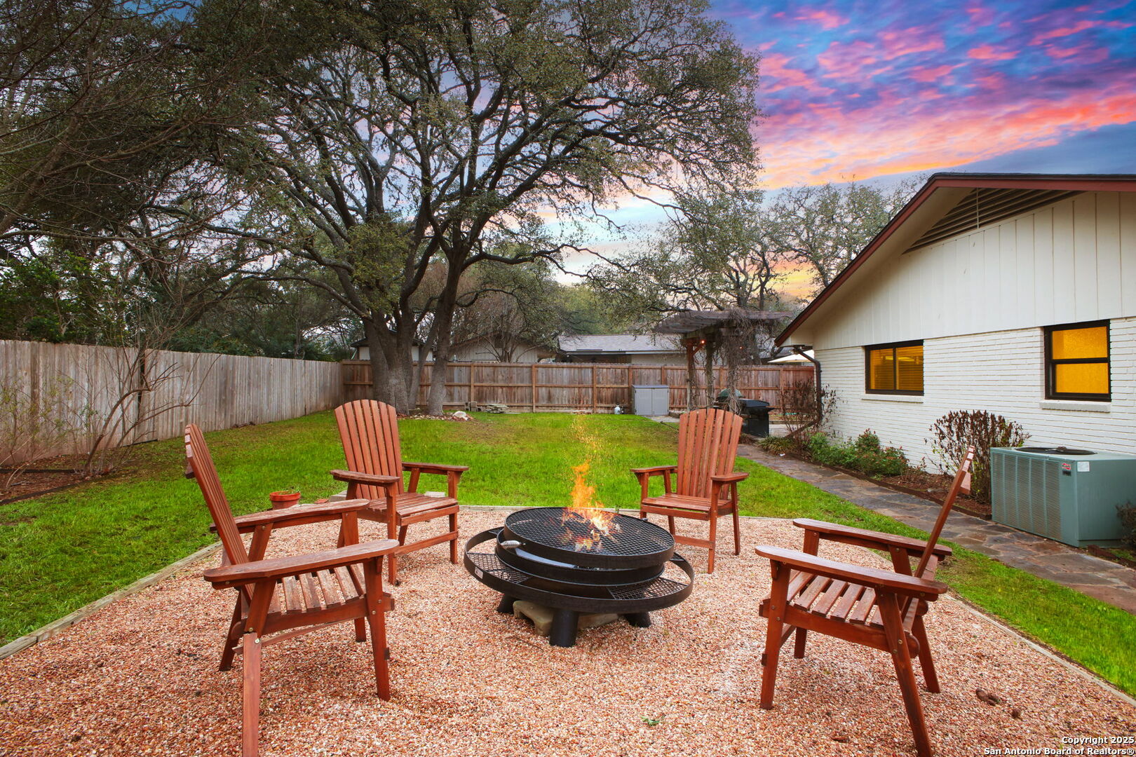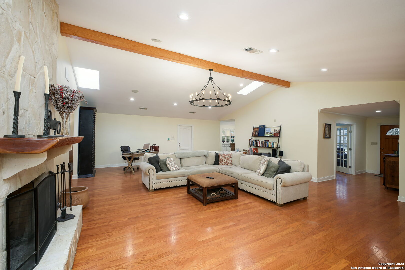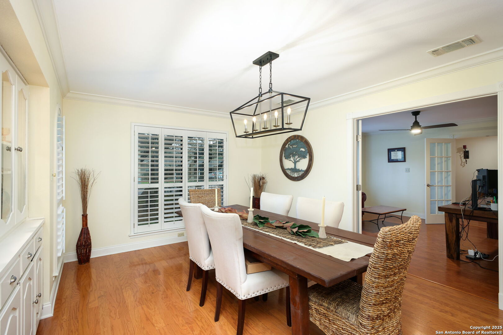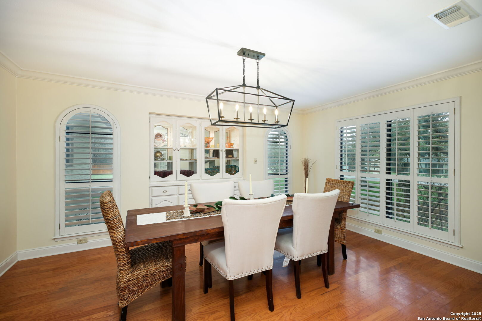 Hollywood Park true one story beauty, sitting on a corner lot with stunning oaks on park like grounds. Three bedrooms, office, large living area with huge kitchen! Two car garage, iron fence, spacious backyard with multiple sitting areas. The prime example of the ultimate spirt of community ,the town of Hollywood Park offers spectacular amenities that include the Voigt Center, playground, splash pad, pool, tennis, volleyball and basketball court. Golf cart friendly neighborhood with accessible path to Sonterra Country Club. No Mandatory HOA. Award winning N.E.I.S.D. schools. Easy access to HWY 281, LOOP 1604, 410 & just 15 minutes from downtown San Antonio.
