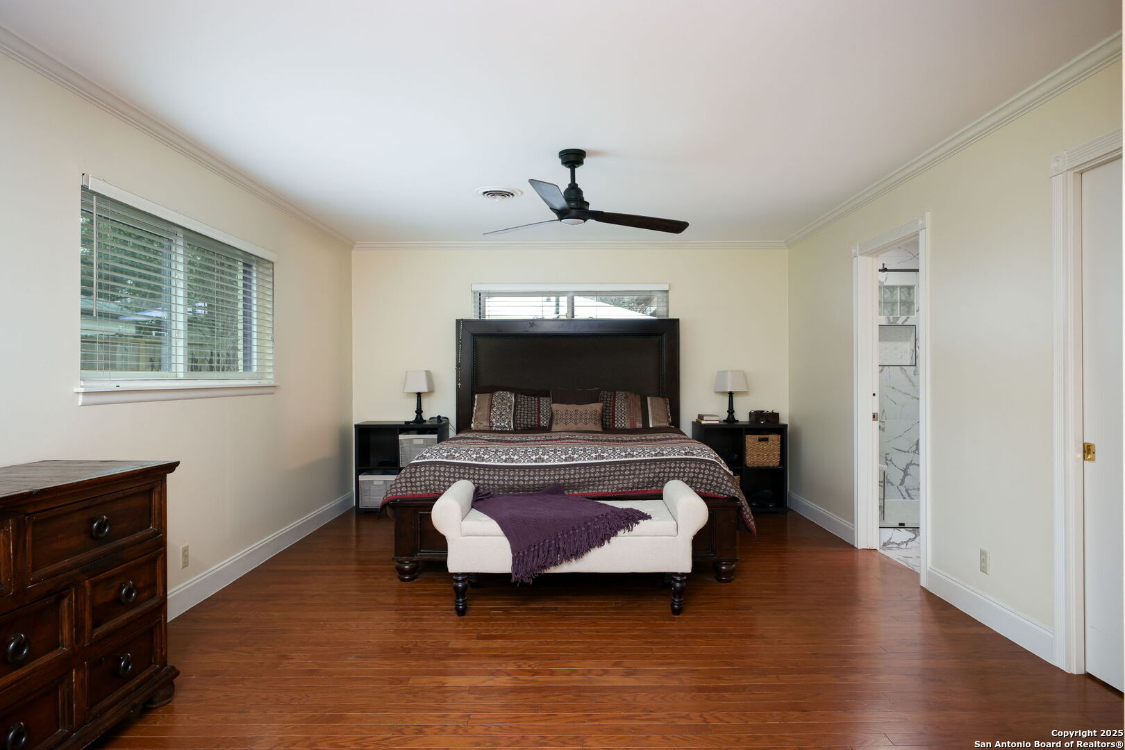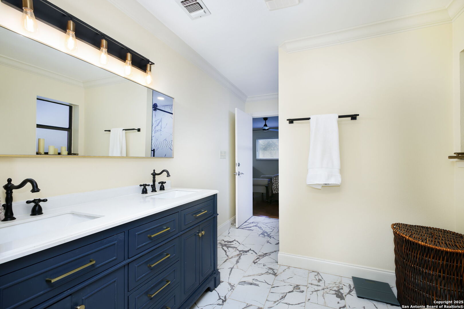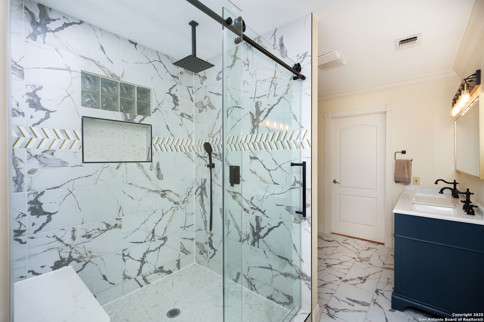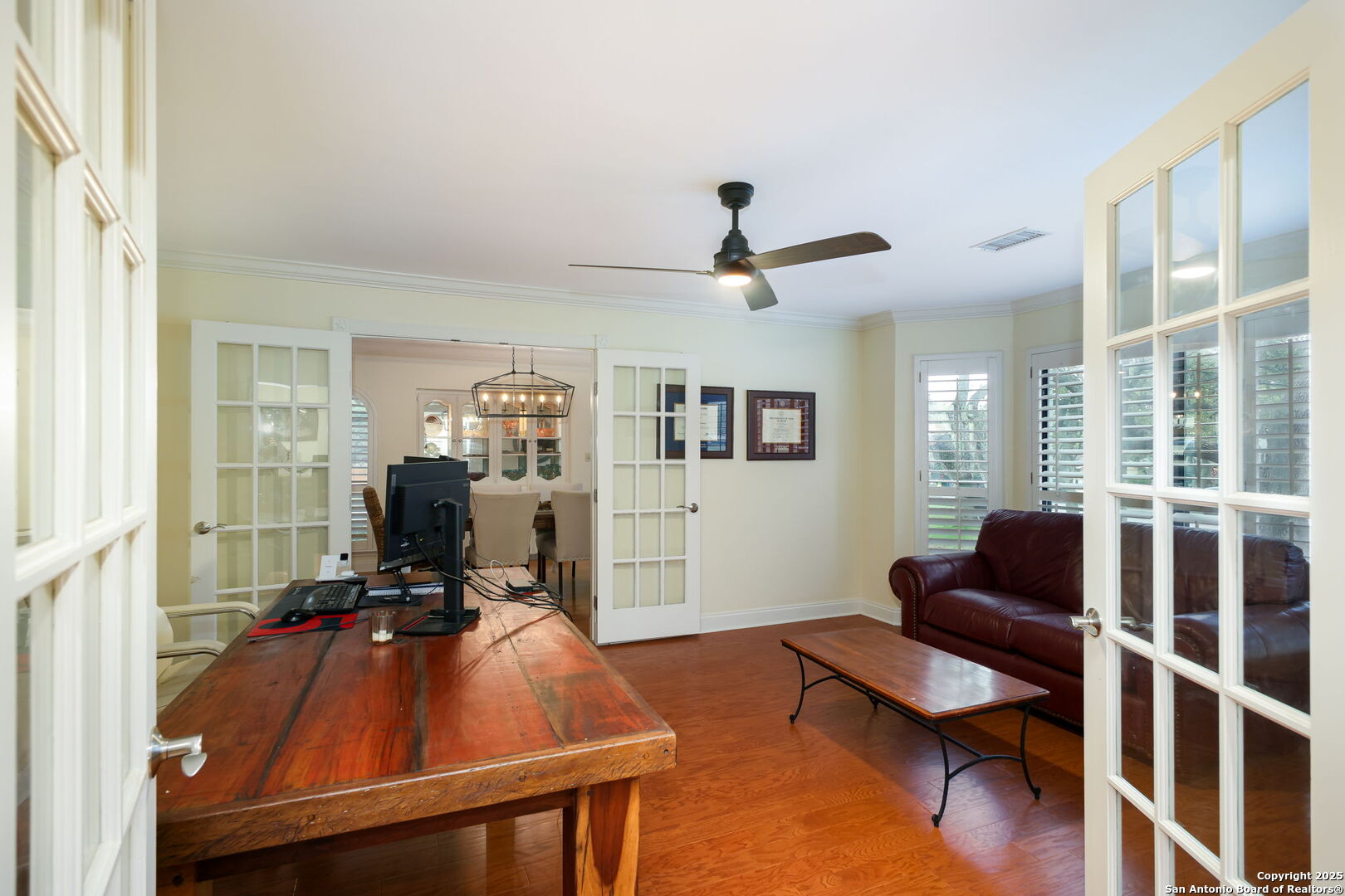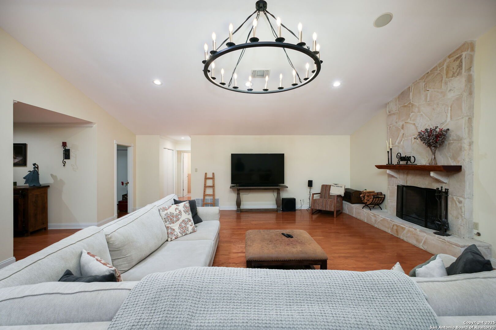 Hollywood Park true one story beauty, sitting on a corner lot with stunning oaks on park like grounds. Three bedrooms, office, large living area with huge kitchen! Two car garage, iron fence, spacious backyard with multiple sitting areas. The prime example of the ultimate spirt of community ,the town of Hollywood Park offers spectacular amenities that include the Voigt Center, playground, splash pad, pool, tennis, volleyball and basketball court. Golf cart friendly neighborhood with accessible path to Sonterra Country Club. No Mandatory HOA. Award winning N.E.I.S.D. schools. Easy access to HWY 281, LOOP 1604, 410 & just 15 minutes from downtown San Antonio.
