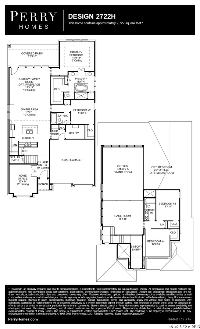 Home office with French doors set at two-story entry. Open kitchen offers deep walk-in pantry, 5-burner gas cooktop and generous island with built-in seating space. Dining area opens to two-story family room with wall of windows. Primary suite with 10-foot ceiling. Dual vanities, garden tub, separate glass-enclosed shower and large walk-in closet in primary bath. A second bedroom is downstairs. A game room and secondary bedrooms are upstairs. Covered backyard patio. Mud room off two-car garage.