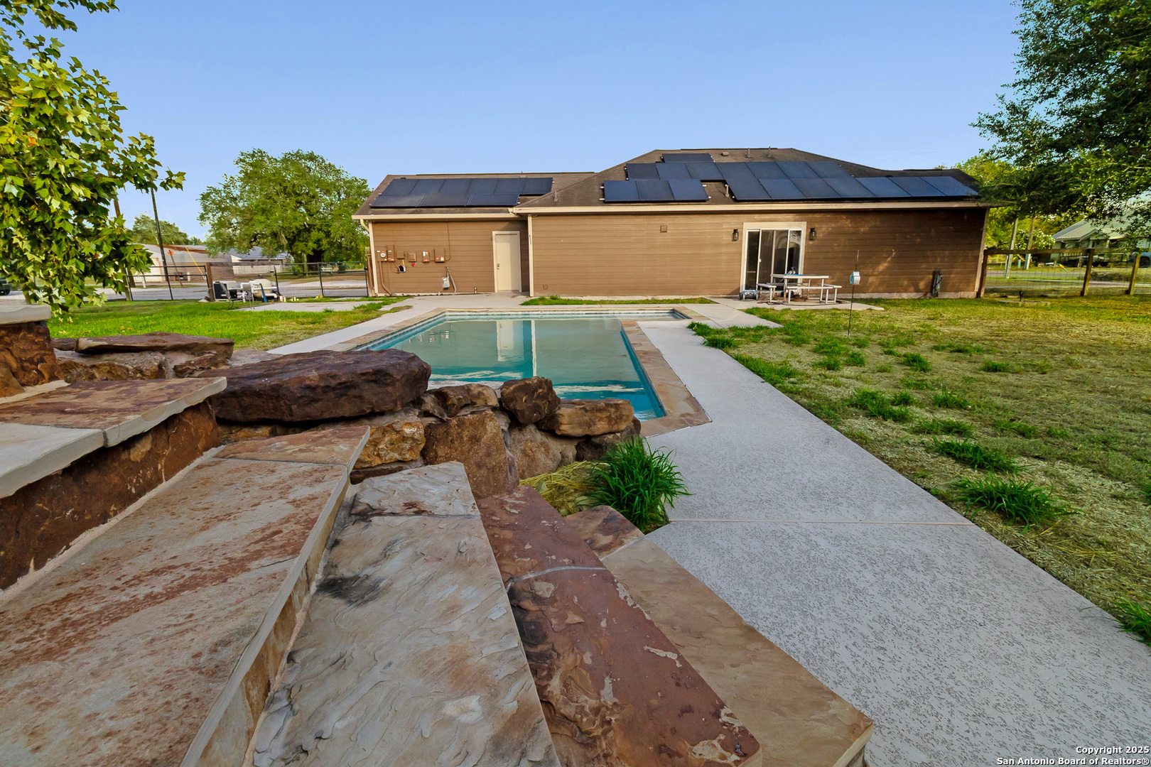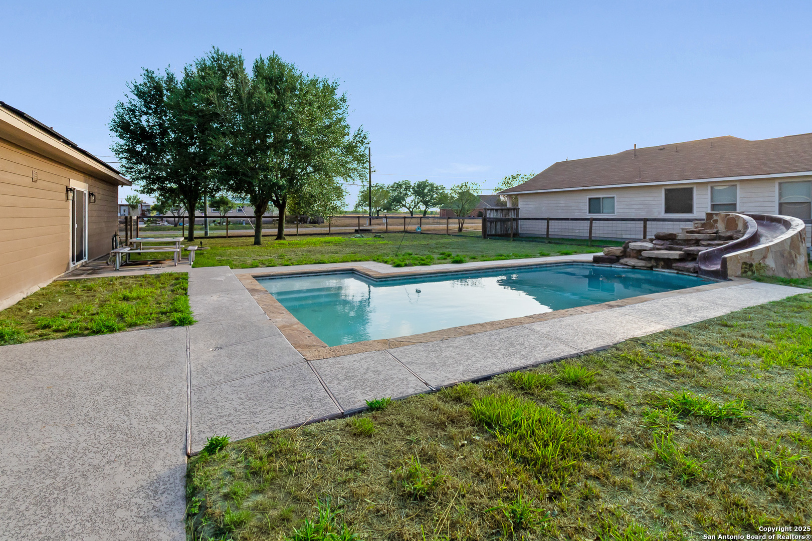 Turn up the heat at 402 W. Sullivan-literally. This gorgeous 3/2/2 sits on a huge .32-acre corner lot and comes with its own heated pool complete with a slide-your private resort, right at home. Inside, high ceilings and an open, split floor plan create a spacious flow, highlighted by elegant arched doorways. The kitchen brings the sizzle with granite countertops, stainless appliances, recessed lighting, and rich wood cabinetry. Solar panels keep energy bills low, and the fenced backyard keeps the fun contained. Top it all off? You'll be located in the highest-rated ISD in Bee County. Stylish, smart, and ready to show off.
