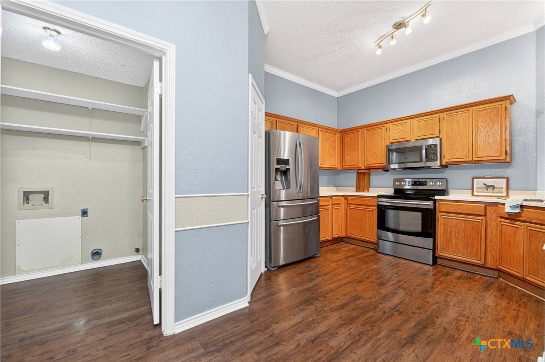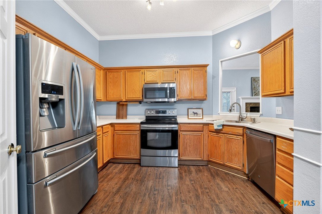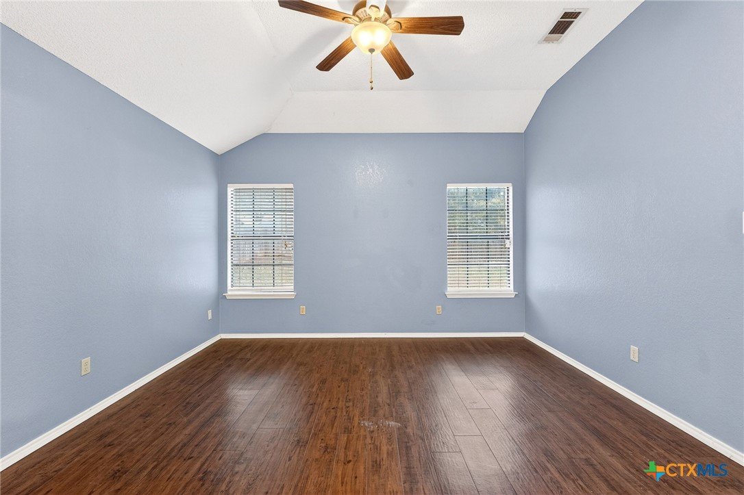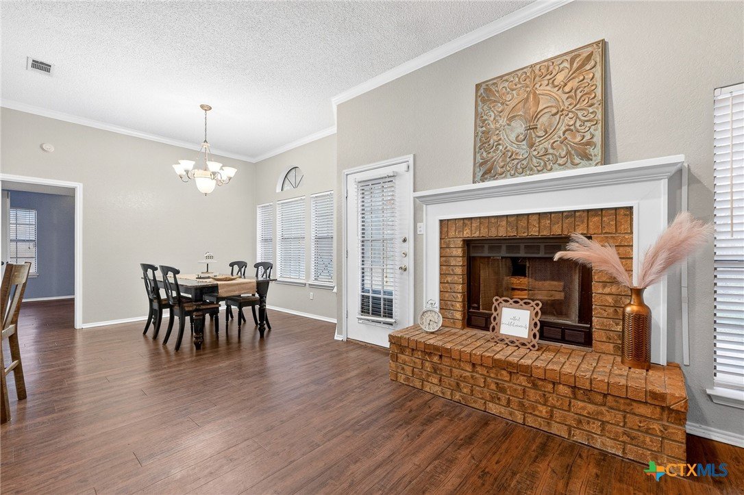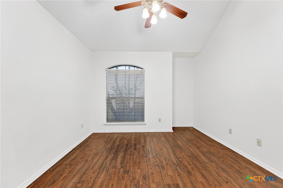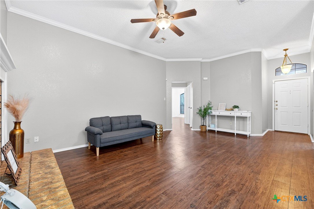 Welcome to this beautifully designed 4-bedroom, 2-bathroom home located in Spipcha Mountain, Harker Heights, Texas. This MOVE-IN READY residence boasts a convenient split floor plan that prioritizes comfort and accessibility. Step inside to discover an inviting open layout that seamlessly connects the well-equipped kitchen, which features ample cabinet space and a nice-sized pantry, to the spacious living and dining areas—perfect for entertaining. Elegant crown molding adds a touch of sophistication throughout the home, while every bedroom is equipped with ceiling fans for added comfort. The master suite serves as a true retreat, featuring a large walk-in closet and an ensuite bathroom that includes a double vanity, a luxurious garden-jetted tub, and a separate shower for ultimate relaxation. Enjoy the privacy of a fenced backyard, ideal for outdoor gatherings. With close proximity to schools, shopping, and dining, this home is the perfect blend of modern living and convenience.