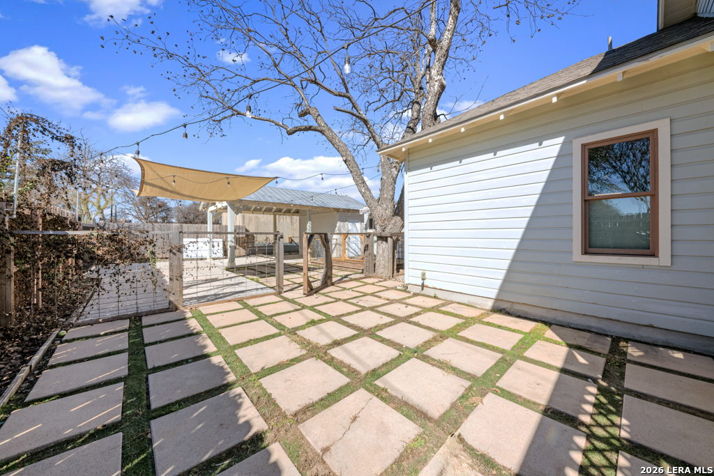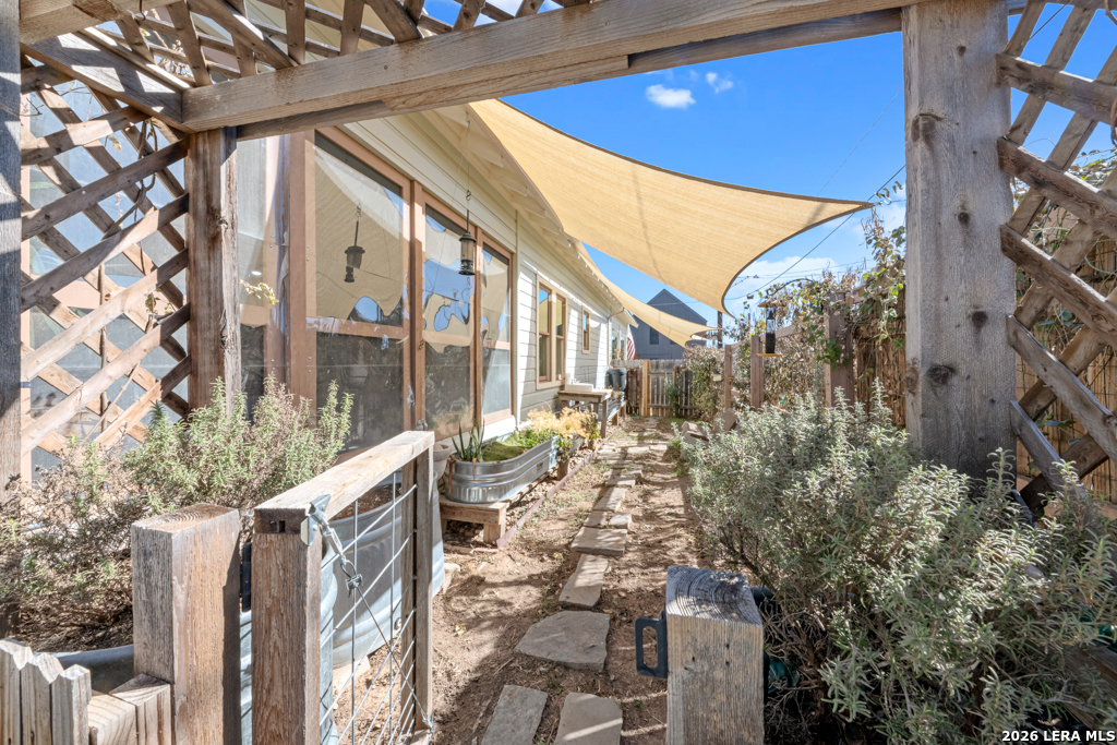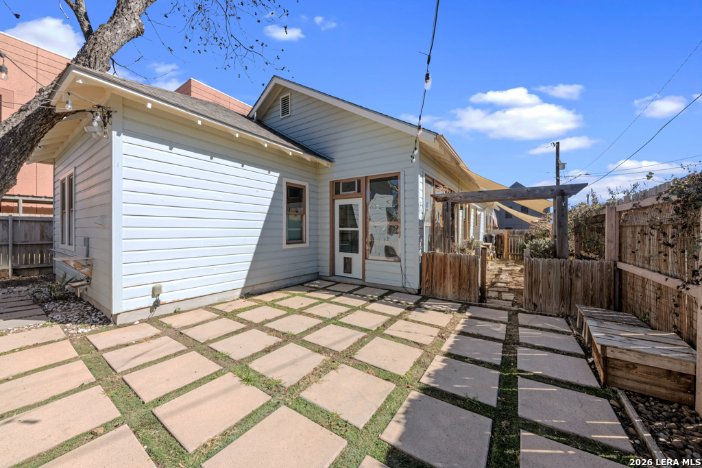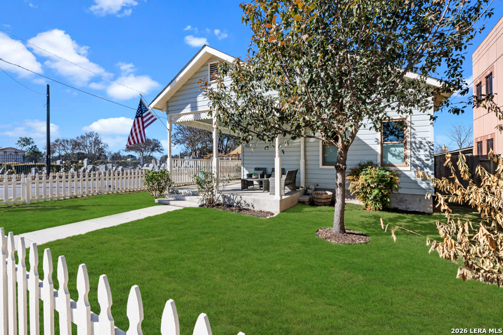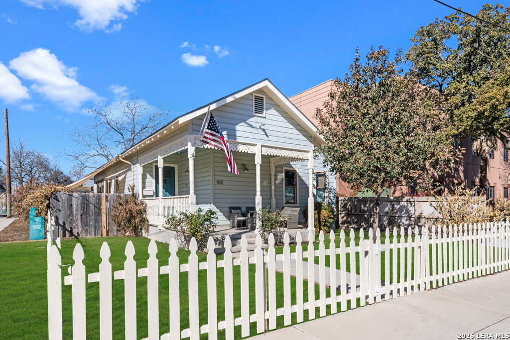 Set on an oversized corner lot in the heart of historic Dignowity Hill, this lovely Folk Victorian style, modern bungalow offers a rare combination of privacy, quiet, and architectural character just minutes from downtown San Antonio. Built in 2018, the home reflects the charm of early neighborhood design while delivering modern efficiency, thoughtful upgrades, and intelligent use of space. Across the street lies the historic San Antonio cemetery grounds, encompassing over 100 acres of preserved open space. Dignowity Hill was stablished in the late 1800s and was originally subdivided into large estate-sized lots for prominent residents, laying the groundwork for what became the city's first exclusive residential neighborhood. Today, the area is recognized as a historic district celebrated for its architectural legacy, mature landscape, and enduring sense of place. The presence of the cemetery creates a uniquely peaceful backdrop, offering long-term privacy and unobstructed views, offset by the energy of nearby East Houston Street. The home features high ceilings, engineered wood floors, an open-concept kitchen with quartz countertops, custom wood cabinetry, stainless steel appliances, and a spacious laundry room. An inviting covered front porch and airy Florida room extend the living space. Secondary bedrooms are connected by a Jack-and-Jill bath, and custom top-down/bottom-up window shades with light-filtering and blackout options are installed throughout. Outdoor spaces are thoughtfully designed and fully fenced, featuring dog fencing with removable panels, zoysia grass, picket fencing in the front yard, and privacy fencing near the driveway. The backyard includes hardscaping, a deck, and exterior lighting, while the side garden offers a gated entry, raised beds, irrigation, rain barrel, dry potting sink, shade screens, and gutters. A gated driveway accessed from the side street provides additional concrete parking and enhanced privacy, with a county office building next door further contributing to the quiet setting. Two heated and cooled sheds/workrooms with electricity provide flexible space for storage, hobbies, or office use, including a dedicated toolroom with a portable AC unit. Additional upgrades include a tankless water heater, electric vehicle charging plug, upgraded electrical panel supporting the sheds and charging plug, water softener, upgraded interior and exterior lighting, and a interior/exterior security camera system. Featured on HGTV's House Hunters in 2019, this home is a rare offering in one of San Antonio's most iconic historic neighborhoods, conveniently located near downtown, the Pearl, Blue Star, the River Walk, the Alamodome, Fort Sam Houston, major freeways, and the highly anticipated Project MARVEL.