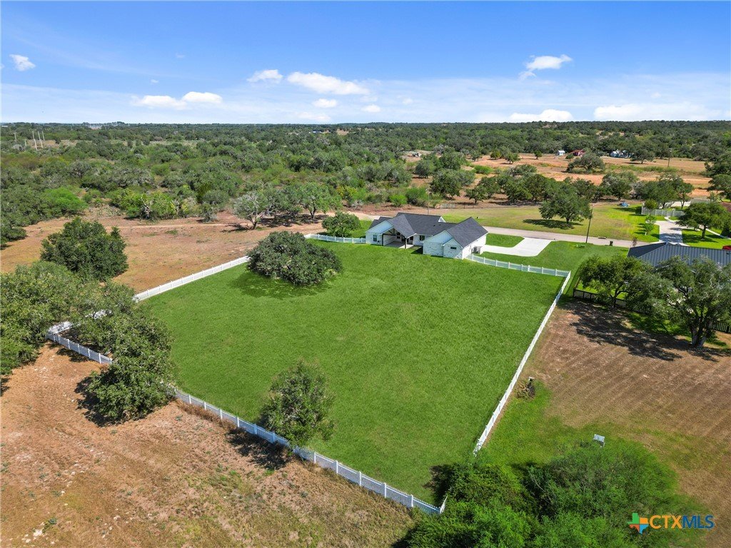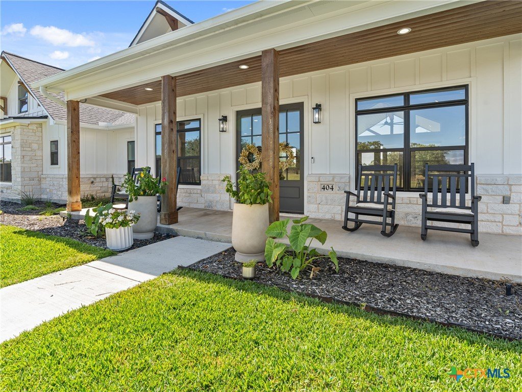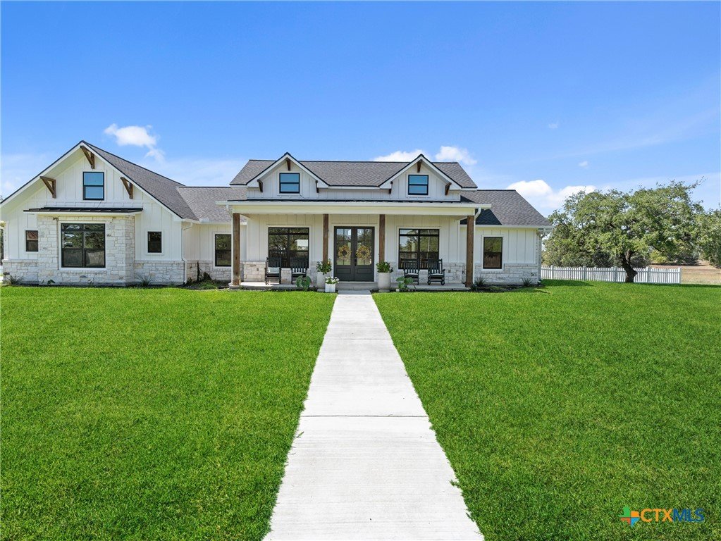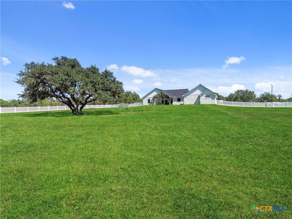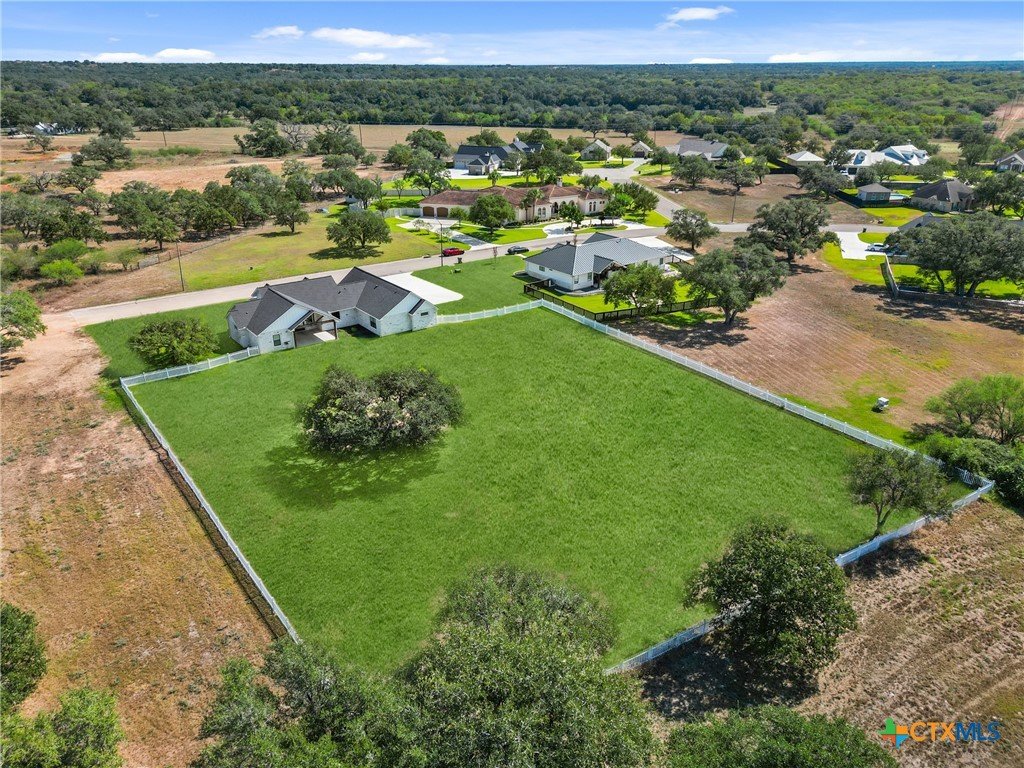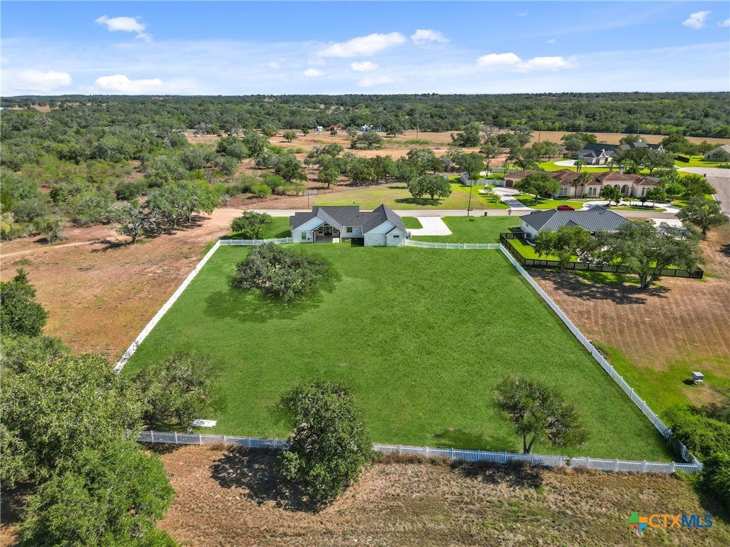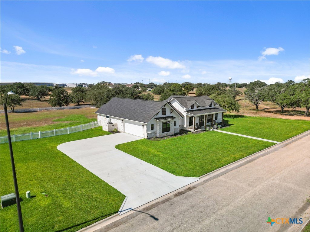 Luxury Living in Pebble Ridge – Double Lot with Oaks & Country Views. Immaculate board and batten & cream limestone home on a rare double lot, surrounded by stately live oaks and peaceful country views. Located on a quiet dead-end road with no neighbors across and city property behind, this property offers unmatched privacy and charm. White picket fencing, mature trees, and a welcoming covered porch create stunning curb appeal. Inside, soaring 10’ ceilings, French doors, and custom finishes elevate every space. The chef’s kitchen boasts Bosch & LG stainless appliances, quartz countertops, custom cabinetry, open shelving, vented hood, and a designer backsplash. Spacious Butler pantry with ample storage. The owner’s suite is a true retreat with spa-like bath featuring a freestanding tub, walk-in shower, double vanity, and expansive closet. Secondary bedrooms enjoy a Jack & Jill bath with upscale finishes. Additional highlights include an office nook, mudroom, ½ bath, Norman window coverings, and a 2-car side-entry garage. City utilities, trash service, and just 2 miles from schools.