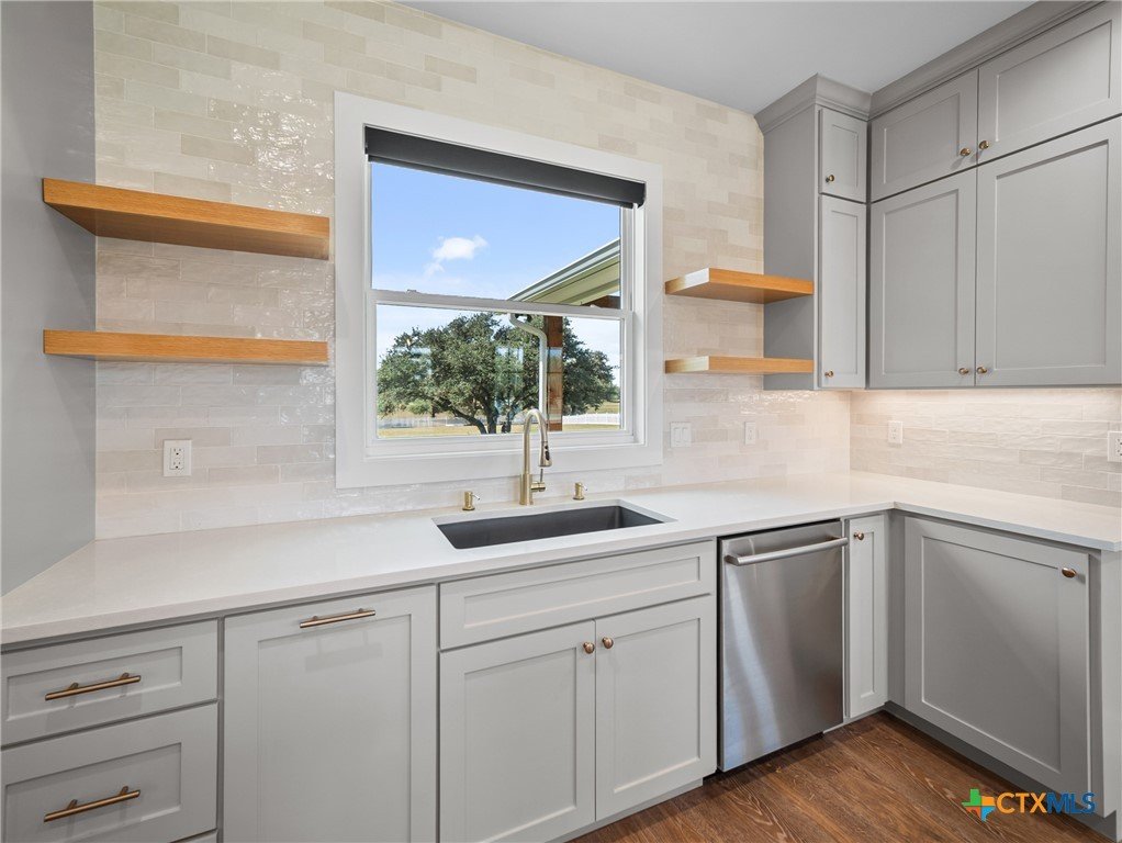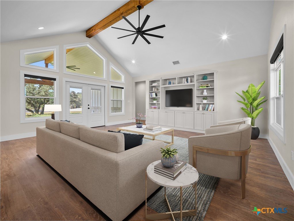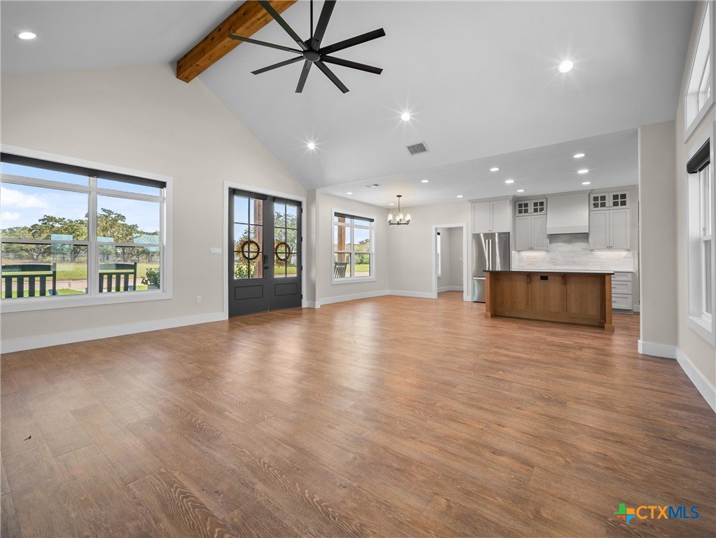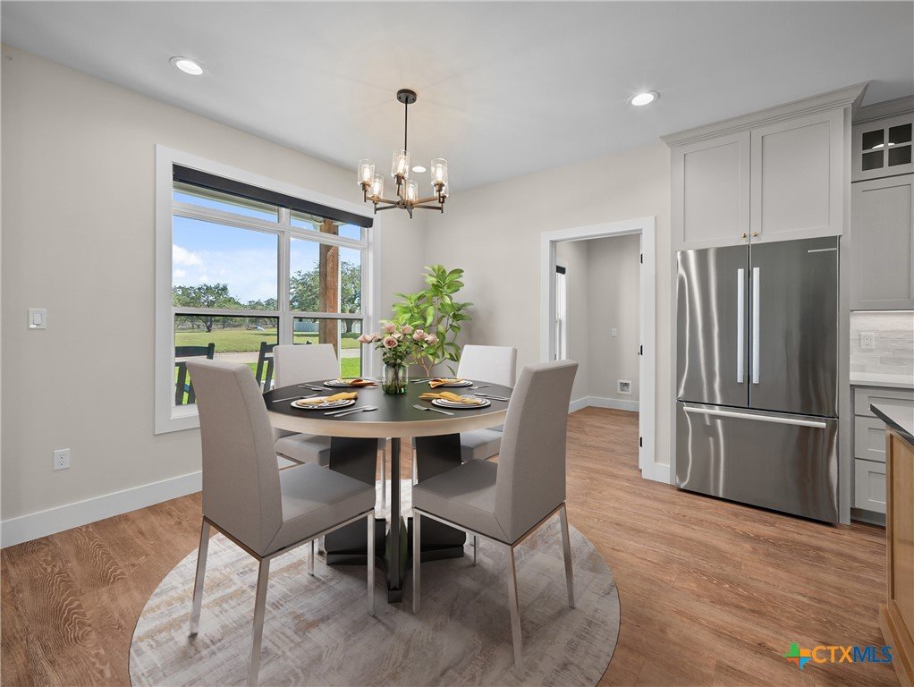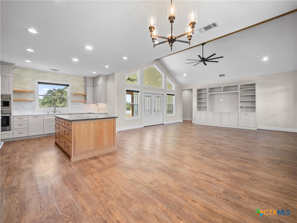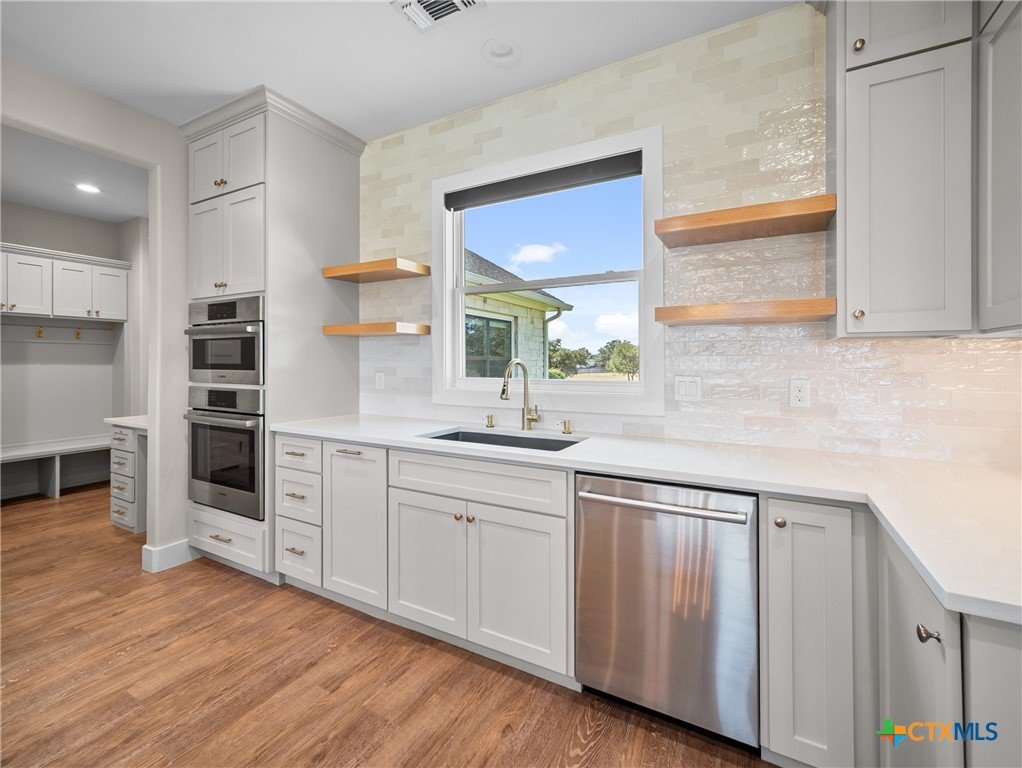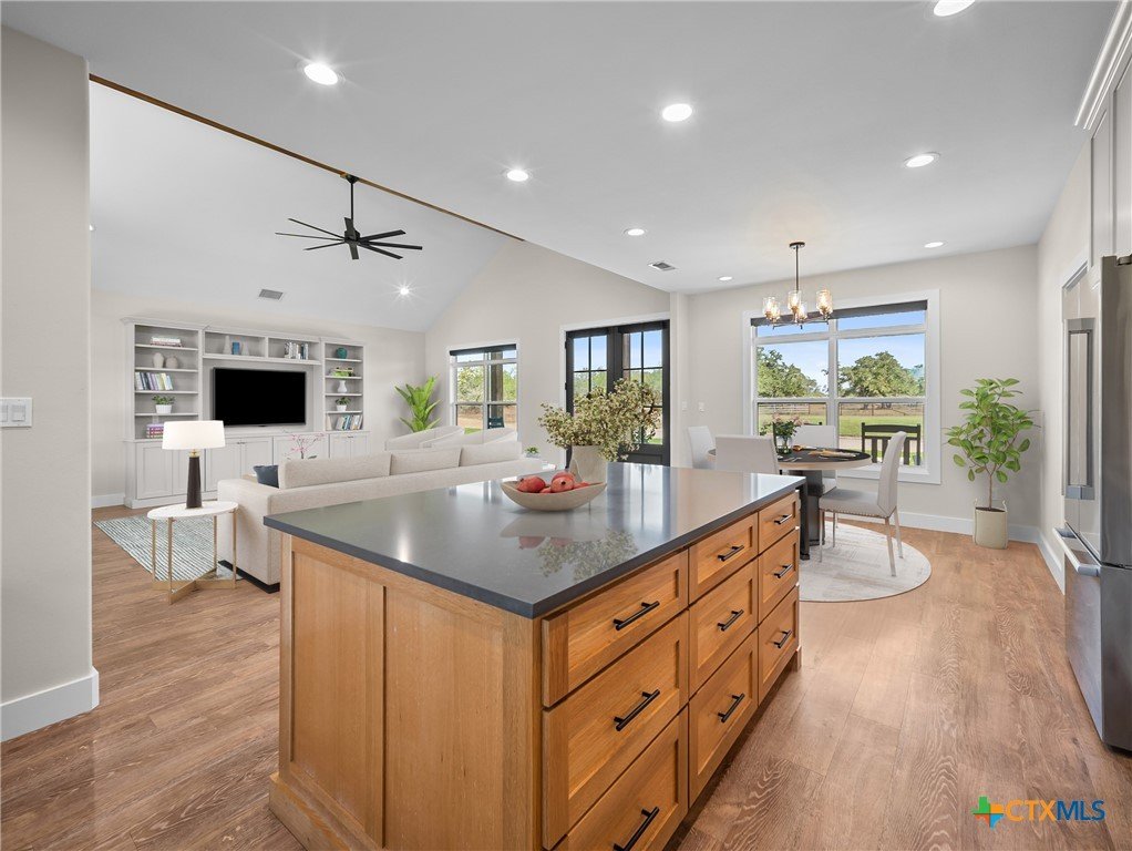 Luxury Living in Pebble Ridge – Double Lot with Oaks & Country Views. Immaculate board and batten & cream limestone home on a rare double lot, surrounded by stately live oaks and peaceful country views. Located on a quiet dead-end road with no neighbors across and city property behind, this property offers unmatched privacy and charm. White picket fencing, mature trees, and a welcoming covered porch create stunning curb appeal. Inside, soaring 10’ ceilings, French doors, and custom finishes elevate every space. The chef’s kitchen boasts Bosch & LG stainless appliances, quartz countertops, custom cabinetry, open shelving, vented hood, and a designer backsplash. Spacious Butler pantry with ample storage. The owner’s suite is a true retreat with spa-like bath featuring a freestanding tub, walk-in shower, double vanity, and expansive closet. Secondary bedrooms enjoy a Jack & Jill bath with upscale finishes. Additional highlights include an office nook, mudroom, ½ bath, Norman window coverings, and a 2-car side-entry garage. City utilities, trash service, and just 2 miles from schools.