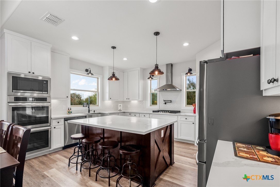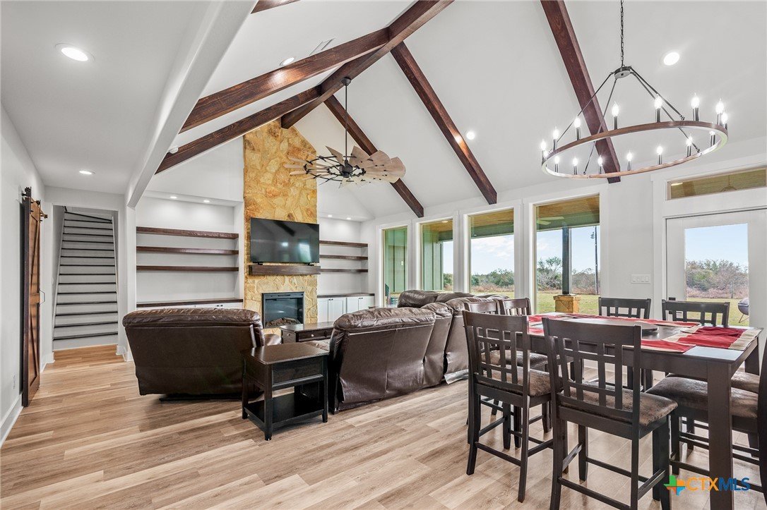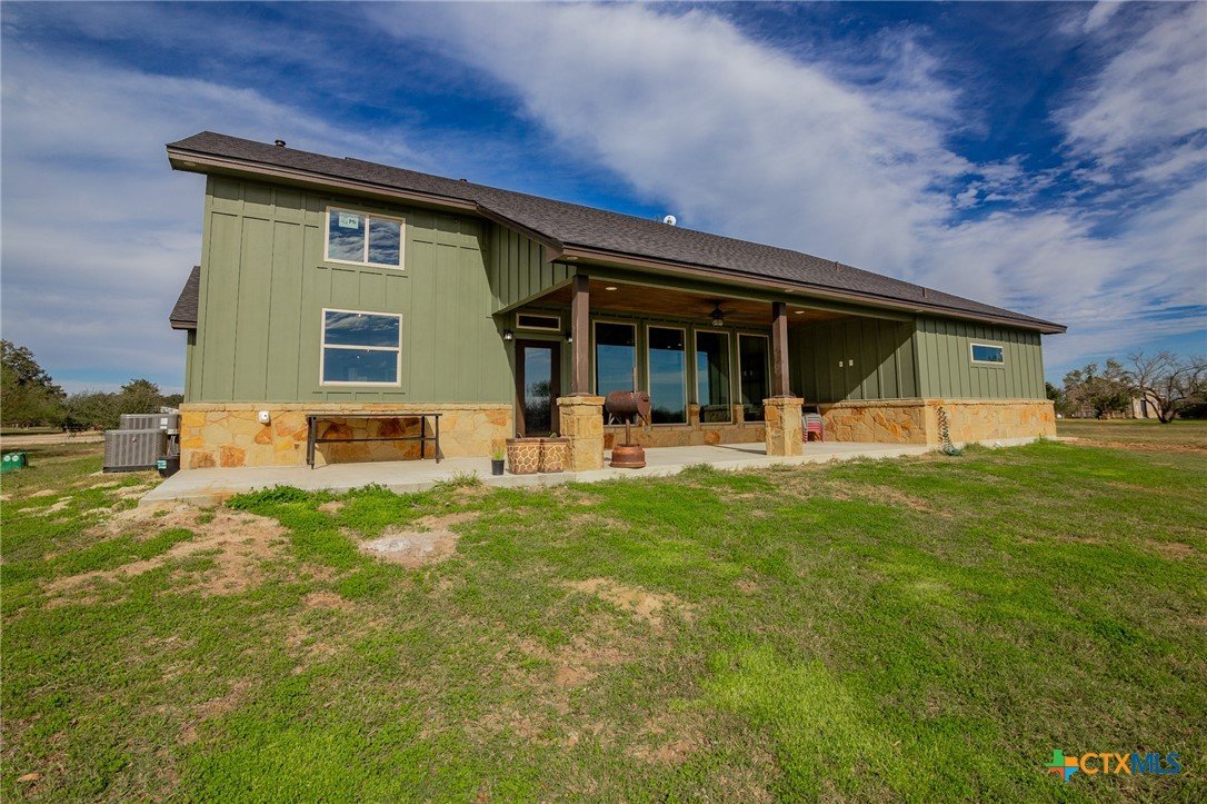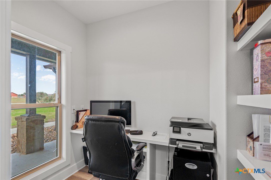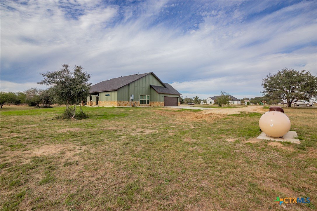 Beautiful 4-Bedroom Home on approximately 2.35 Acres in Fannin Texas, Goliad County! Just 20 minutes from Victoria, this stunning 4-bedroom, 3-bathroom home offers the perfect combination of modern amenities and serene country living. Designed with a thoughtful split floor plan, the home features vaulted ceilings accented by decorative wood beams and elegant wood details throughout. The spacious kitchen is equipped with custom cabinetry, under-cabinet lighting, quartz countertops, and a large island. High-quality stainless steel appliances include double ovens, gas stove with extendable pot filler, a dual-compartment deep sink, and a new dishwasher. The upstairs features a large second living area along with additional air conditioned space not included in square footage.The home also incorporates energy-efficient features such as spray foam insulation, energy-efficient windows, and a tankless on-demand water heater. Dual AC units with a dehumidifier and separate controls for upstairs and downstairs provide year-round comfort and efficiency. The home also includes a finished garage with insulated garage doors, a water softener system, and both hot and soft water exterior faucets, offering convenience for washing your car or bathing your pets. Attention to detail is evident throughout the construction, with over 25 piers and an investment of more than $15,000 in site soil to help with a solid foundation and long-term stability. The exterior of the home is finished with durable stone and James Hardi siding, ensuring low-maintenance living and lasting beauty. With such a huge spacious lot, this property offers plenty of room for relaxation, entertaining, or enjoying the quiet countryside.