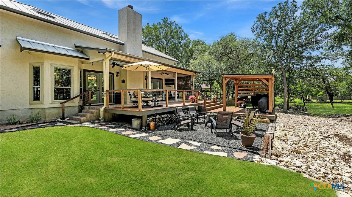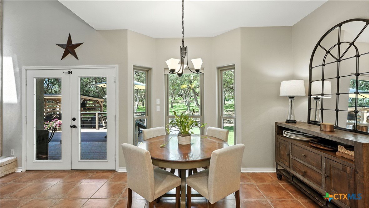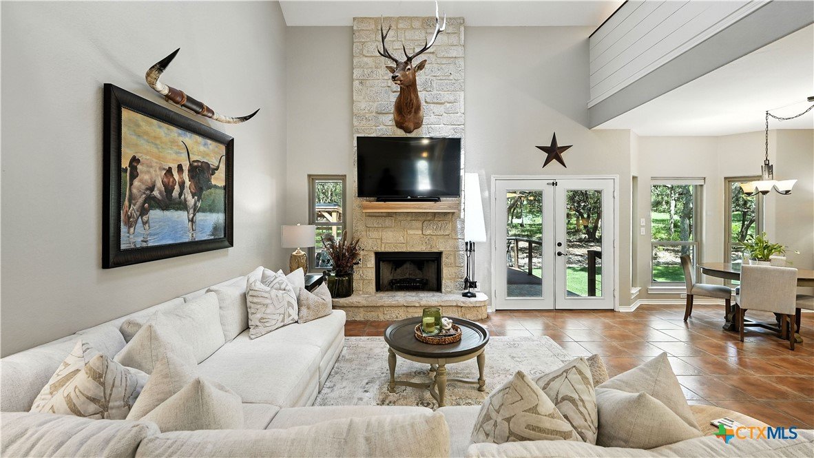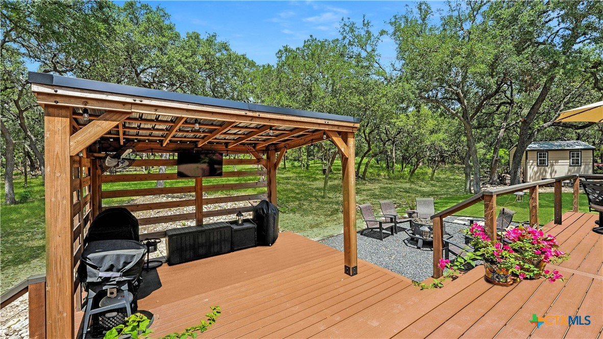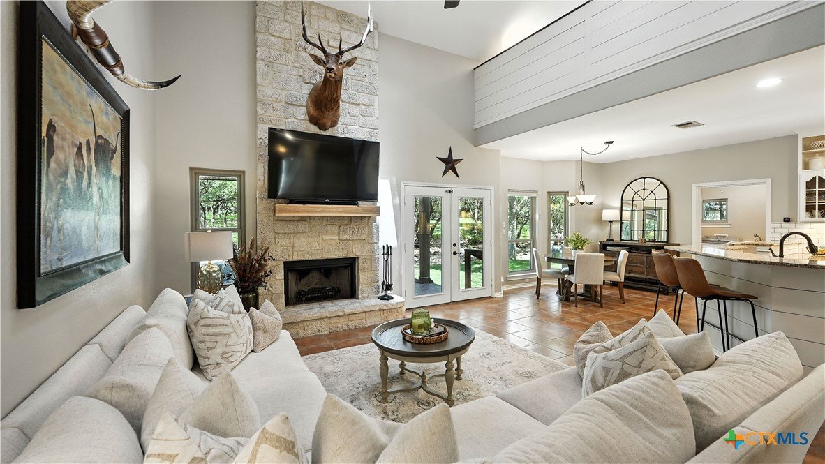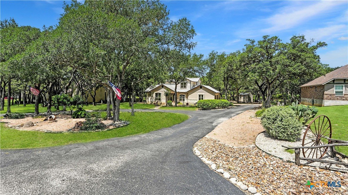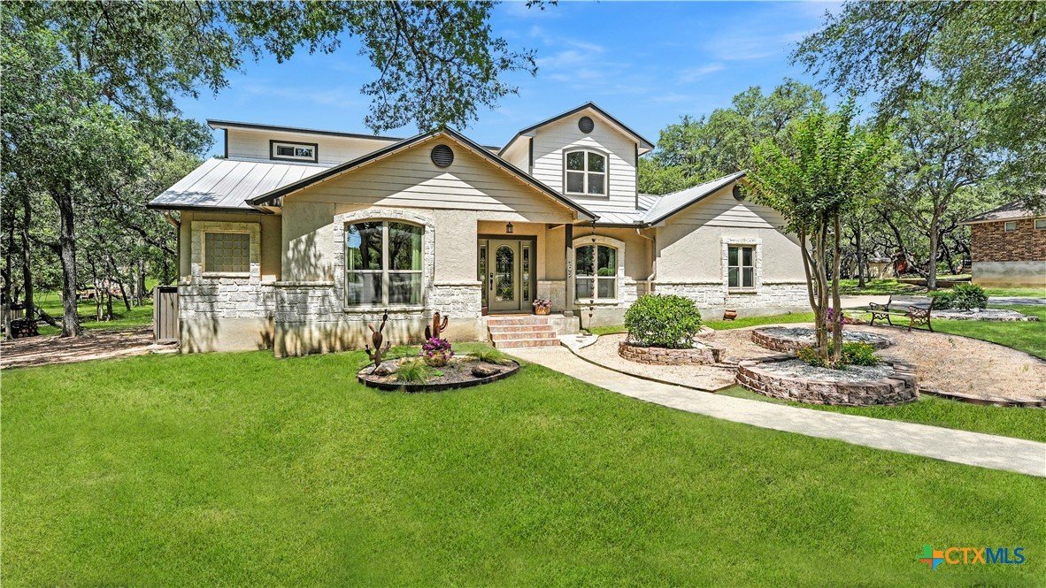 Welcome to this beautifully updated home in the highly desirable Pinnacle community! From the moment you step into the inviting main living area, you're greeted by a stunning floor-to-ceiling stone fireplace and an abundance of natural light streaming through large windows, creating a warm and welcoming atmosphere. The updated eat-in kitchen is perfect for both daily living and entertaining, featuring granite countertops, stainless steel appliances, and ample cabinet space. A formal dining room offers a touch of elegance, while the home study/office provides a quiet retreat for remote work or reading. The spacious primary suite is a true sanctuary with rich wood flooring, patio doors leading to the outdoor oasis, multiple closets, and a large en suite bath complete with a soaking tub, separate shower, and double vanities. Upstairs, enjoy a bright open loft family room, two generously sized bedrooms, and a full bath. A split-bedroom design includes an additional 14'x10' climate-controlled flex room-ideal for holiday decor storage, a hobby room, or creative studio. Step outside to a thoughtfully designed outdoor living area, recently updated with a low-maintenance composite deck, multiple seating areas, roller shades, a cabana with TV, and a charming flagstone walkway-perfect for hosting or unwinding. Notable updates include permanent LED holiday lights (app-controlled), spray foam insulation added at the garage, interior lighting upgrades, exterior stucco painted, new windows (2021), and metal roof (2019). Additional features include water softener, gutters, irrigation system, and storage shed. Nestled on a serene, 1 acre wooded lot, this property offers plenty of mature trees for privacy and shade, along with a picturesque dry weather creek that adds charm and a peaceful, natural backdrop to the outdoor living space. All of this is offered below the 2023 appraisal value - move-in ready home in one of the area's most desirable neighborhoods.