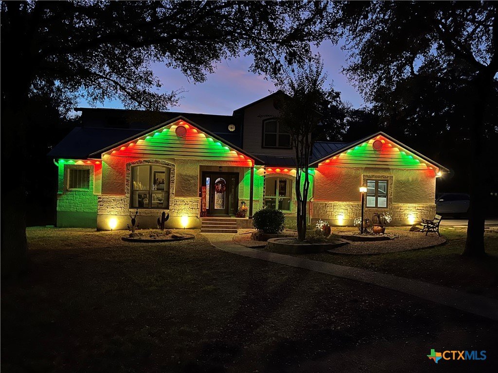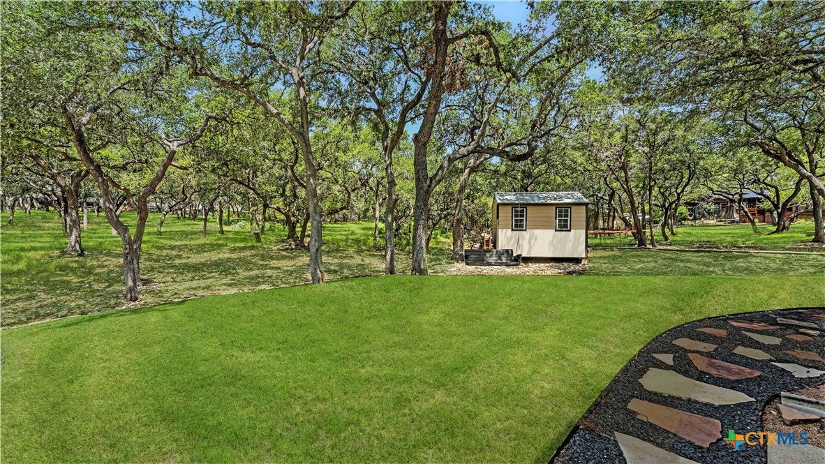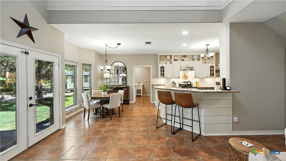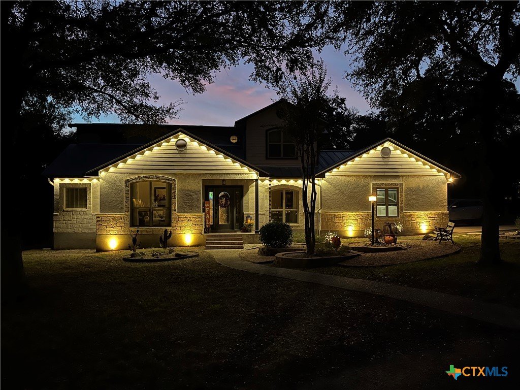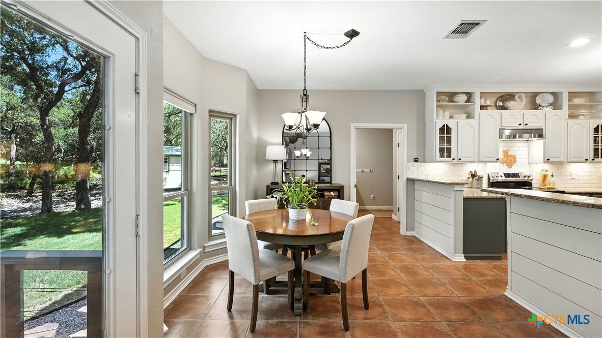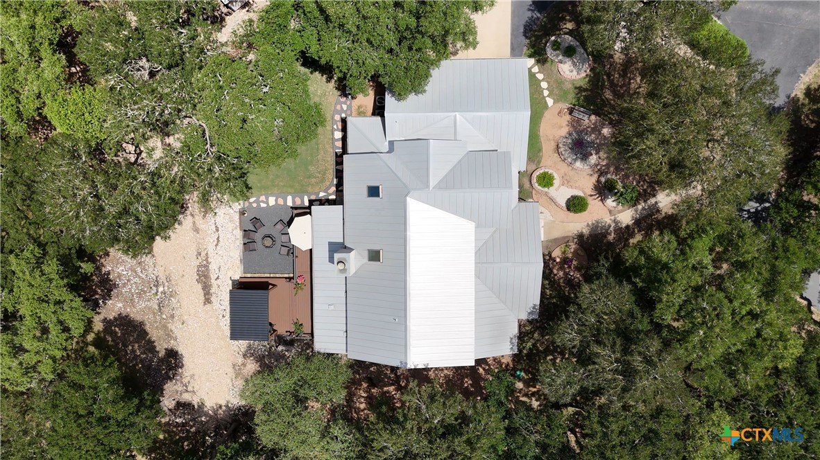 Welcome to this beautifully updated home in the highly desirable Pinnacle community! From the moment you step into the inviting main living area, you're greeted by a stunning floor-to-ceiling stone fireplace and an abundance of natural light streaming through large windows, creating a warm and welcoming atmosphere. The updated eat-in kitchen is perfect for both daily living and entertaining, featuring granite countertops, stainless steel appliances, and ample cabinet space. A formal dining room offers a touch of elegance, while the home study/office provides a quiet retreat for remote work or reading. The spacious primary suite is a true sanctuary with rich wood flooring, patio doors leading to the outdoor oasis, multiple closets, and a large en suite bath complete with a soaking tub, separate shower, and double vanities. Upstairs, enjoy a bright open loft family room, two generously sized bedrooms, and a full bath. A split-bedroom design includes an additional 14'x10' climate-controlled flex room-ideal for holiday decor storage, a hobby room, or creative studio. Step outside to a thoughtfully designed outdoor living area, recently updated with a low-maintenance composite deck, multiple seating areas, roller shades, a cabana with TV, and a charming flagstone walkway-perfect for hosting or unwinding. Notable updates include permanent LED holiday lights (app-controlled), spray foam insulation added at the garage, interior lighting upgrades, exterior stucco painted, new windows (2021), and metal roof (2019). Additional features include water softener, gutters, irrigation system, and storage shed. Nestled on a serene, 1 acre wooded lot, this property offers plenty of mature trees for privacy and shade, along with a picturesque dry weather creek that adds charm and a peaceful, natural backdrop to the outdoor living space. All of this is offered below the 2023 appraisal value - move-in ready home in one of the area's most desirable neighborhoods.