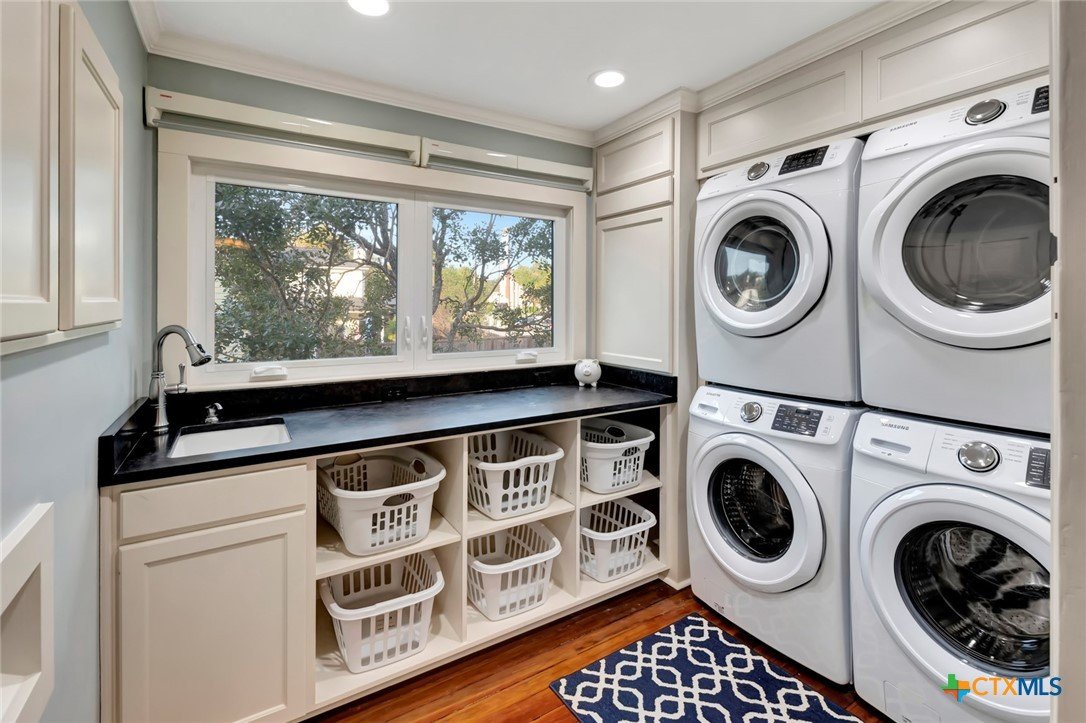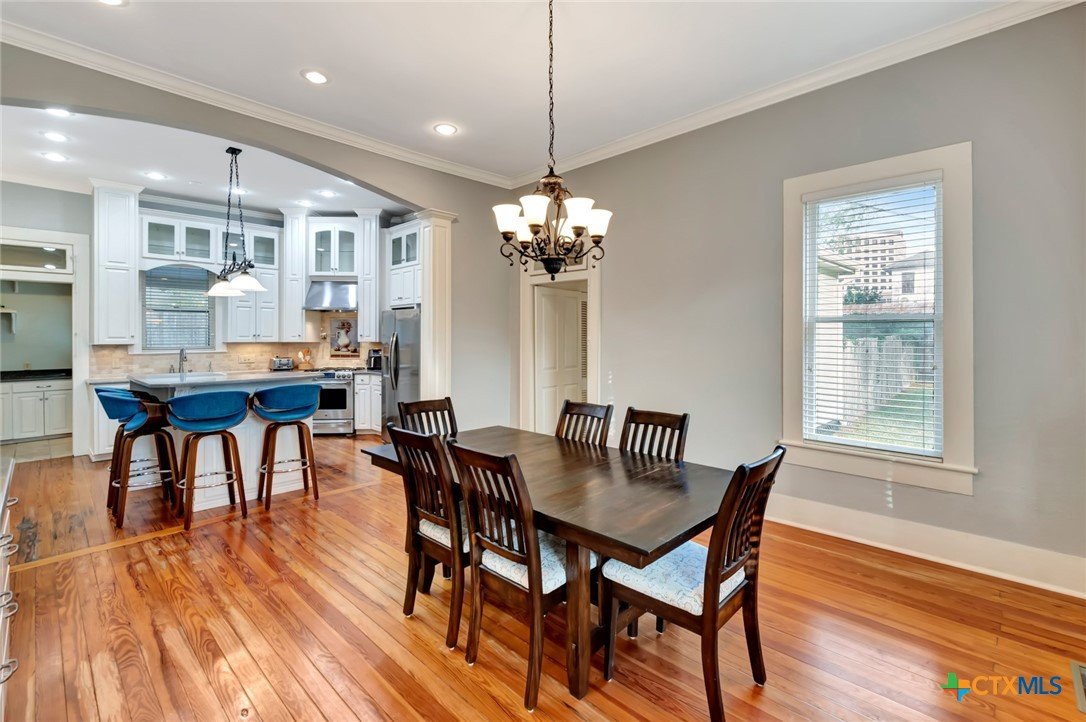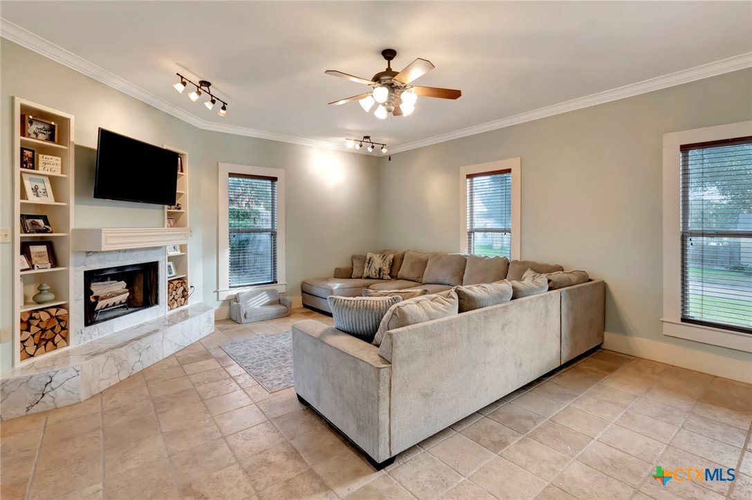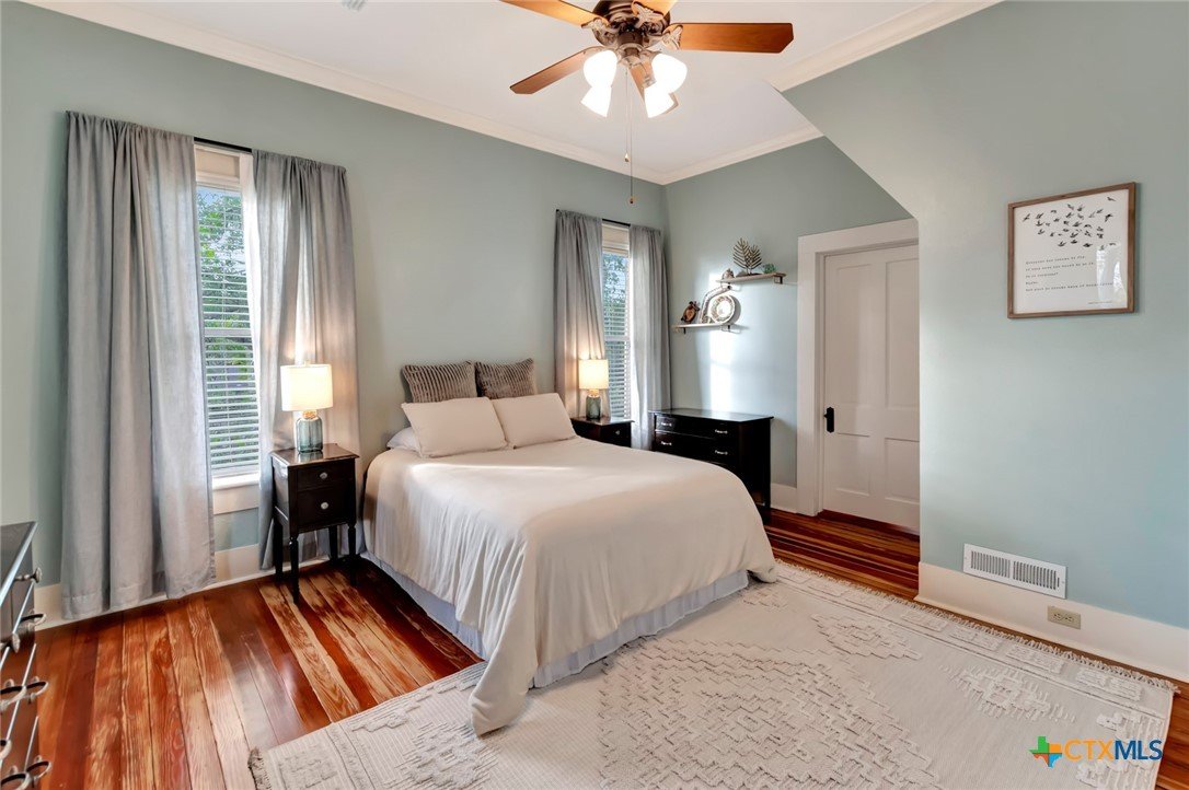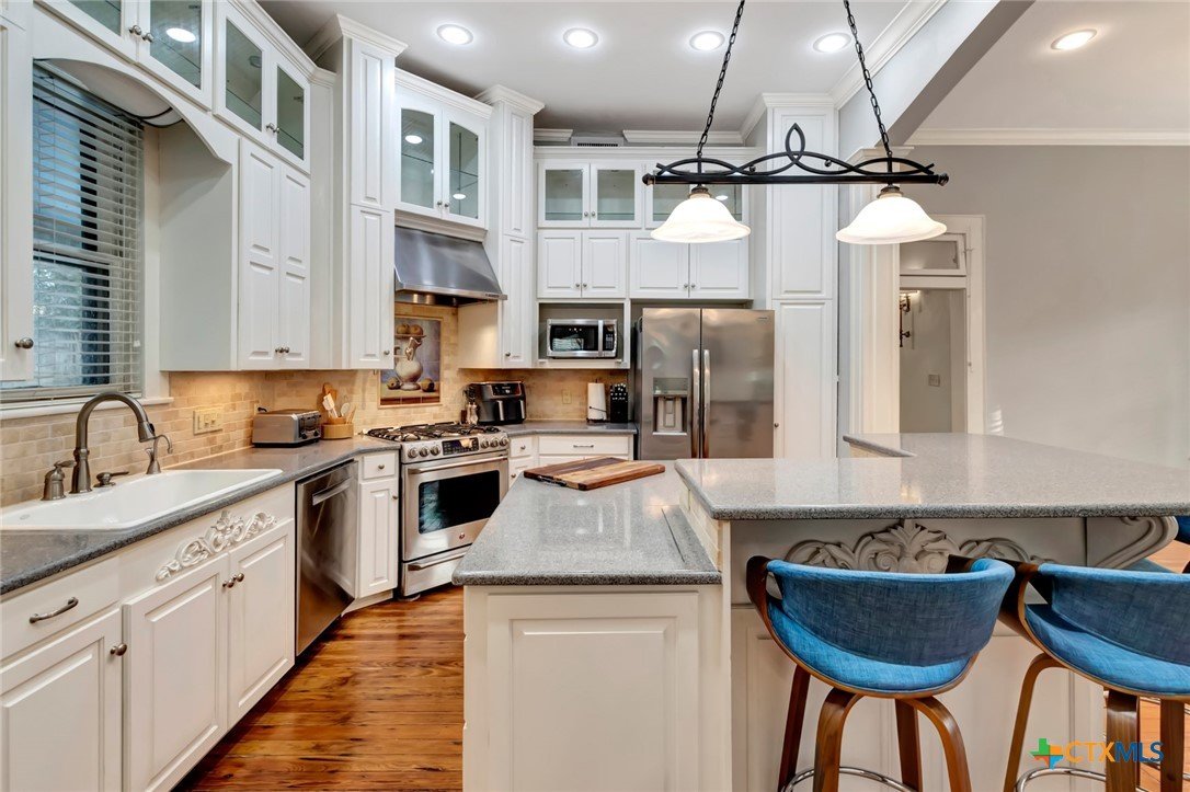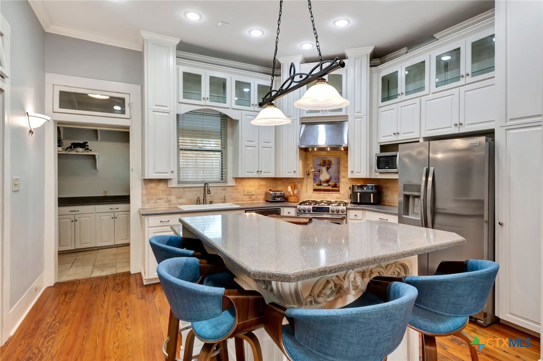 Circa 1850, the historic Old Casino Hall, also known as the Charles Hewitt House, embodies the charm of Victorian architecture while offering modern comforts. Upon entering, the spacious ground floor welcomes you with formal living and dining rooms, featuring pristine pocket doors. The chef's kitchen, complete with Silestone countertops, a gas range, and a large island, provides ample space for culinary gatherings. A cozy den on the main floor, complete with a full bathroom, opens onto an expansive back porch overlooking the generous backyard. The second floor features four well-appointed bedrooms, two full baths, and a thoughtfully designed laundry room equipped with two full-size washers and two full-size dryers, all included in the sale. On the third floor, you'll find ample storage, an additional bedroom, and a full bath, ideal for guests or a private retreat. The oversized three-car garage offers a great in home gym and a spacious apartment above with a full bath and kitchenette. Enjoy all that 408 W. Forrest has to offer, located in the heart of Old Victoria.