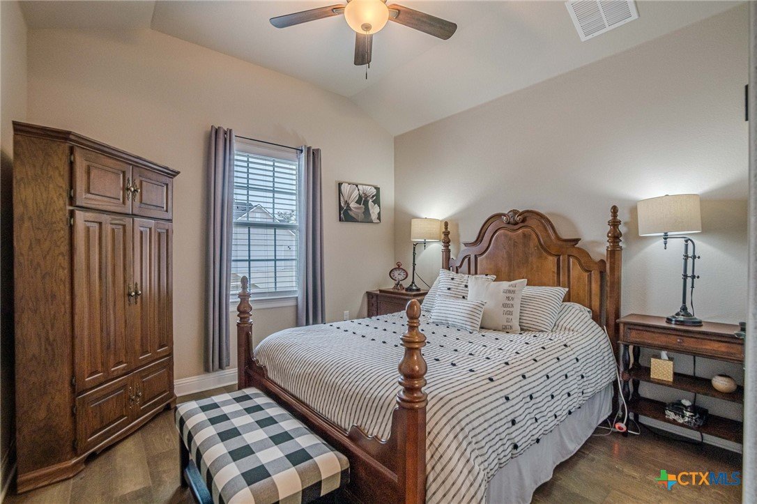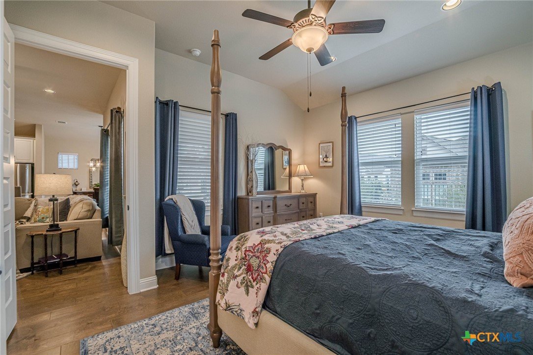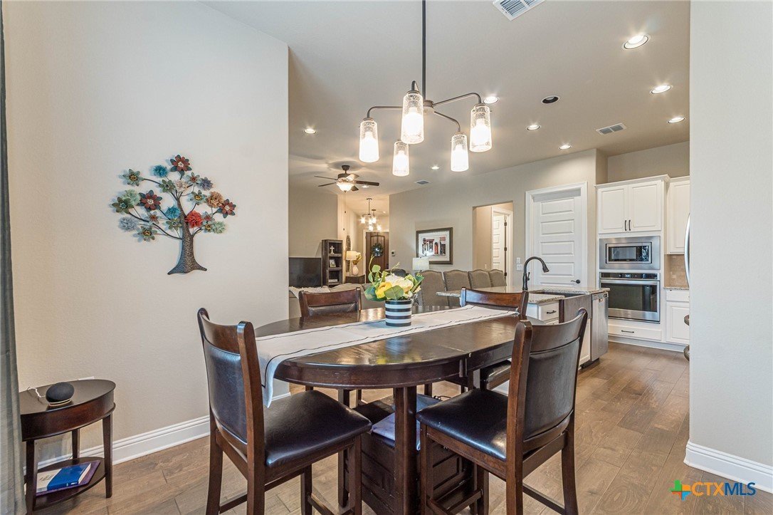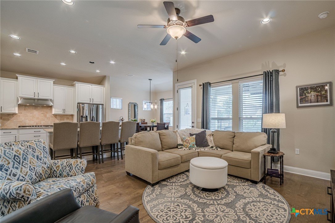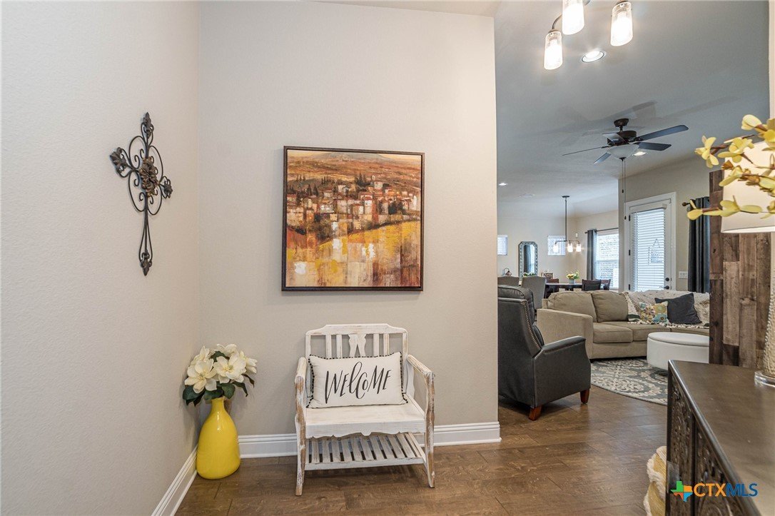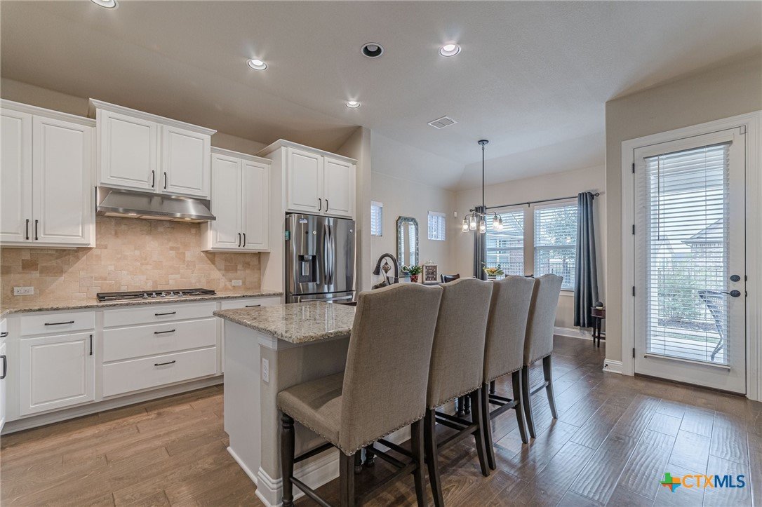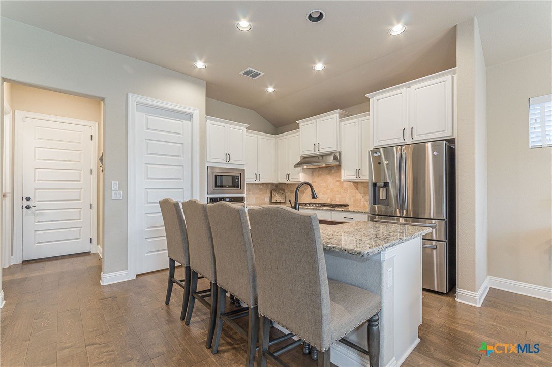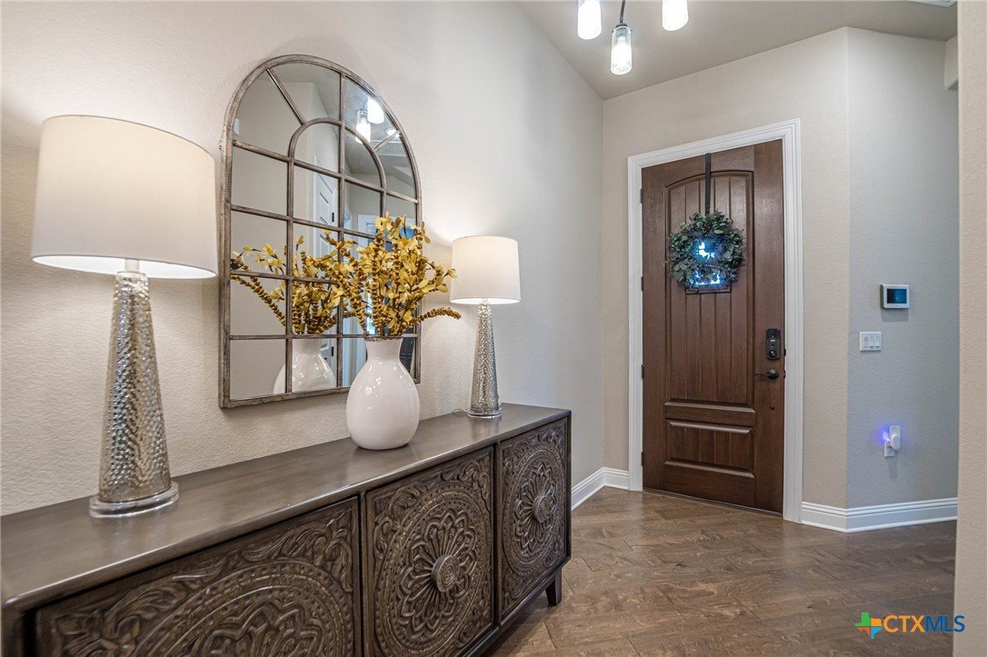 This beautifully upgraded home features a desirable split floor plan with 9' ceilings, 8' doors, a clay roof, engineered hardwood & tile floors. The stylish kitchen boasts granite countertops, large pantry, 5-burner gas cooktop, stainless steel appliances, bar seating for 4 & a dining area overlooking the back yard. The spacious primary suite offers a luxurious walk-in shower with bench seating, walk-in closet & lots of natural light. The home also includes a salt-free whole-house water softener/conditioner & a new row of bushes along the back for privacy. Living in Kissing Tree isn’t just about the home—it’s about the lifestyle. Residents enjoy 20 acres of resort-style amenities, including a resort-style pool, an indoor/outdoor activity pool, an 18-hole Troon golf course, a café, a restaurant, multiple bars, and a Biergarten. The community also offers a state-of-the-art fitness center, 18 pickleball courts, and a vibrant social scene with weekly live music, food trucks, and numerous social clubs and organized activities. This is an incredible opportunity to own a home in one of the most sought-after communities. Don’t miss out—schedule your tour today!