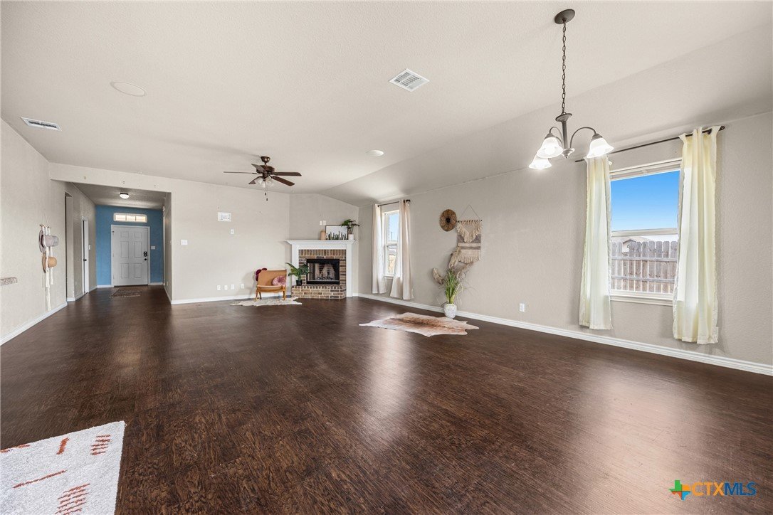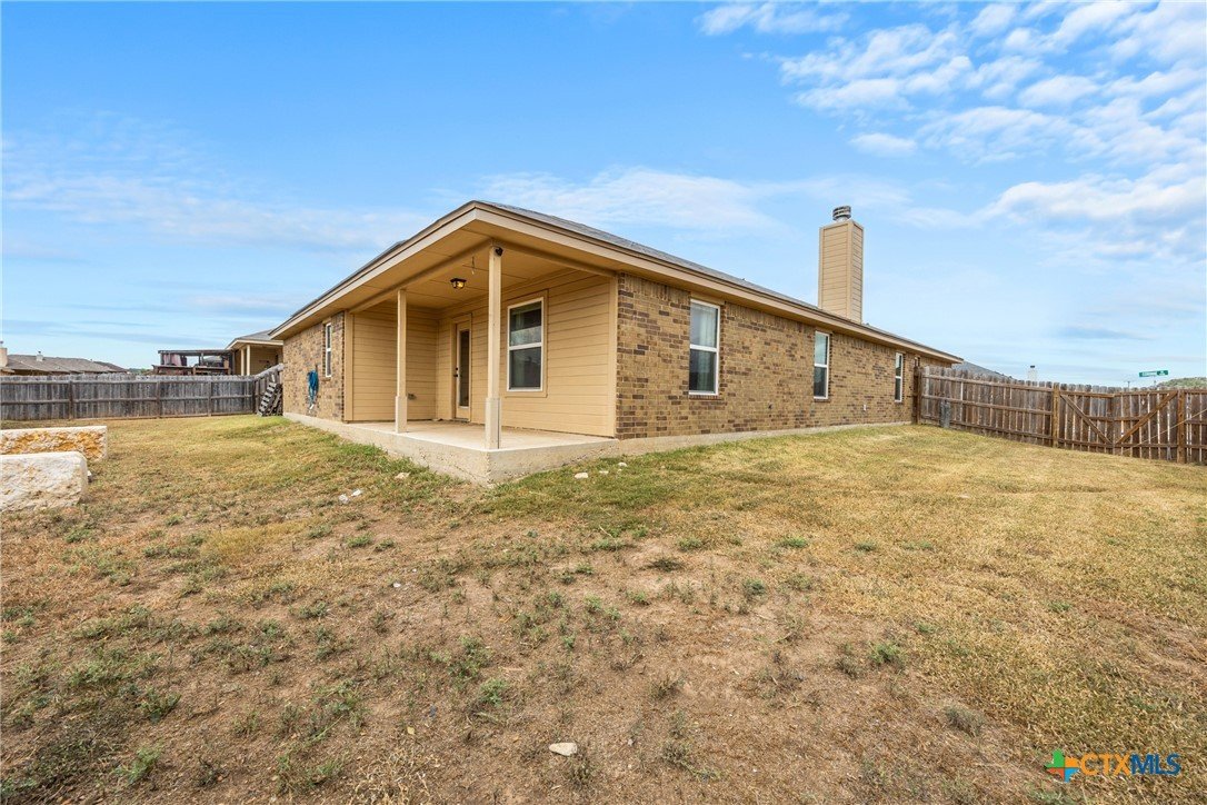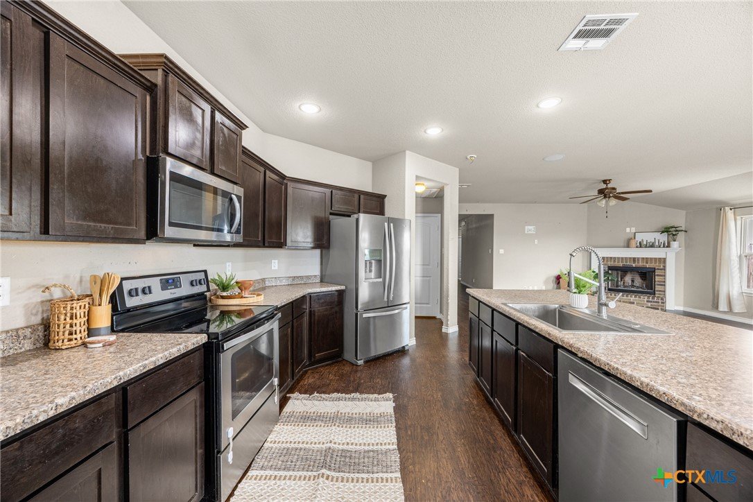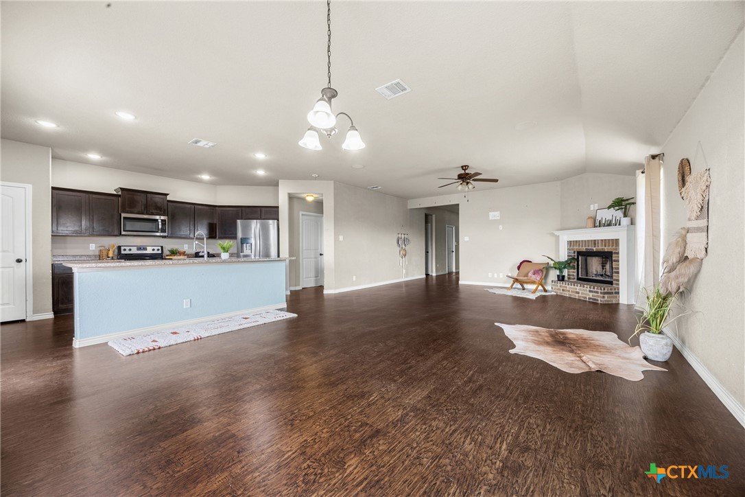 4 Bedroom Home with 3 Car Garage on Corner Lot in Goodnight Ranch! This home offers 2,228 square feet of living space and is perfectly situated on a desirable corner lot with a spacious 3 car garage. Step inside to an open-concept layout that seamlessly connects the living, dining, and kitchen areas; ideal for entertaining or family gatherings. The living room offers ample space and a charming brick wood-burning fireplace for cozy nights in. The kitchen features a large island and breakfast bar with sink, granite countertops, stainless steel appliances, recessed lighting, and plenty of cabinetry. The primary suite boasts high ceilings and a luxurious en-suite bathroom with a walk-in shower featuring dual shower heads, a double vanity, and a walk-in closet. A secondary bedroom also includes a private en-suite, while the remaining bedrooms offer plush carpet and ceiling fans for comfort. Outside, enjoy a covered patio, fire pit, and a private backyard perfect for relaxing or entertaining. Conveniently located near schools, shopping, restaurants, and medical facilities, with a short drive to Fort Hood and easy access to Highway 195 and Austin. Schedule your showing today! Home is being sold AS IS. BRING ALL OFFERS!