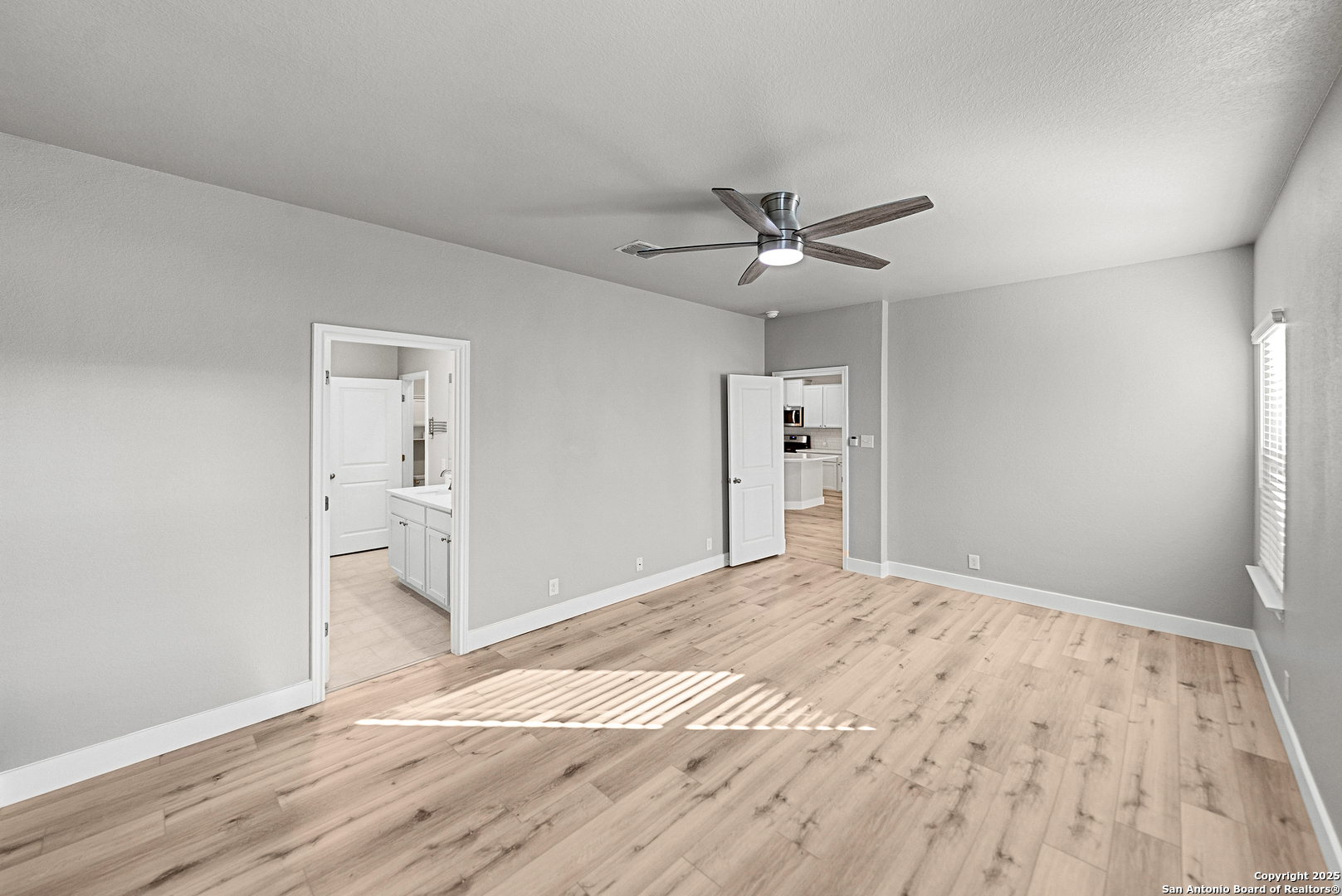 This pristine 5-bedroom, 3.5-bath home boasts excellent curb appeal and is nestled within the neighborhood, surrounded by a greenbelt with only one direct neighbor! Not to mention, it's within walking distance to the fabulous resort-style amenities that make every day feel like a vacation! The thoughtfully designed, open-concept living room and kitchen are filled with natural light and offer an airy layout ideal for easy entertaining while cooking. Speaking of cooking-this classic white kitchen shows like a model home and comes equipped with stainless steel appliances, a gas cooktop, recessed lighting, a pantry, gorgeous white quartz countertops, a subway tile backsplash, and on-trend flooring that flows throughout the main areas. The first-floor split primary bedroom offers privacy and a relaxing retreat, complete with an en-suite featuring a large walk-in closet, dual sink vanity with quartz countertops, a spacious walk-in shower, and an oversized soaking tub-perfect for unwinding after a long day. Upstairs, you'll find four additional bedrooms, two full bathrooms, and an expansive game room that provides the perfect entertainment space-ideal for movie nights and game nights with friends and family! Outside, you'll find a huge private backyard with a large covered patio-an ideal setting for many future gatherings. Centrally located with easy access to major routes, shopping, dining, and nearby conveniences, this one truly checks all the boxes and won't last long!