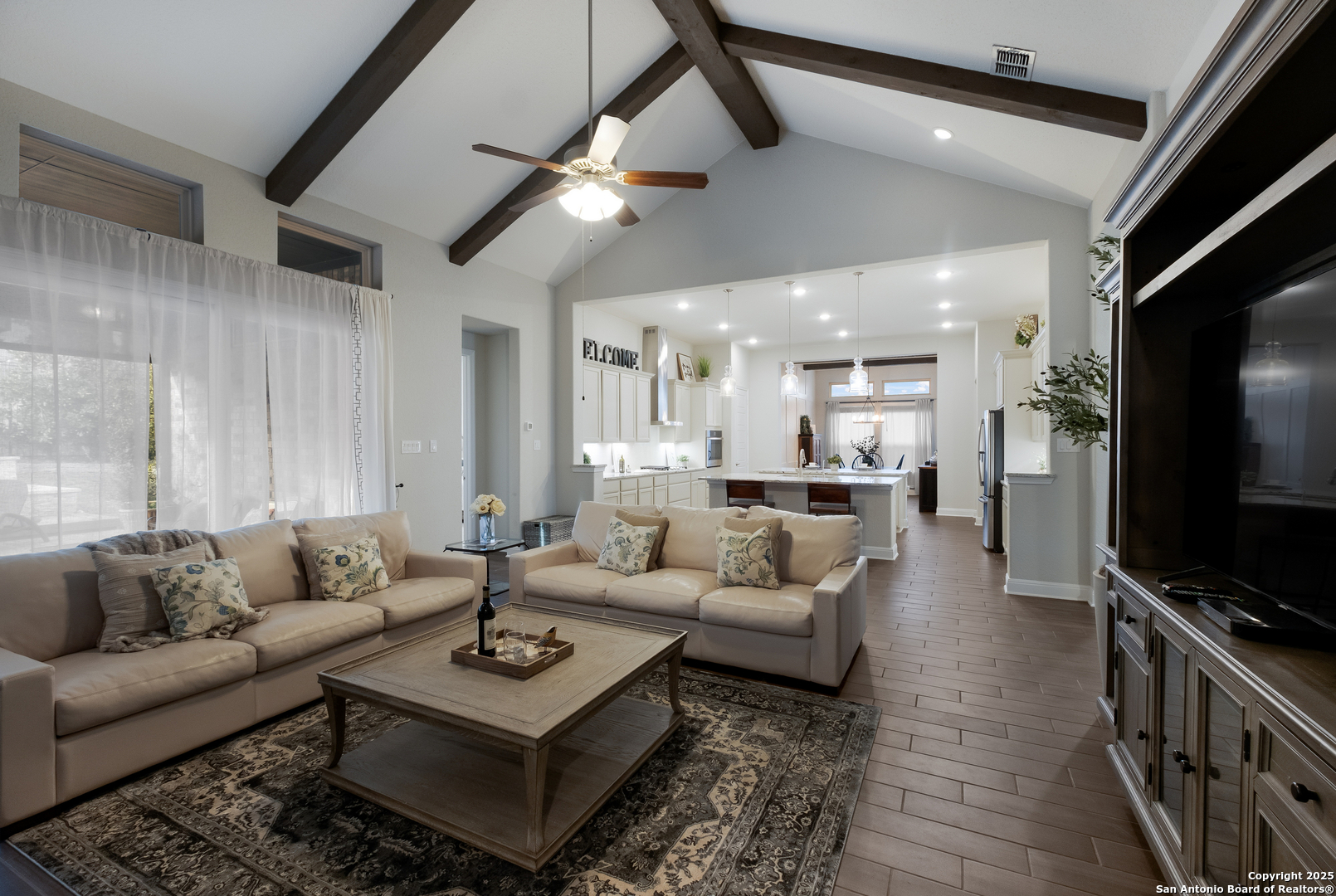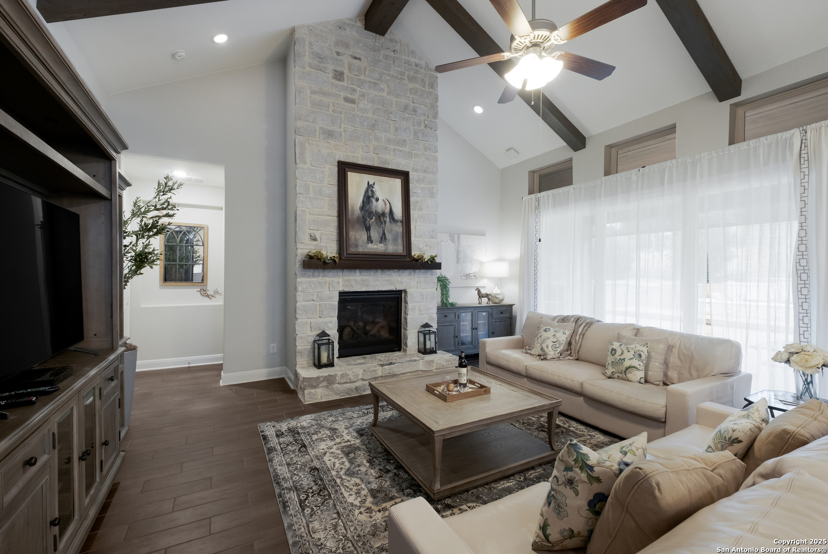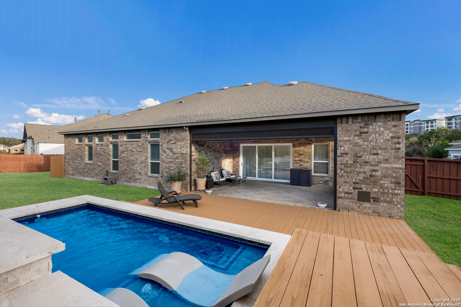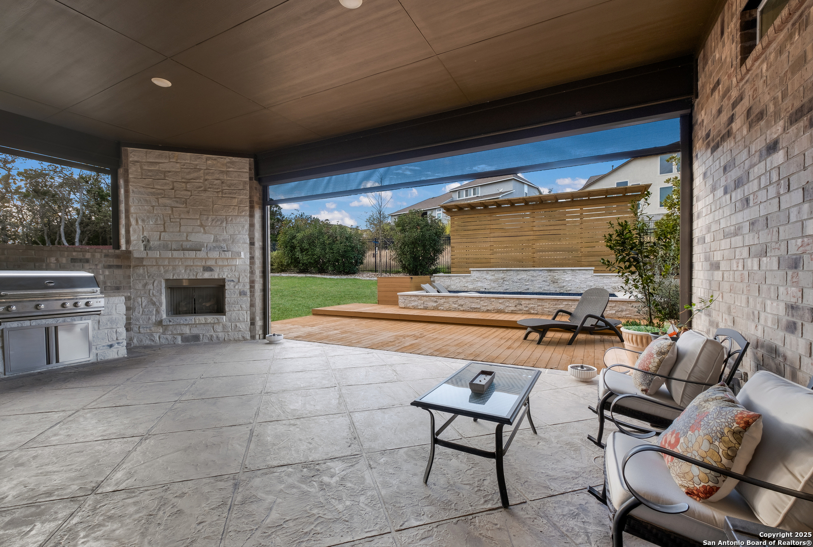 Experience luxury living in the exclusive gated community of Cibolo Canyons, conveniently located near the JW Marriott Resort and TPC Golf Course. This remarkable one-story home, nestled at the end of a quiet cul-de-sac, boasts a brick-and-stone exterior, an oversized driveway, and a grand double-door entry that sets the tone for what awaits inside. Step into the expansive foyer, where vaulted ceilings and wood beam details in the living room and study create an atmosphere of timeless elegance. The open-concept living area features a cozy fireplace and seamlessly connects to the chef's kitchen. This culinary haven is equipped with double kitchen islands, stainless steel appliances, gas cooking, and cabinets thoughtfully placed on both sides of the kitchen and within the islands, offering exceptional storage and functionality. The spacious primary bedroom is a private retreat, featuring an en-suite bath with double vanities, a luxurious soaker tub, and a stand-alone shower. The large laundry room is equally impressive, offering additional cabinets, counter space, and a sink for maximum convenience. Outside, the oversized backyard is your personal paradise. Entertain effortlessly in the outdoor kitchen, complete with a built-in grill, fireplace, and remote-operated shades, all perfectly situated to enjoy the surrounding beauty. A sparkling pool and pergola provide the ideal setting for relaxing or hosting gatherings, while the outdoor space remains practical with pool equipment fencing and ample storage. With its three-car garage, premium finishes, and thoughtful design, this home offers unparalleled comfort and convenience. Whether you're entertaining in style or enjoying quiet moments in your backyard oasis, this property is designed for both relaxation and sophistication. This is where your next chapter begins!