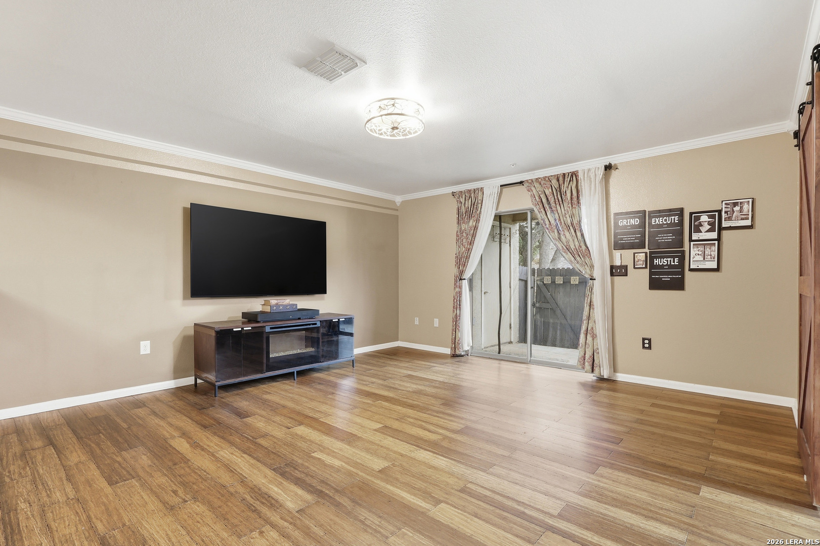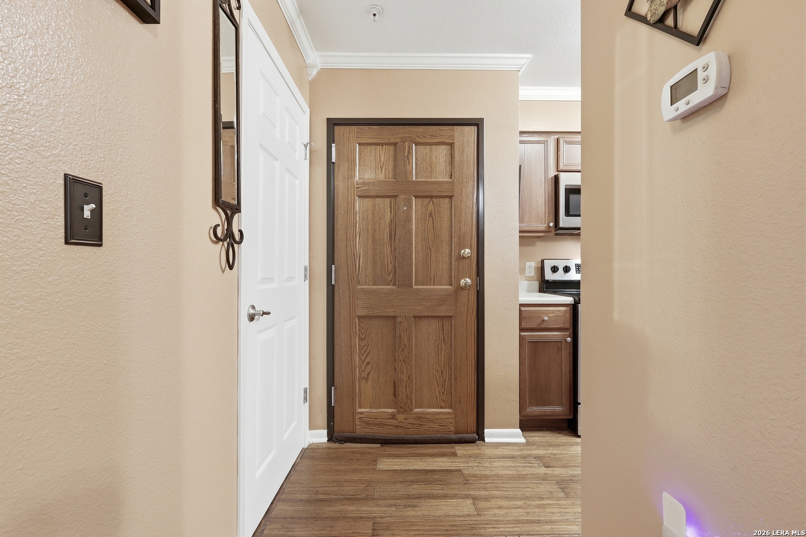 Charming first-floor condo in the heart of San Antonio's Medical Center! This inviting 1 bed, 1 bath unit in Castlewood Condos offers a quiet setting with a secure building and easy access to I-10, 410 & 1604. Featuring an open layout with wood flooring, crown molding, and stylish barn doors, plus ceiling fans throughout for added comfort. All appliances convey-including washer, dryer, 75" TV & soundbar. Enjoy a private covered patio with fenced design. Minutes from hospitals, shopping, dining, downtown & the airport-perfect for homeowners or a savvy investment!
