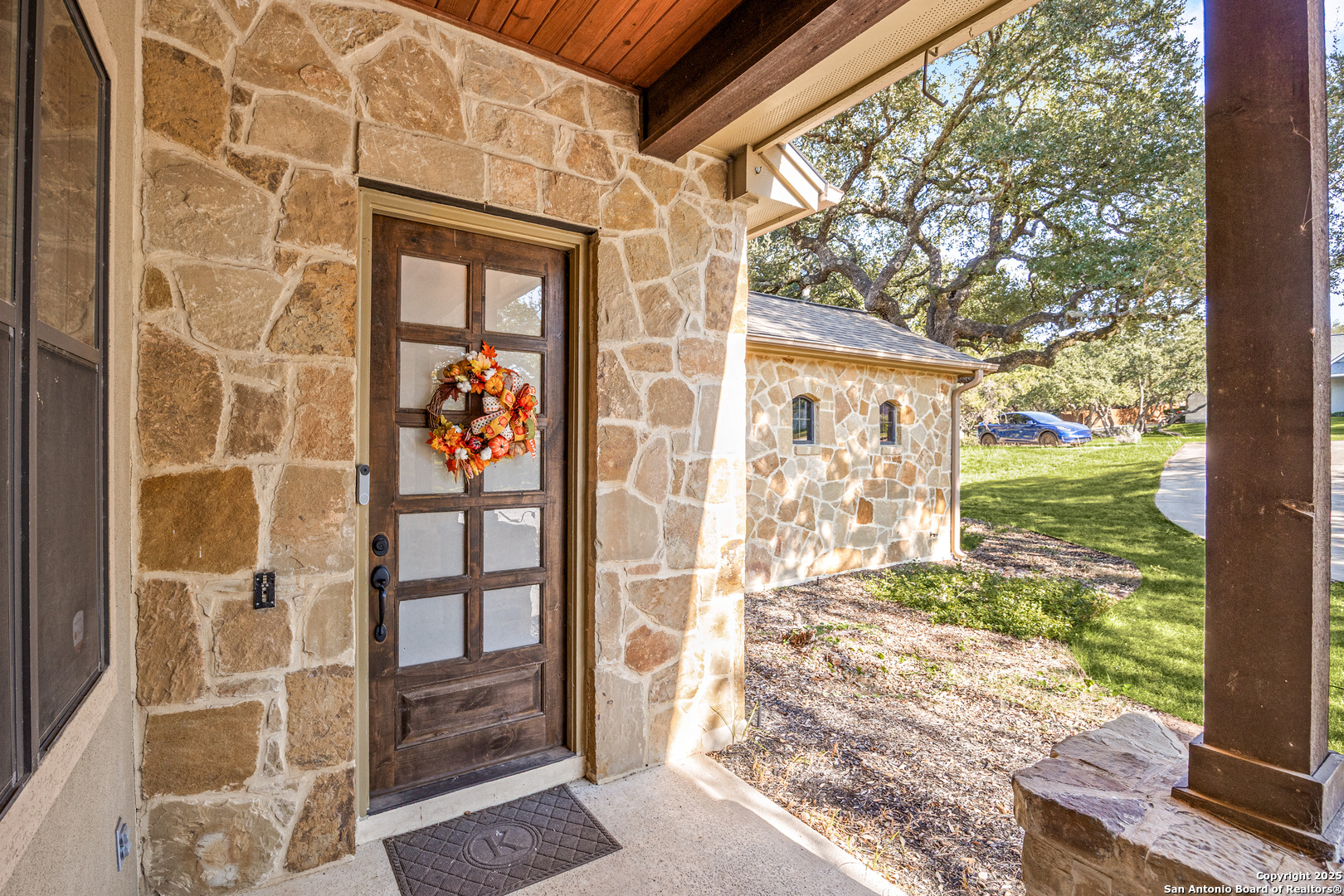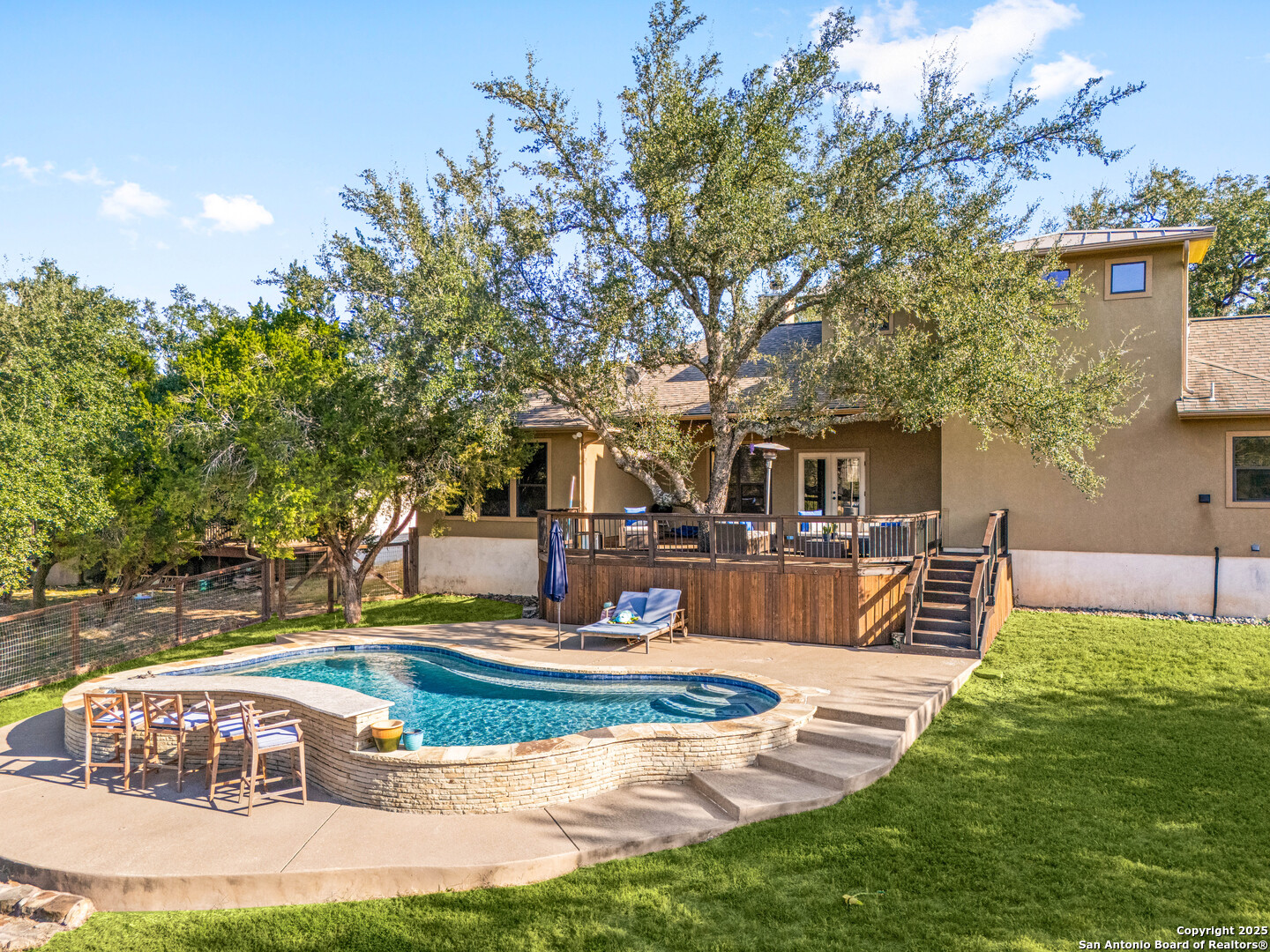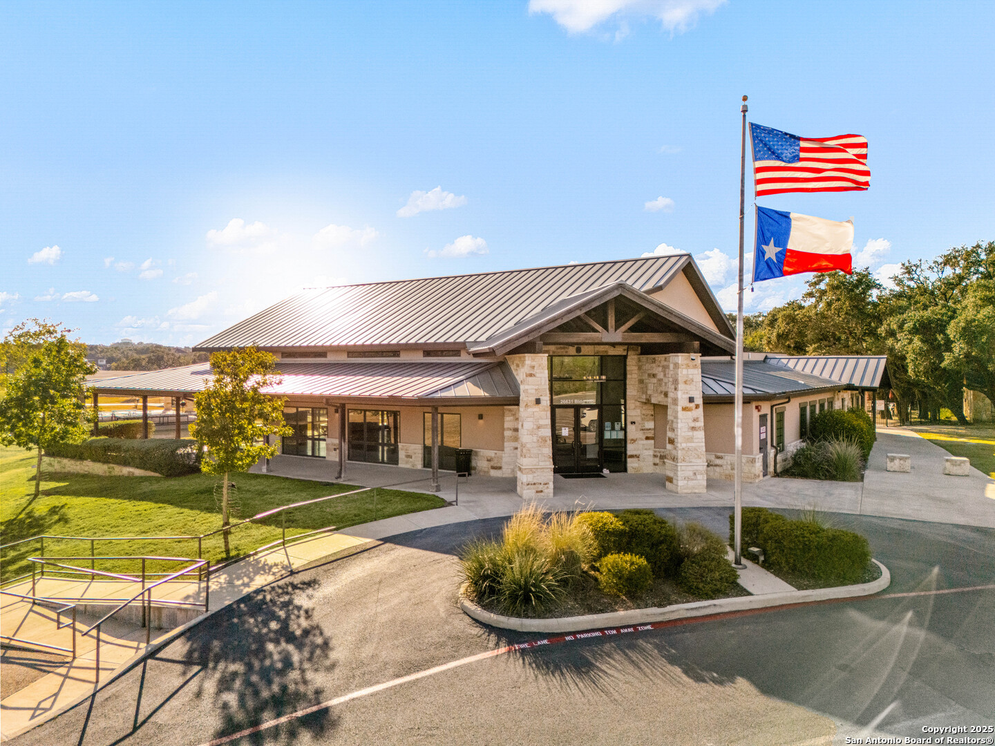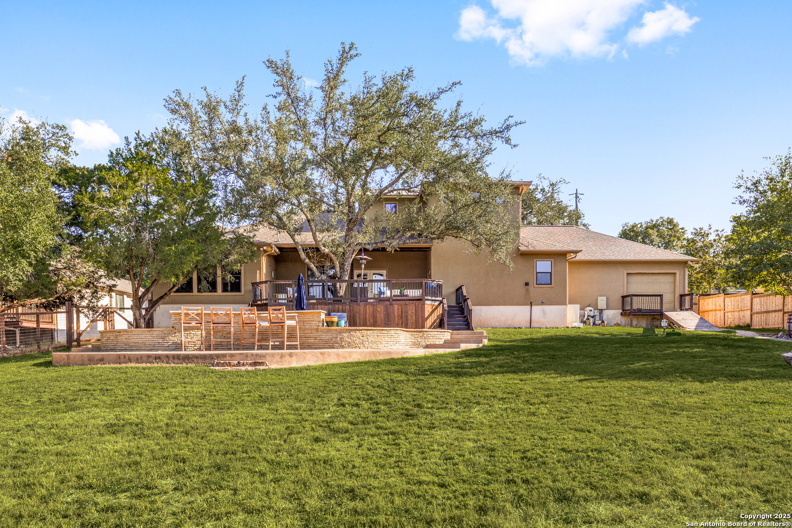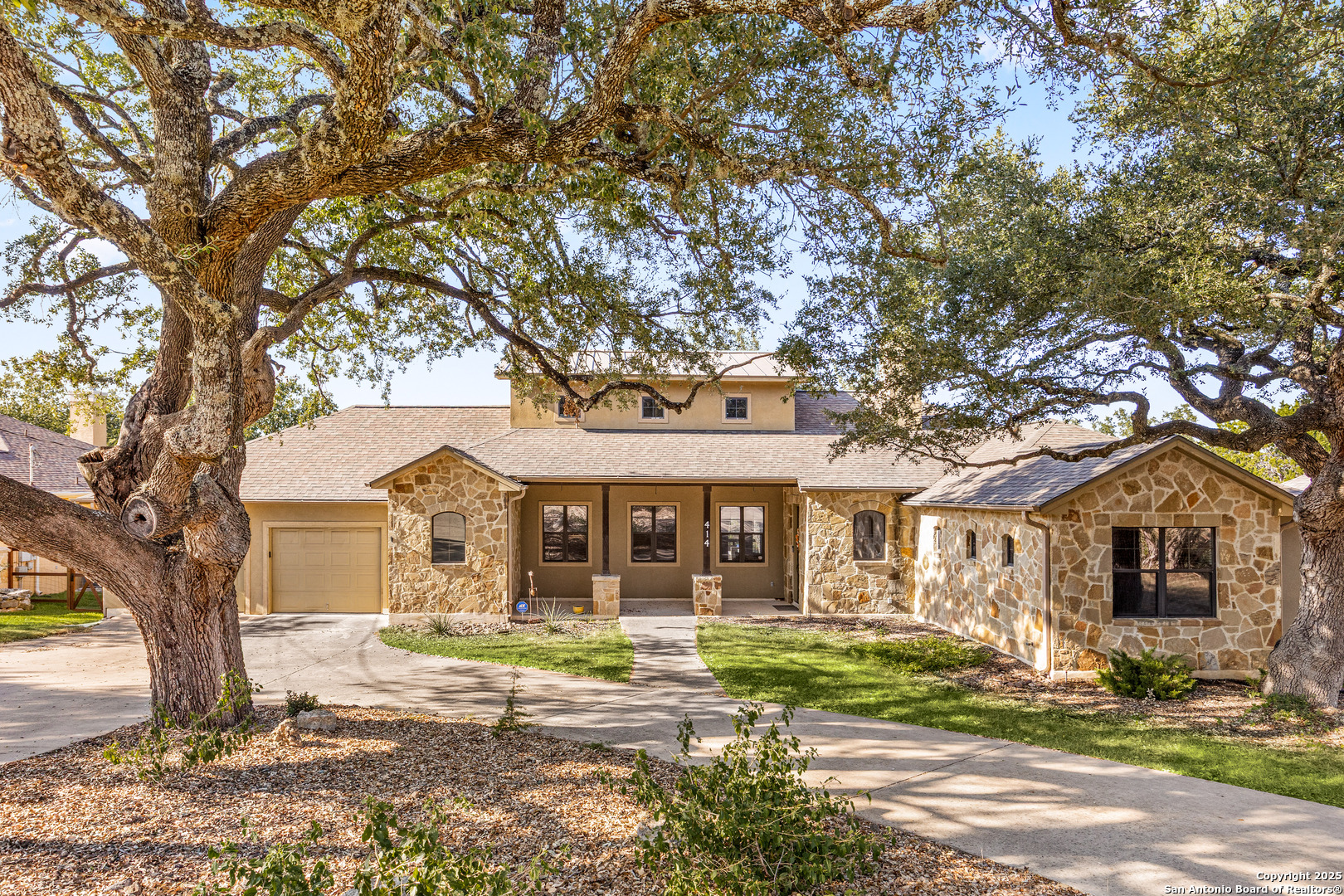 Incredible Opportunity to Own a Slice of Country Paradise! This stunning rustic Hill Country-style home, built by Serenity Custom Homes, is nestled on a Texas-sized 0.61-acre lot surrounded by mature trees and nature-inspired settings. With showstopping curb appeal and a spacious front porch, it's the perfect spot to enjoy your morning coffee at sunrise or unwind after a long day. Inside, the 1.5-story open floor plan was thoughtfully designed for seamless indoor-outdoor living, ideal for both everyday comfort and entertaining. Exquisite craftsmanship shines throughout - from the cozy floor-to-ceiling stone fireplace and sliding barn door, to the custom wood trim framing the family room entryway, adding warmth and rustic sophistication. The main-level primary retreat offers a private escape with a large walk-in closet, walk-in shower, and soaking tub - a perfect place to relax and recharge. Upstairs, the expansive 4th bedroom with its own full bath provides flexibility for a guest suite, mother-in-law retreat, or an impressive game or media room tailored to your needs. Step outside to your one-of-a-kind backyard oasis, featuring a large deck overlooking the sparkling pool - the ultimate backdrop for entertaining or enjoying peaceful Texas evenings. Located in a community with resort-style amenities, this home delivers the feeling of a year-round vacation. Truly, a rare find that captures the perfect balance of rustic charm and modern comfort.