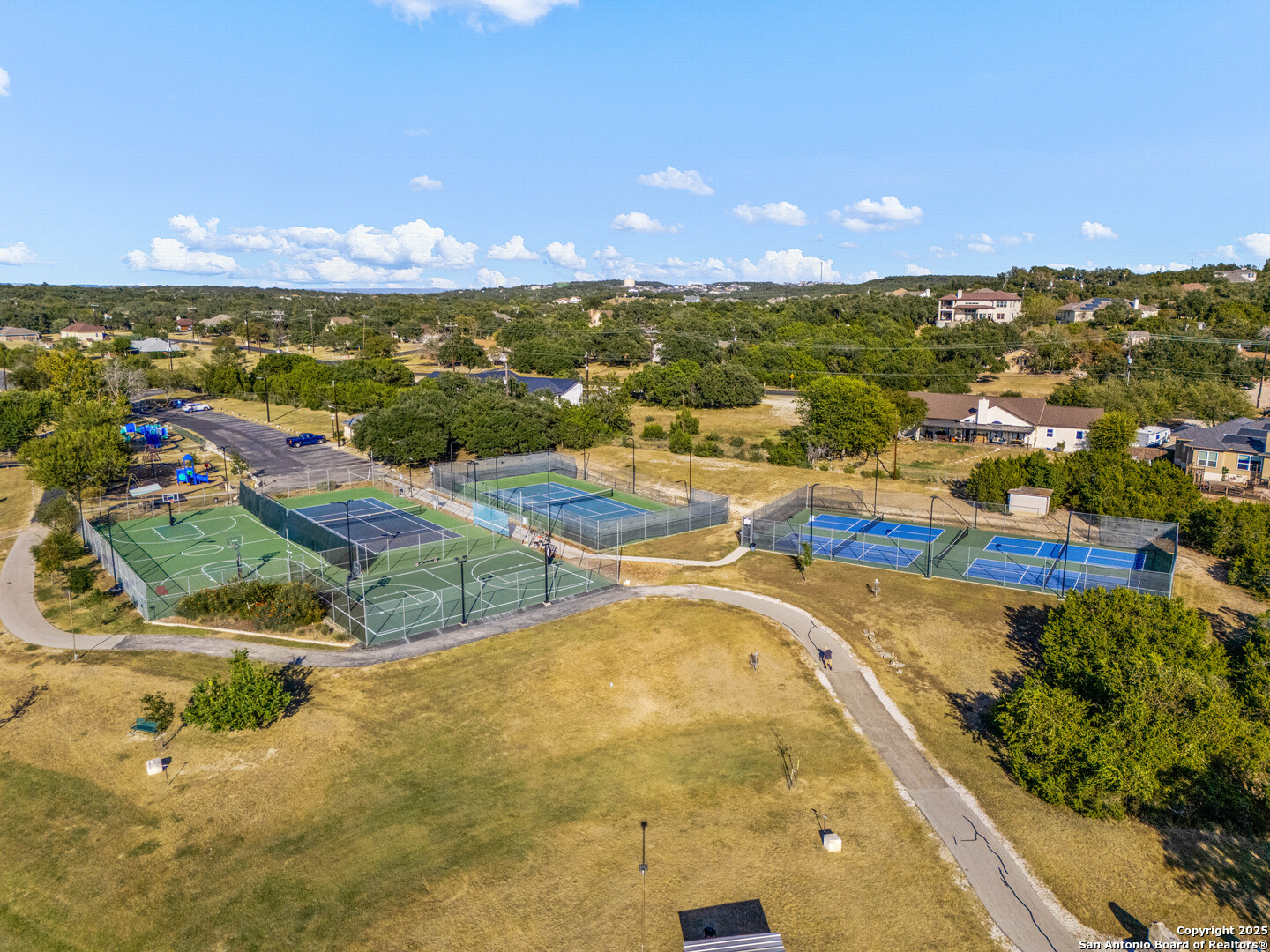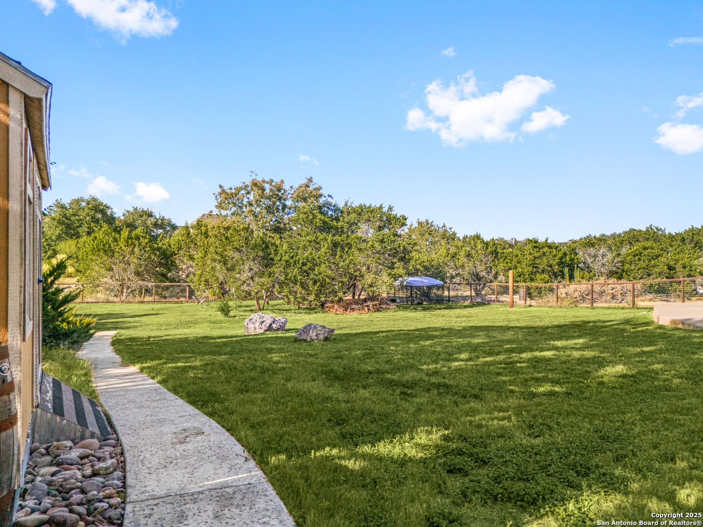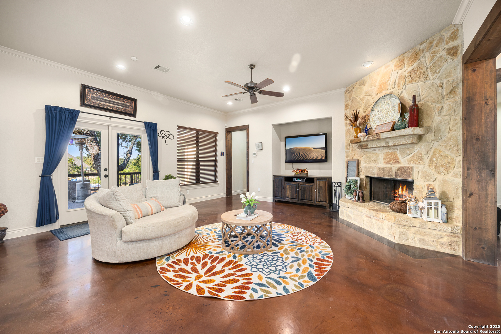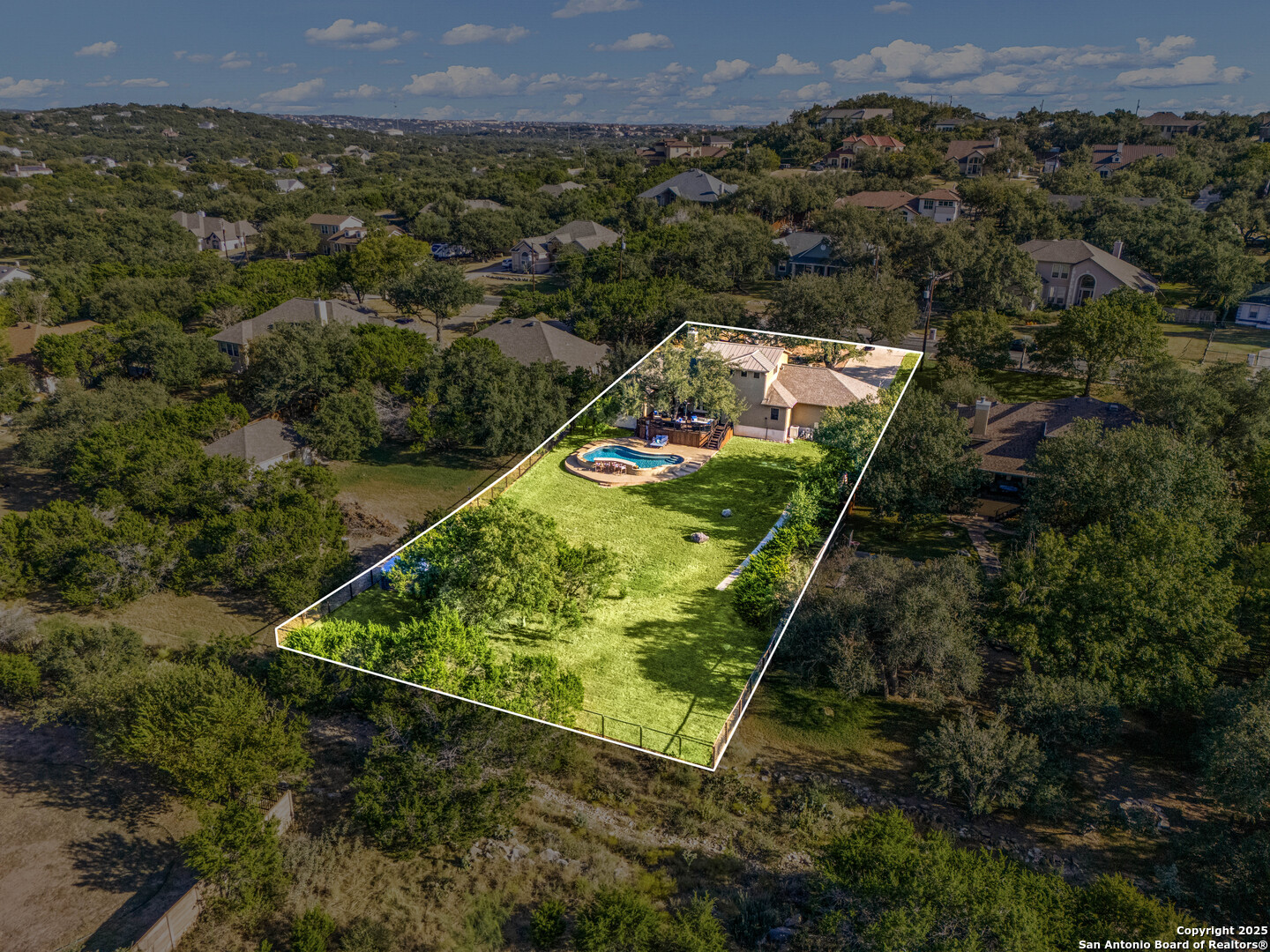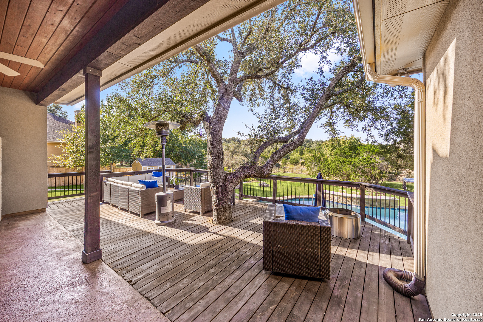 Incredible Opportunity to Own a Slice of Country Paradise! This stunning rustic Hill Country-style home, built by Serenity Custom Homes, is nestled on a Texas-sized 0.61-acre lot surrounded by mature trees and nature-inspired settings. With showstopping curb appeal and a spacious front porch, it's the perfect spot to enjoy your morning coffee at sunrise or unwind after a long day. Inside, the 1.5-story open floor plan was thoughtfully designed for seamless indoor-outdoor living, ideal for both everyday comfort and entertaining. Exquisite craftsmanship shines throughout - from the cozy floor-to-ceiling stone fireplace and sliding barn door, to the custom wood trim framing the family room entryway, adding warmth and rustic sophistication. The main-level primary retreat offers a private escape with a large walk-in closet, walk-in shower, and soaking tub - a perfect place to relax and recharge. Upstairs, the expansive 4th bedroom with its own full bath provides flexibility for a guest suite, mother-in-law retreat, or an impressive game or media room tailored to your needs. Step outside to your one-of-a-kind backyard oasis, featuring a large deck overlooking the sparkling pool - the ultimate backdrop for entertaining or enjoying peaceful Texas evenings. Located in a community with resort-style amenities, this home delivers the feeling of a year-round vacation. Truly, a rare find that captures the perfect balance of rustic charm and modern comfort.