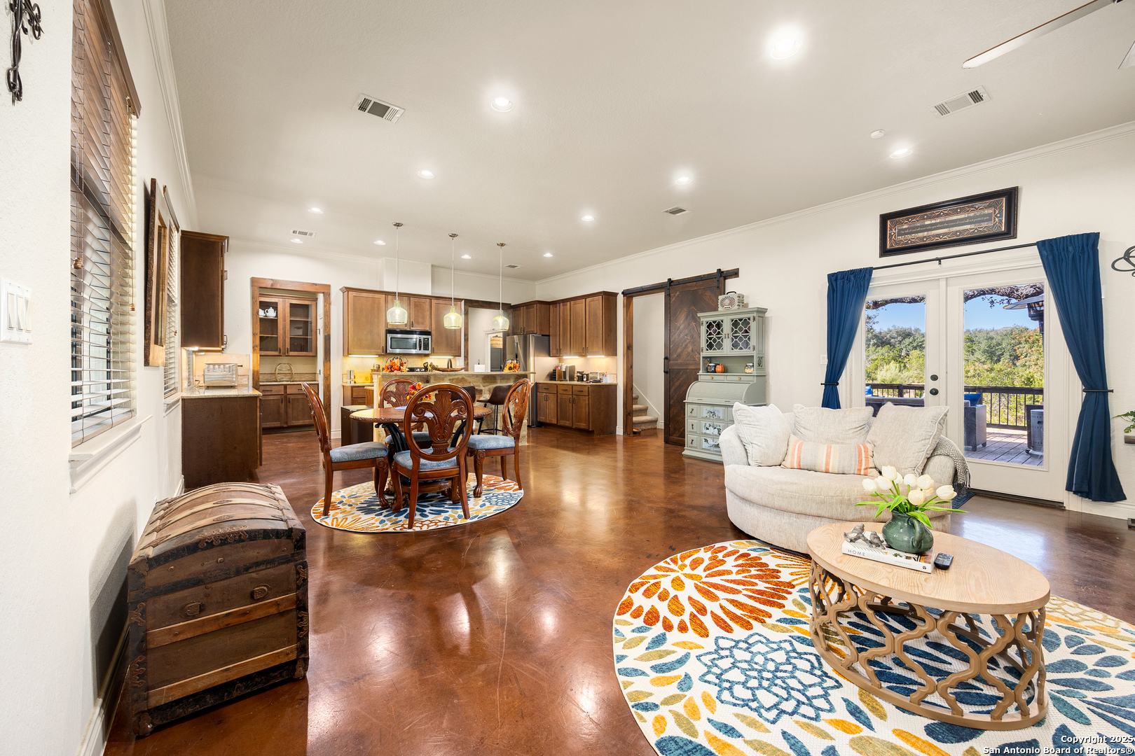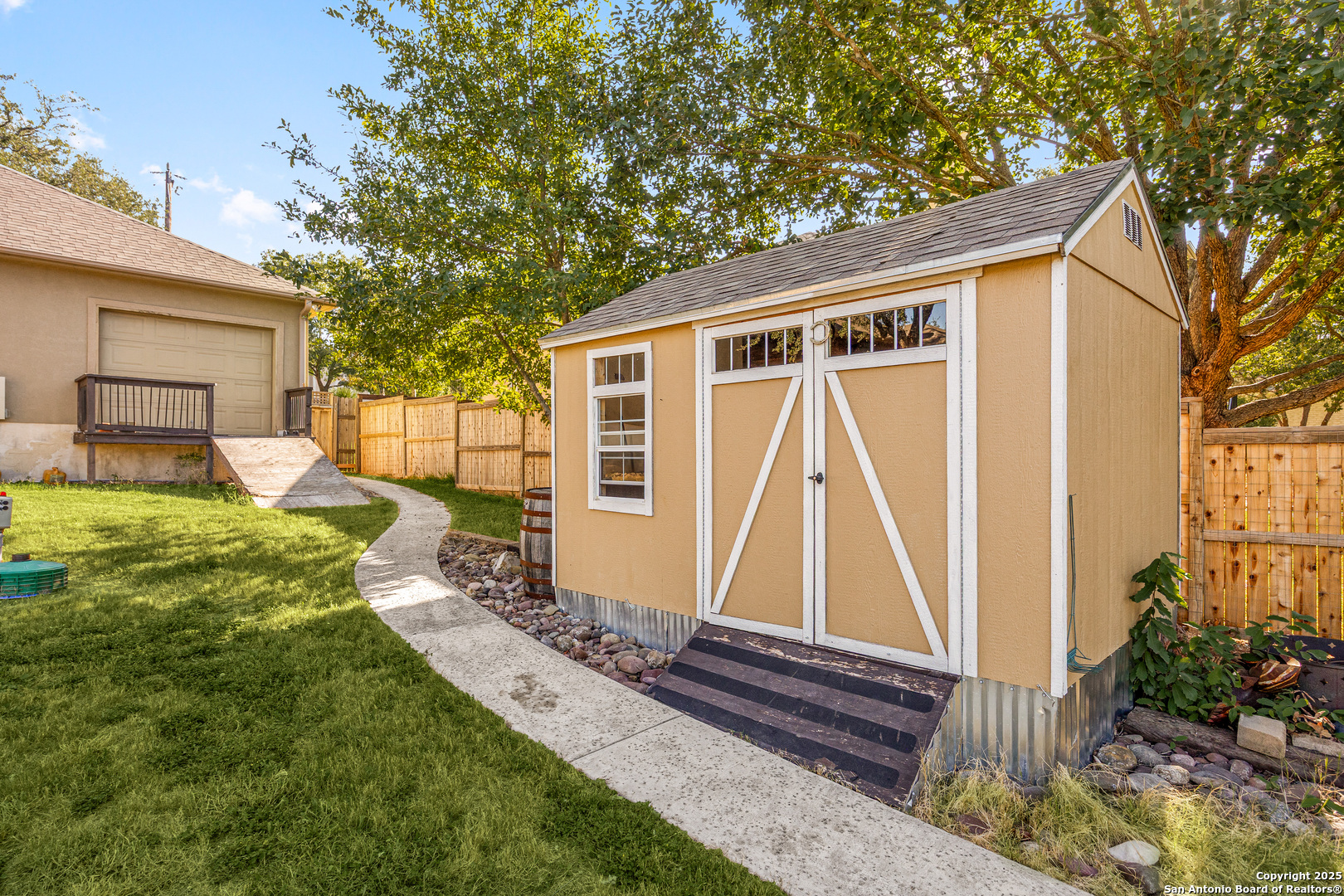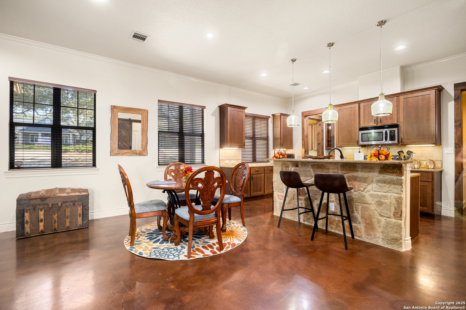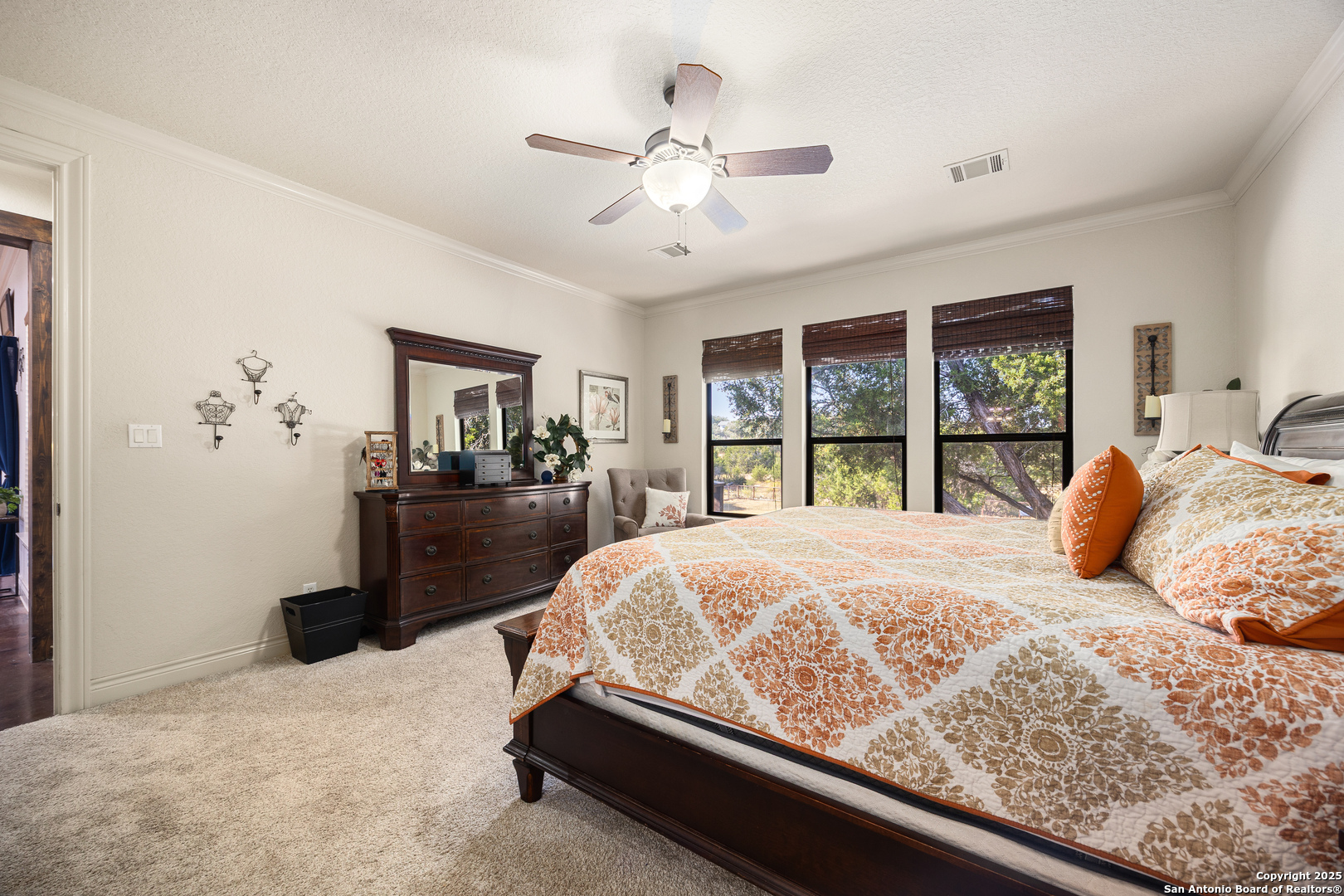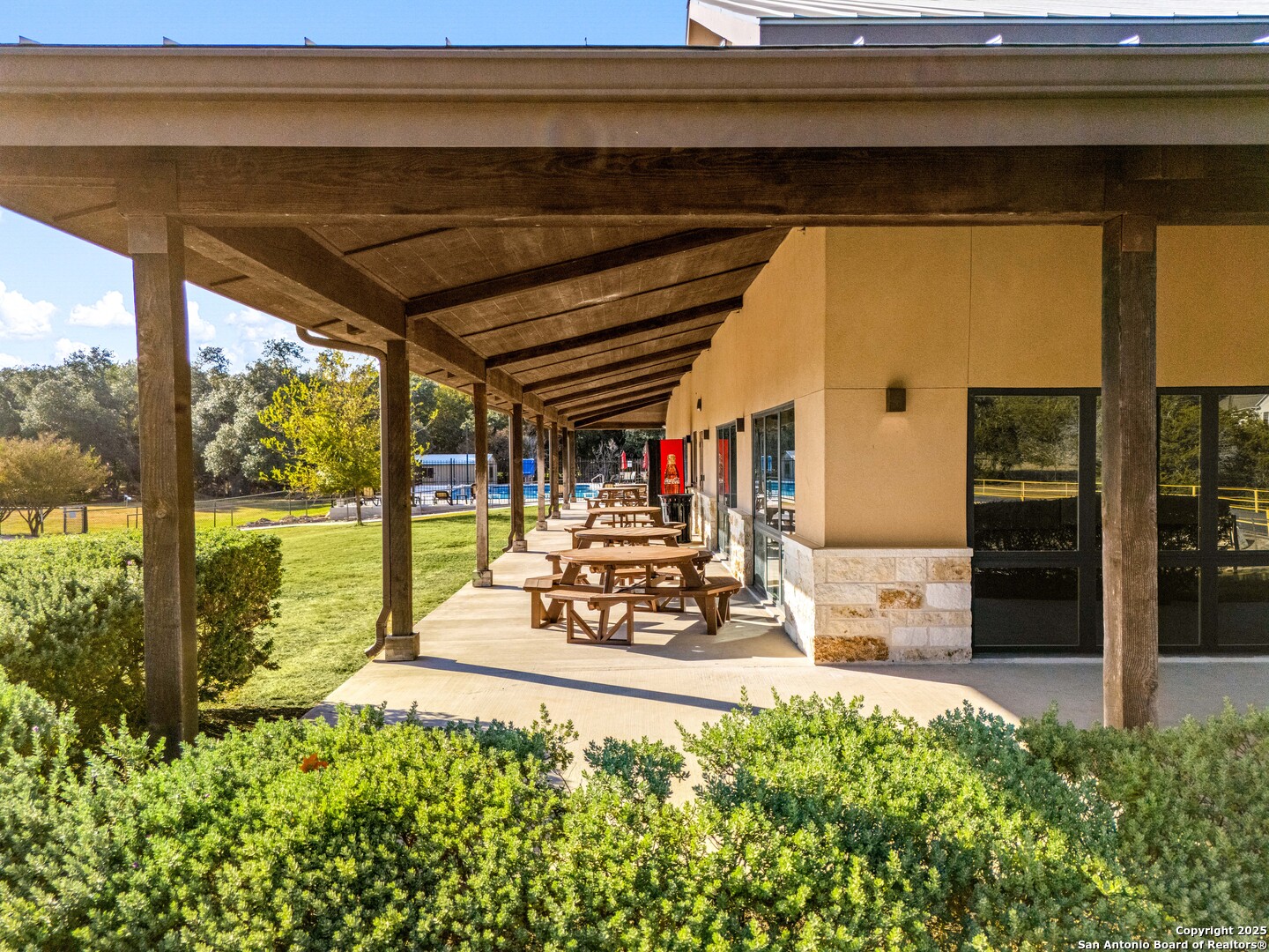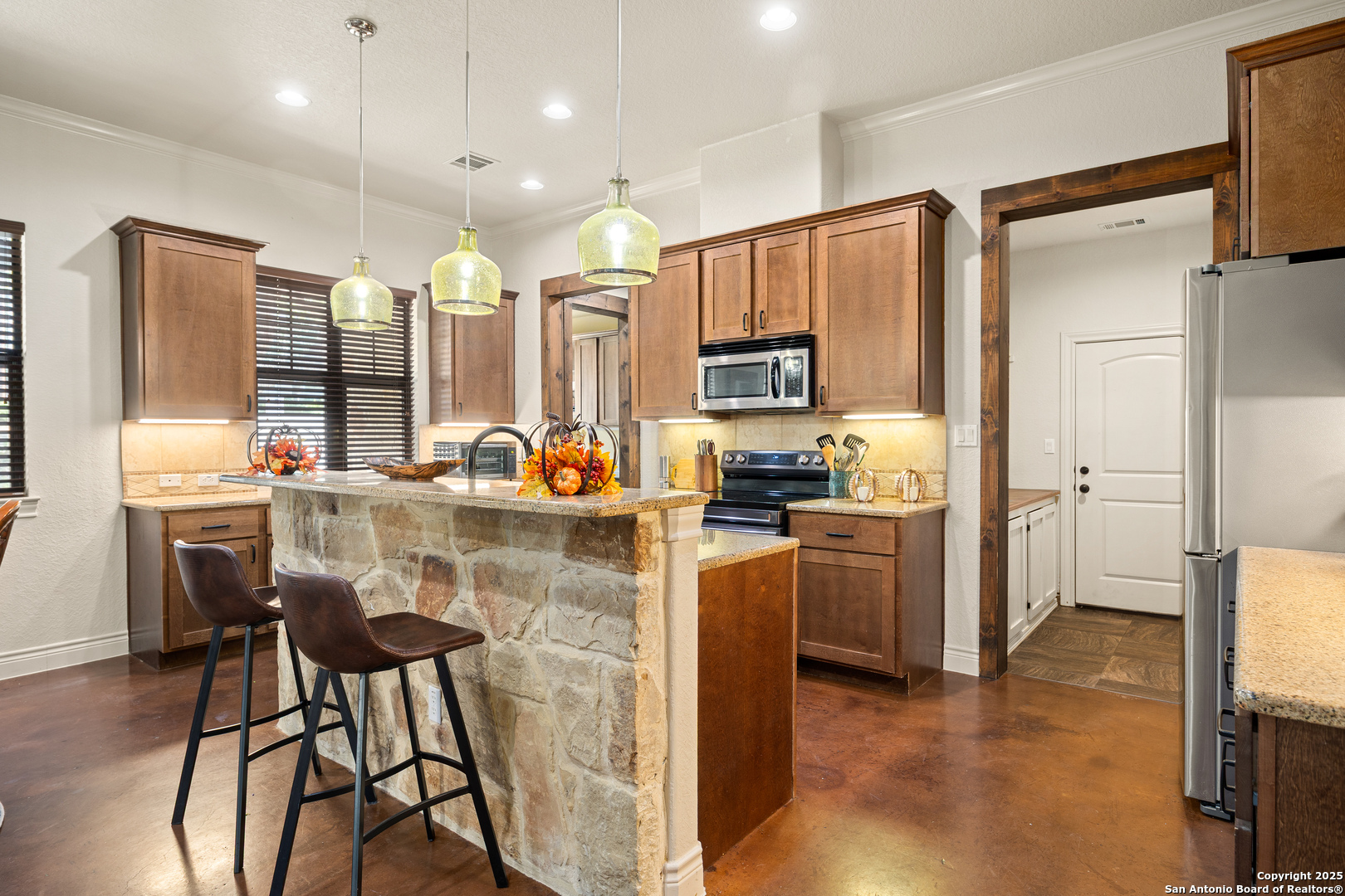 Incredible Opportunity to Own a Slice of Country Paradise! This stunning rustic Hill Country-style home, built by Serenity Custom Homes, is nestled on a Texas-sized 0.61-acre lot surrounded by mature trees and nature-inspired settings. With showstopping curb appeal and a spacious front porch, it's the perfect spot to enjoy your morning coffee at sunrise or unwind after a long day. Inside, the 1.5-story open floor plan was thoughtfully designed for seamless indoor-outdoor living, ideal for both everyday comfort and entertaining. Exquisite craftsmanship shines throughout - from the cozy floor-to-ceiling stone fireplace and sliding barn door, to the custom wood trim framing the family room entryway, adding warmth and rustic sophistication. The main-level primary retreat offers a private escape with a large walk-in closet, walk-in shower, and soaking tub - a perfect place to relax and recharge. Upstairs, the expansive 4th bedroom with its own full bath provides flexibility for a guest suite, mother-in-law retreat, or an impressive game or media room tailored to your needs. Step outside to your one-of-a-kind backyard oasis, featuring a large deck overlooking the sparkling pool - the ultimate backdrop for entertaining or enjoying peaceful Texas evenings. Located in a community with resort-style amenities, this home delivers the feeling of a year-round vacation. Truly, a rare find that captures the perfect balance of rustic charm and modern comfort.