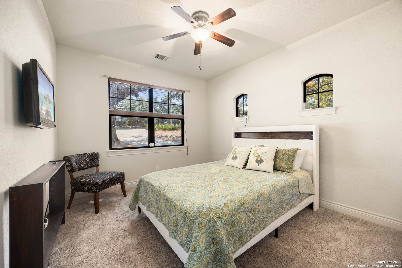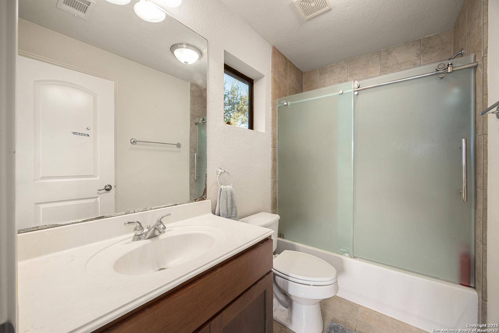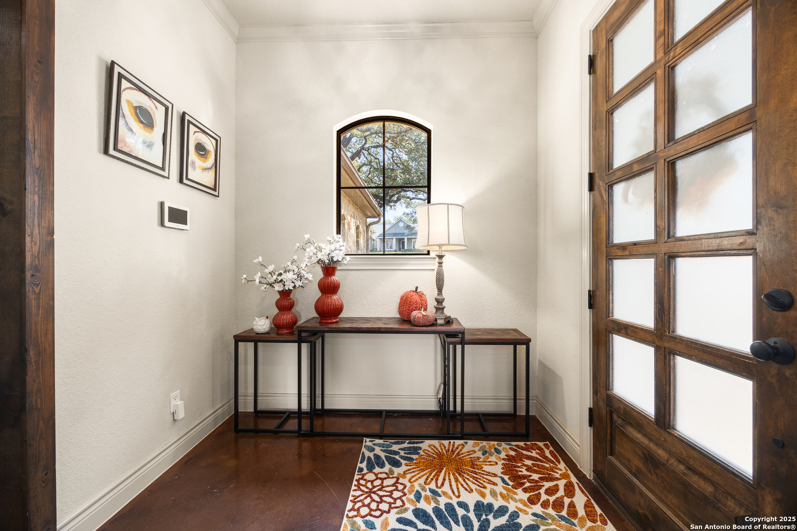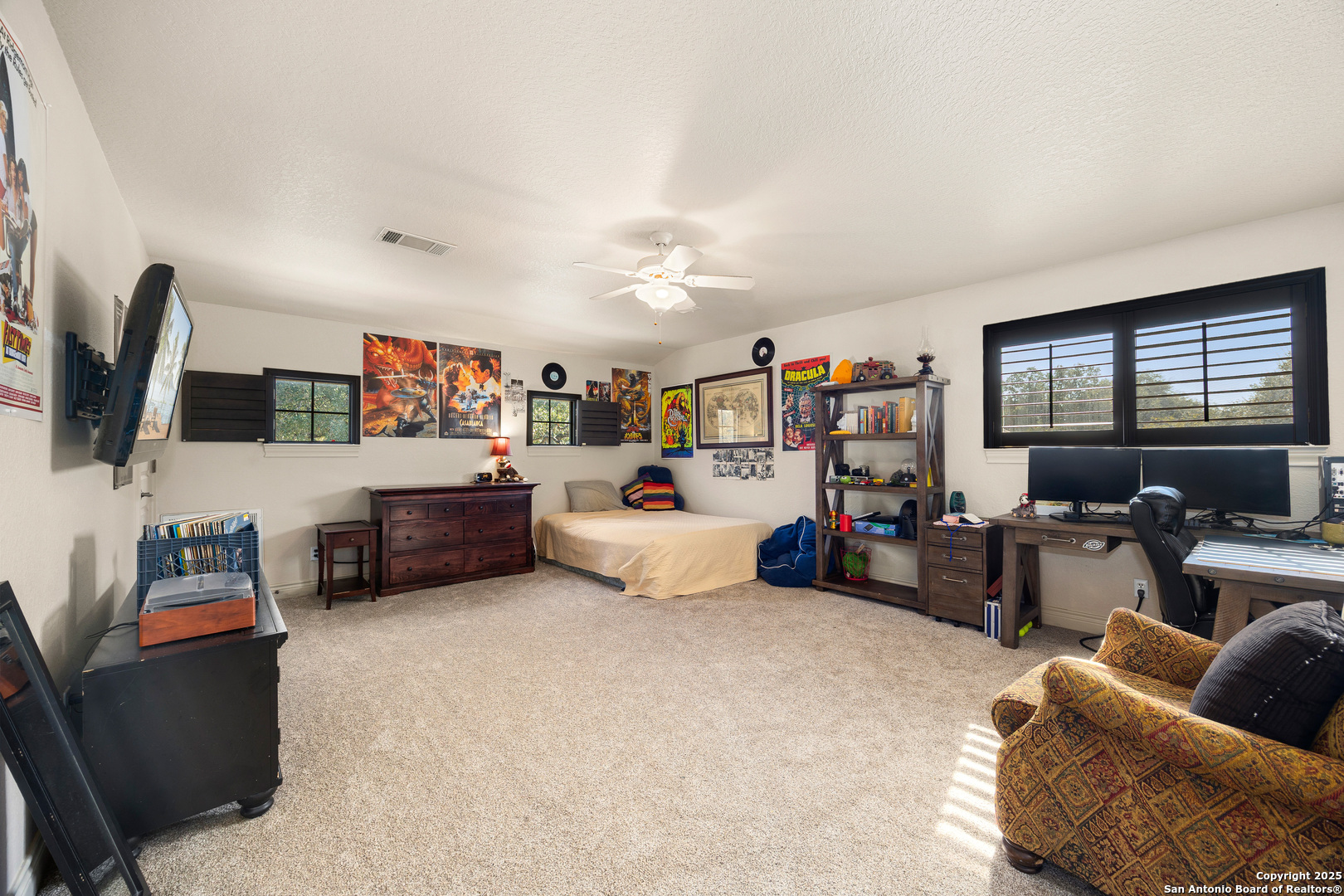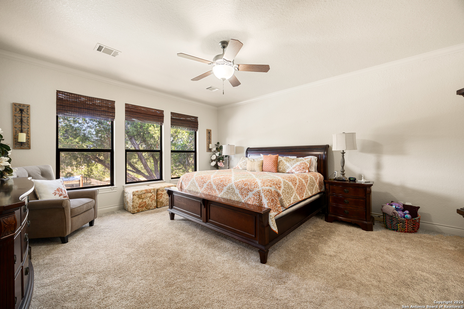 Incredible Opportunity to Own a Slice of Country Paradise! This stunning rustic Hill Country-style home, built by Serenity Custom Homes, is nestled on a Texas-sized 0.61-acre lot surrounded by mature trees and nature-inspired settings. With showstopping curb appeal and a spacious front porch, it's the perfect spot to enjoy your morning coffee at sunrise or unwind after a long day. Inside, the 1.5-story open floor plan was thoughtfully designed for seamless indoor-outdoor living, ideal for both everyday comfort and entertaining. Exquisite craftsmanship shines throughout - from the cozy floor-to-ceiling stone fireplace and sliding barn door, to the custom wood trim framing the family room entryway, adding warmth and rustic sophistication. The main-level primary retreat offers a private escape with a large walk-in closet, walk-in shower, and soaking tub - a perfect place to relax and recharge. Upstairs, the expansive 4th bedroom with its own full bath provides flexibility for a guest suite, mother-in-law retreat, or an impressive game or media room tailored to your needs. Step outside to your one-of-a-kind backyard oasis, featuring a large deck overlooking the sparkling pool - the ultimate backdrop for entertaining or enjoying peaceful Texas evenings. Located in a community with resort-style amenities, this home delivers the feeling of a year-round vacation. Truly, a rare find that captures the perfect balance of rustic charm and modern comfort.