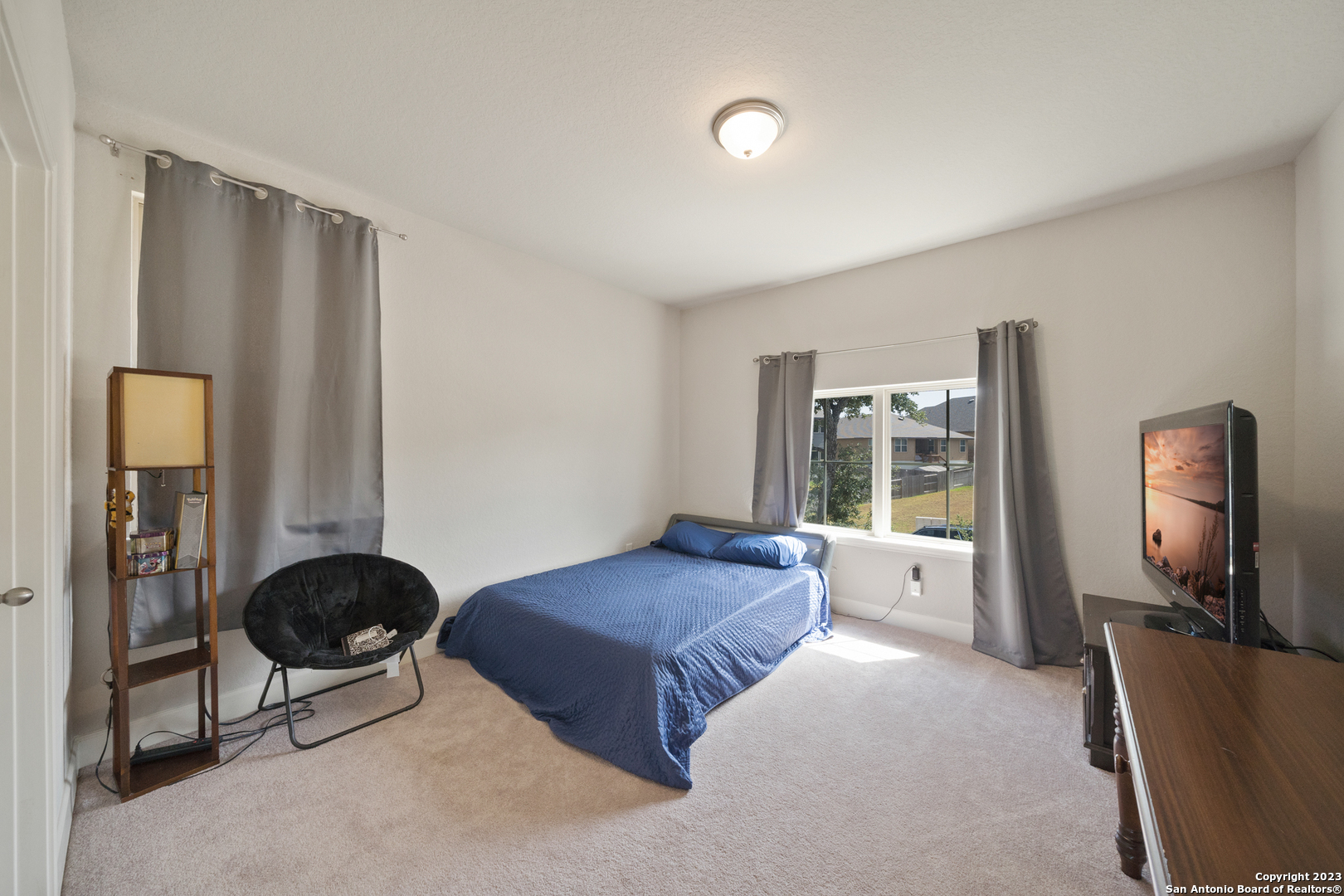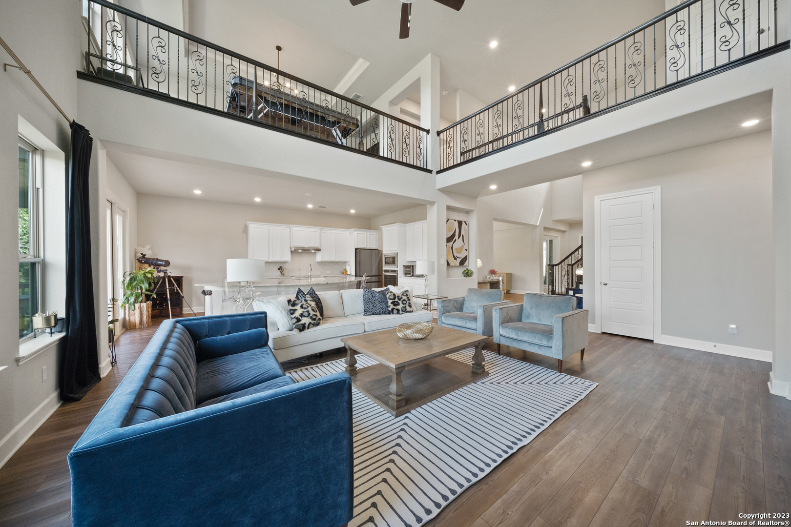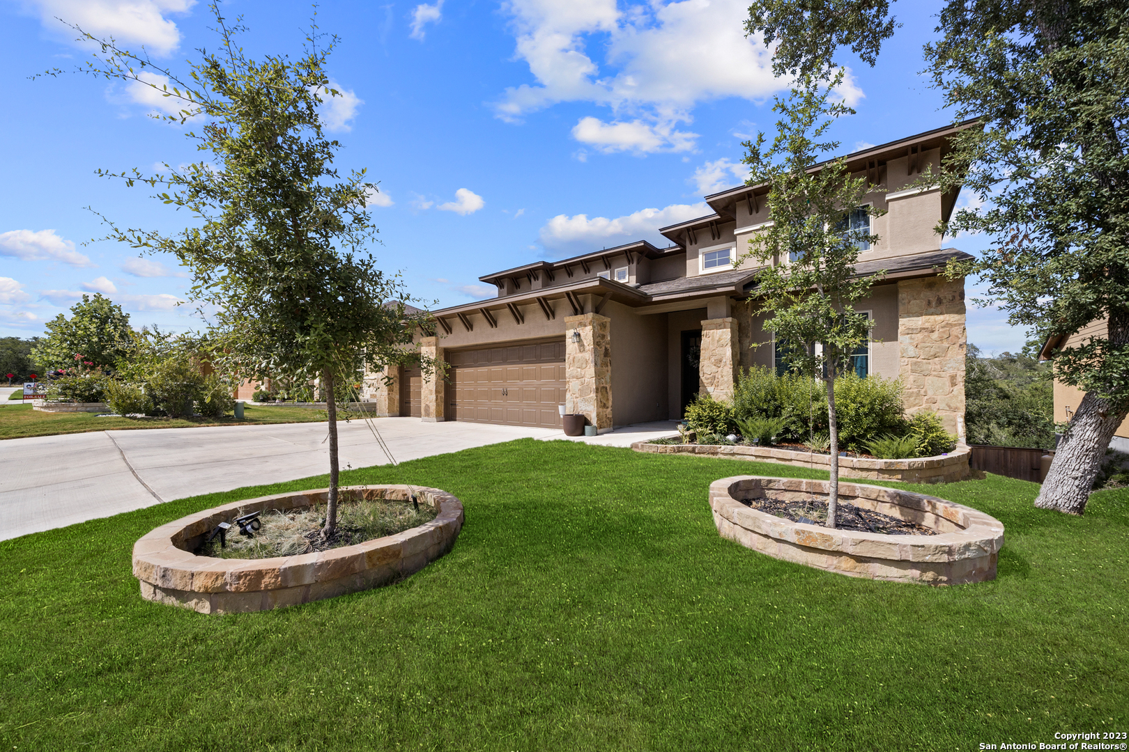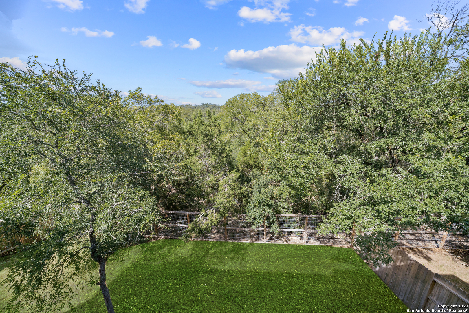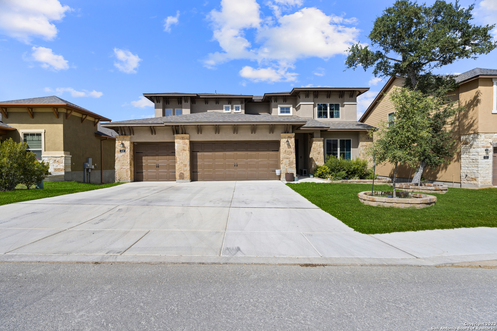 This exquisite two-story home boasts 5 bedrooms, 3.5 baths, plus a study, and spans 3763 square feet of living space. Nestled on a cul-de-sac street, it occupies a 60x120 lot with stunning views of a greenbelt to the rear. The home welcomes with great curb appeal and vinyl wood flooring throughout. The foyer opens up to a striking rear view, and the study is strategically placed at the entrance for privacy. The first floor features an open layout with high ceilings, a spacious living room leading into a gourmet kitchen complete with a large island, stainless steel appliances, built-in oven, microwave, 42-inch cabinets, and ample counter space. A butler's pantry and walk-in pantry connect to the formal dining room, adorned with an elegant chandelier. The lower level also includes a half bath, utility room, and a luxurious master suite with an ensuite bathroom offering dual vanities, a makeup vanity, walk-in closet, linen closets, garden tub, and separate shower. Ascend the wrought iron staircase to discover a game room with captivating views, four additional bedrooms with walk-in closets, and two full bathrooms featuring tiled floors and tub-shower combos. The upper bedrooms are carpeted and well-maintained. Additional amenities include a three-car garage, full sprinkler system, water softener, reverse osmosis, and security system. The backyard's covered patio is perfect for enjoying a glass of wine or morning coffee with views of the rear bluff. Conveniently located near HEB, TX-211, Loop 1604, and an elementary school, the neighborhood offers a pool and playground. This home has much more to offer, making it must-see.