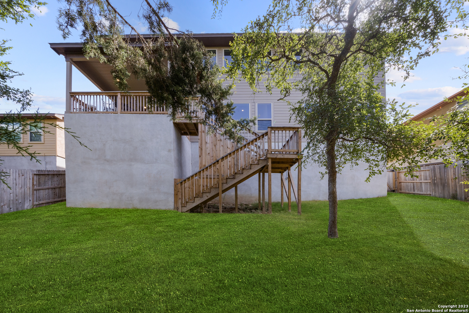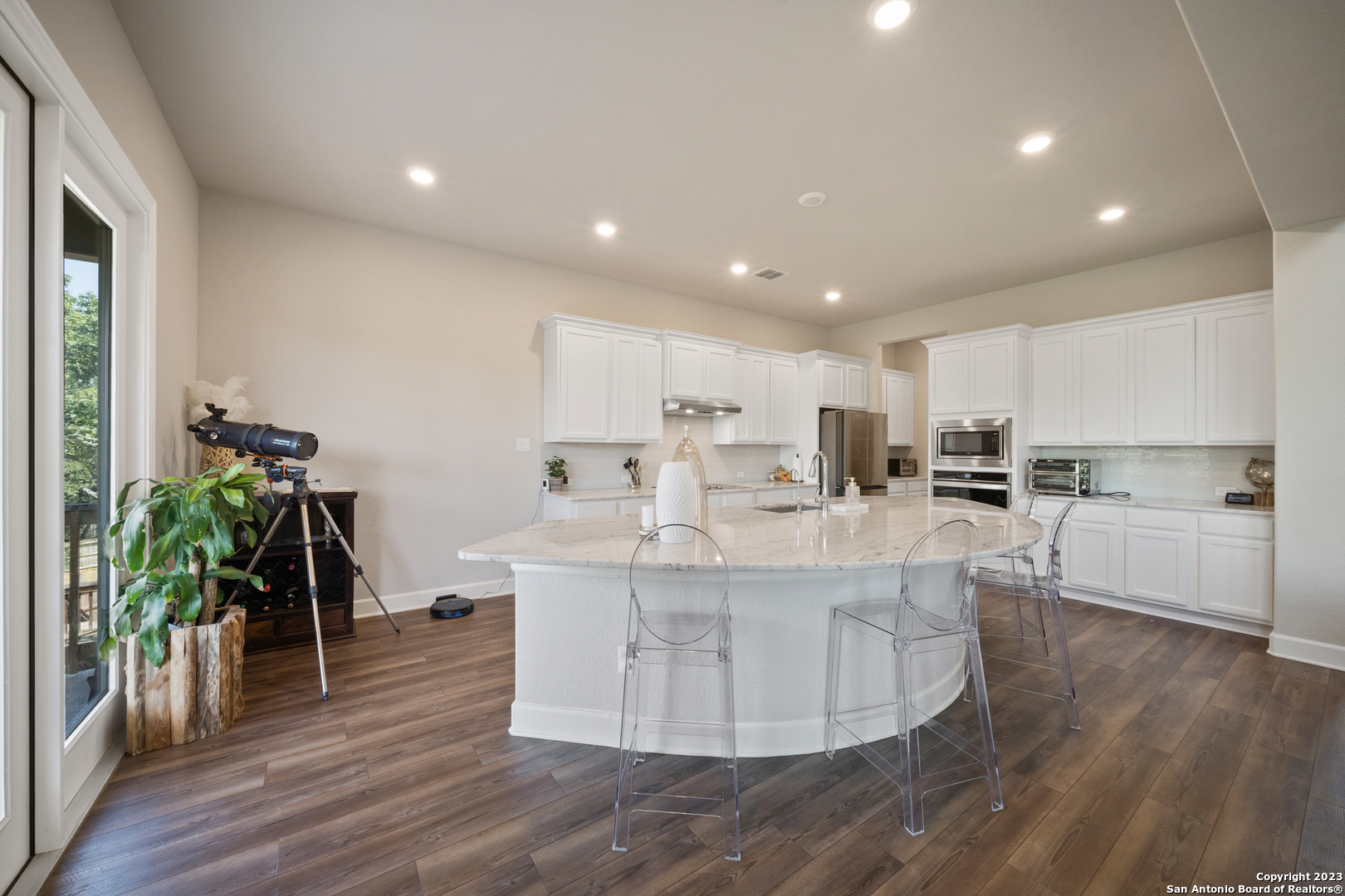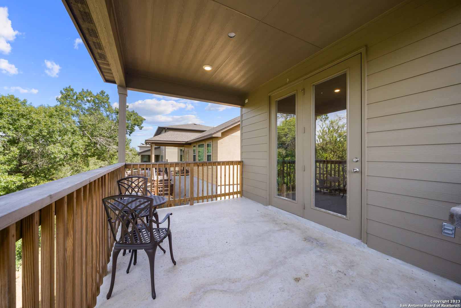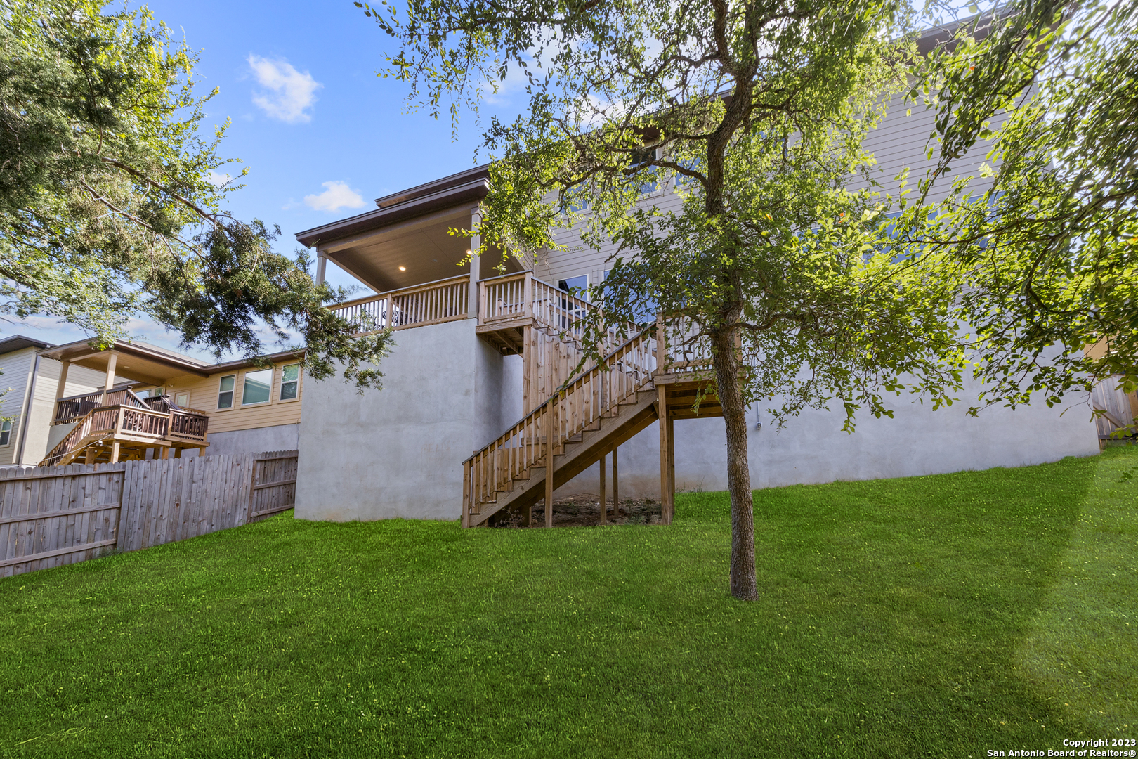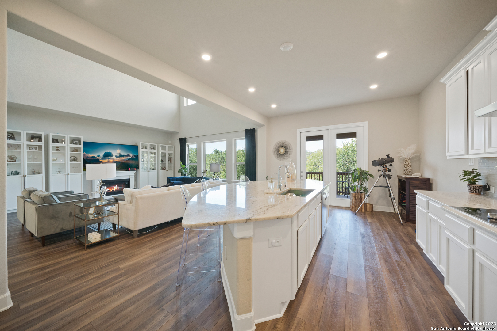 This exquisite two-story home boasts 5 bedrooms, 3.5 baths, plus a study, and spans 3763 square feet of living space. Nestled on a cul-de-sac street, it occupies a 60x120 lot with stunning views of a greenbelt to the rear. The home welcomes with great curb appeal and vinyl wood flooring throughout. The foyer opens up to a striking rear view, and the study is strategically placed at the entrance for privacy. The first floor features an open layout with high ceilings, a spacious living room leading into a gourmet kitchen complete with a large island, stainless steel appliances, built-in oven, microwave, 42-inch cabinets, and ample counter space. A butler's pantry and walk-in pantry connect to the formal dining room, adorned with an elegant chandelier. The lower level also includes a half bath, utility room, and a luxurious master suite with an ensuite bathroom offering dual vanities, a makeup vanity, walk-in closet, linen closets, garden tub, and separate shower. Ascend the wrought iron staircase to discover a game room with captivating views, four additional bedrooms with walk-in closets, and two full bathrooms featuring tiled floors and tub-shower combos. The upper bedrooms are carpeted and well-maintained. Additional amenities include a three-car garage, full sprinkler system, water softener, reverse osmosis, and security system. The backyard's covered patio is perfect for enjoying a glass of wine or morning coffee with views of the rear bluff. Conveniently located near HEB, TX-211, Loop 1604, and an elementary school, the neighborhood offers a pool and playground. This home has much more to offer, making it must-see.