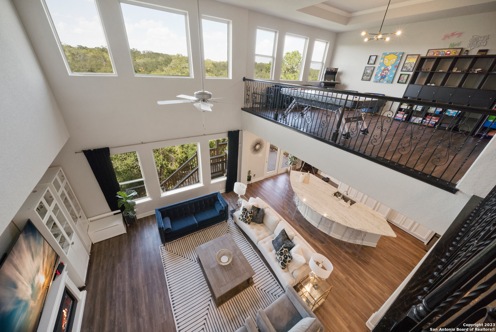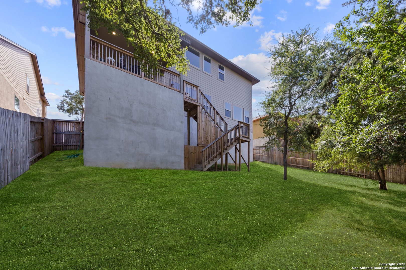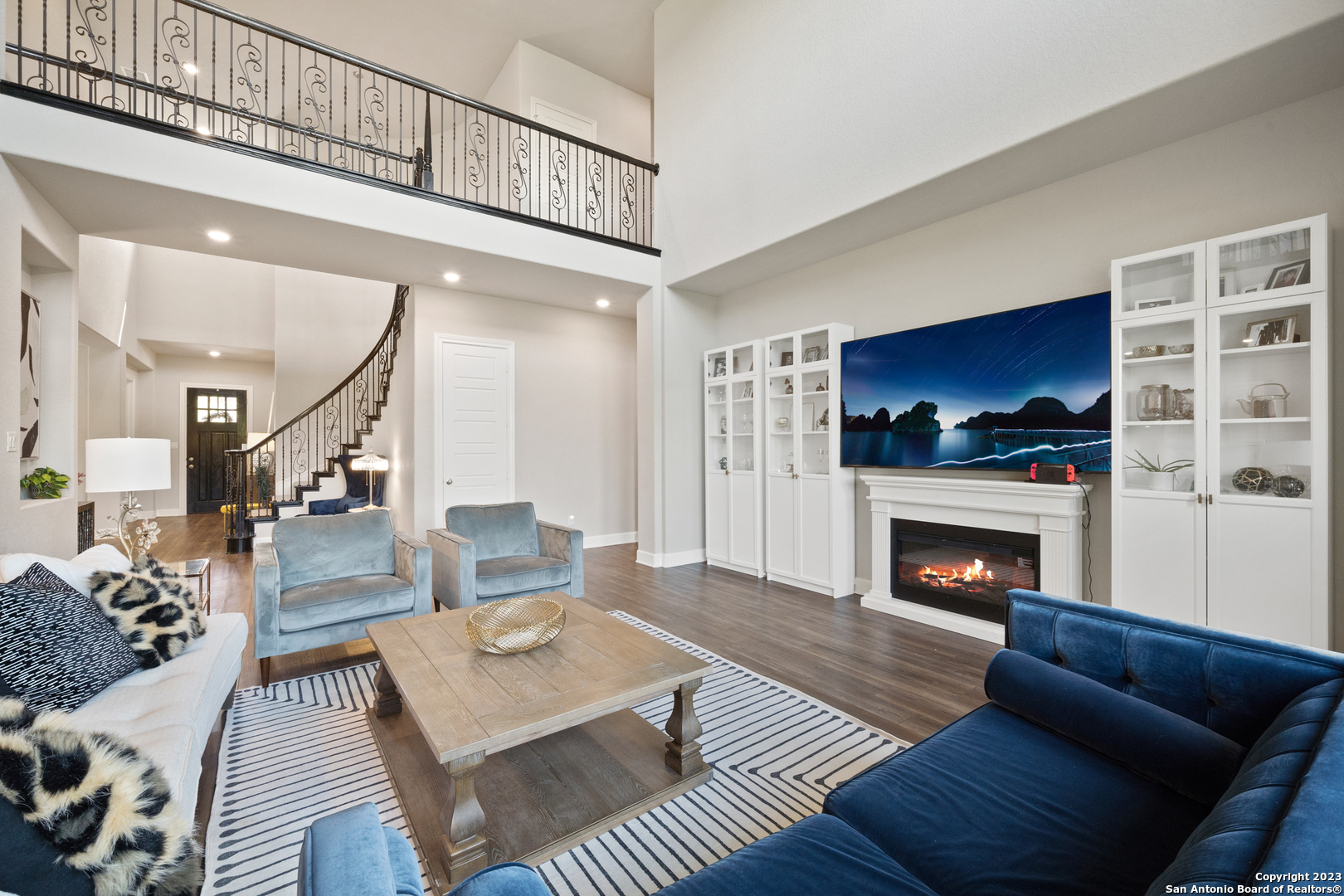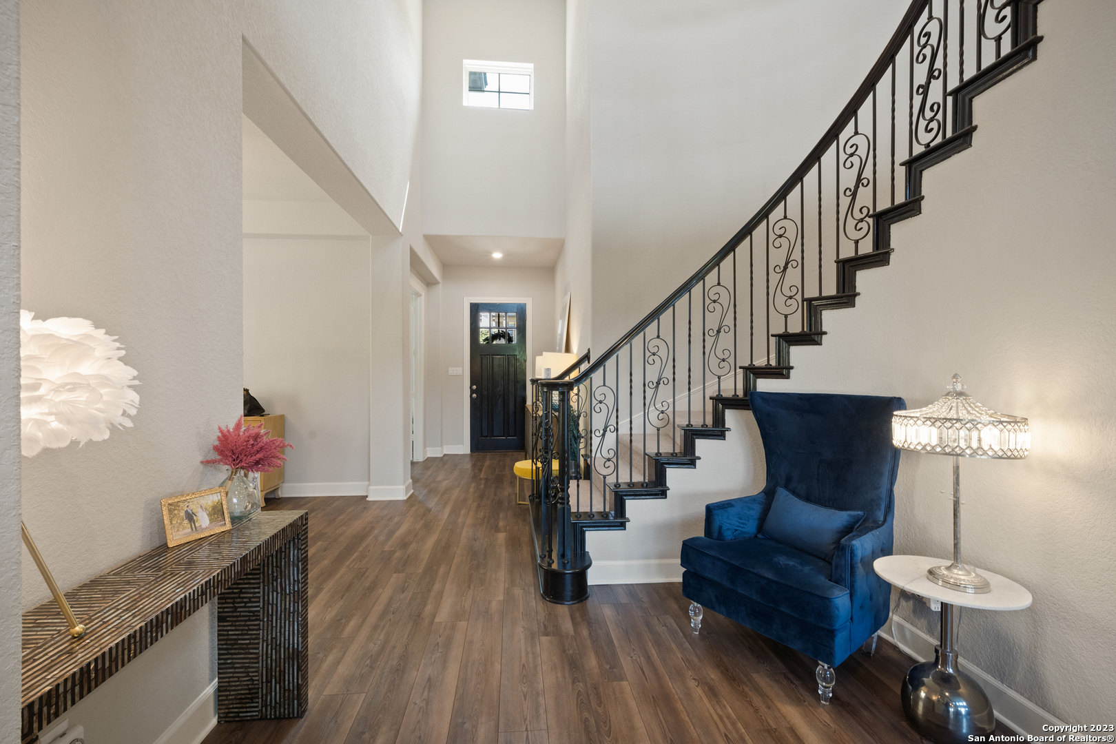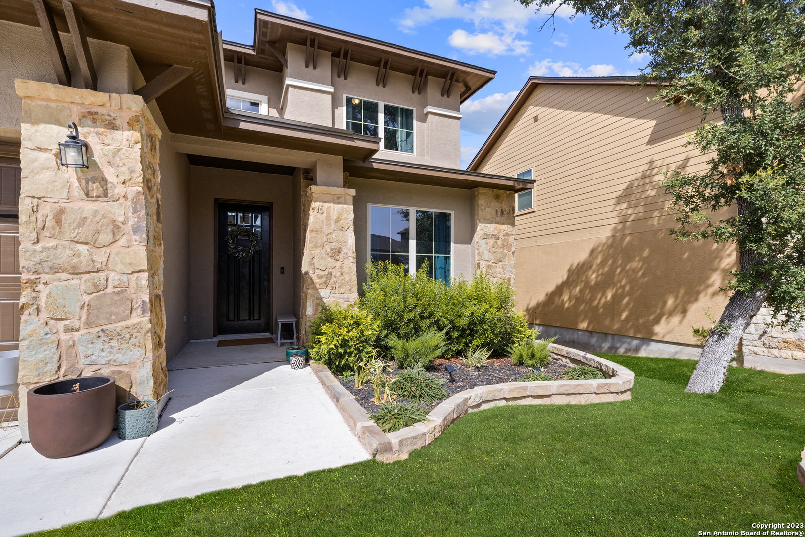 This exquisite two-story home boasts 5 bedrooms, 3.5 baths, plus a study, and spans 3763 square feet of living space. Nestled on a cul-de-sac street, it occupies a 60x120 lot with stunning views of a greenbelt to the rear. The home welcomes with great curb appeal and vinyl wood flooring throughout. The foyer opens up to a striking rear view, and the study is strategically placed at the entrance for privacy. The first floor features an open layout with high ceilings, a spacious living room leading into a gourmet kitchen complete with a large island, stainless steel appliances, built-in oven, microwave, 42-inch cabinets, and ample counter space. A butler's pantry and walk-in pantry connect to the formal dining room, adorned with an elegant chandelier. The lower level also includes a half bath, utility room, and a luxurious master suite with an ensuite bathroom offering dual vanities, a makeup vanity, walk-in closet, linen closets, garden tub, and separate shower. Ascend the wrought iron staircase to discover a game room with captivating views, four additional bedrooms with walk-in closets, and two full bathrooms featuring tiled floors and tub-shower combos. The upper bedrooms are carpeted and well-maintained. Additional amenities include a three-car garage, full sprinkler system, water softener, reverse osmosis, and security system. The backyard's covered patio is perfect for enjoying a glass of wine or morning coffee with views of the rear bluff. Conveniently located near HEB, TX-211, Loop 1604, and an elementary school, the neighborhood offers a pool and playground. This home has much more to offer, making it must-see.