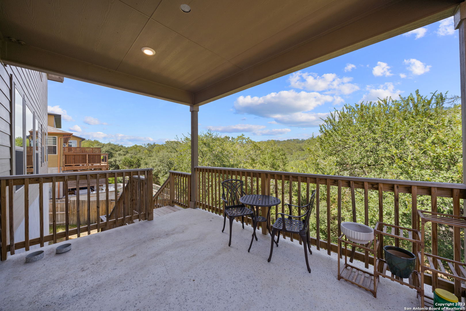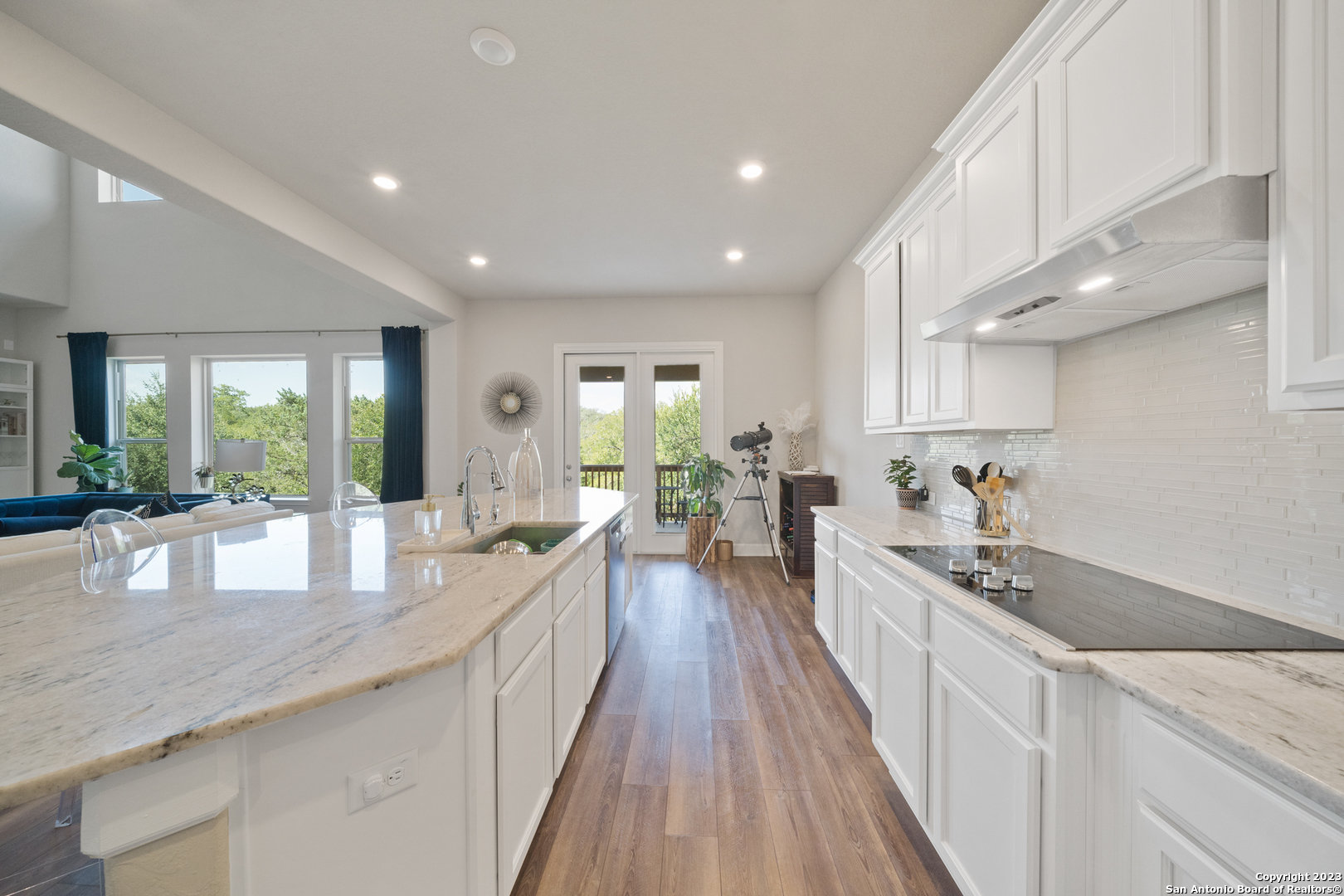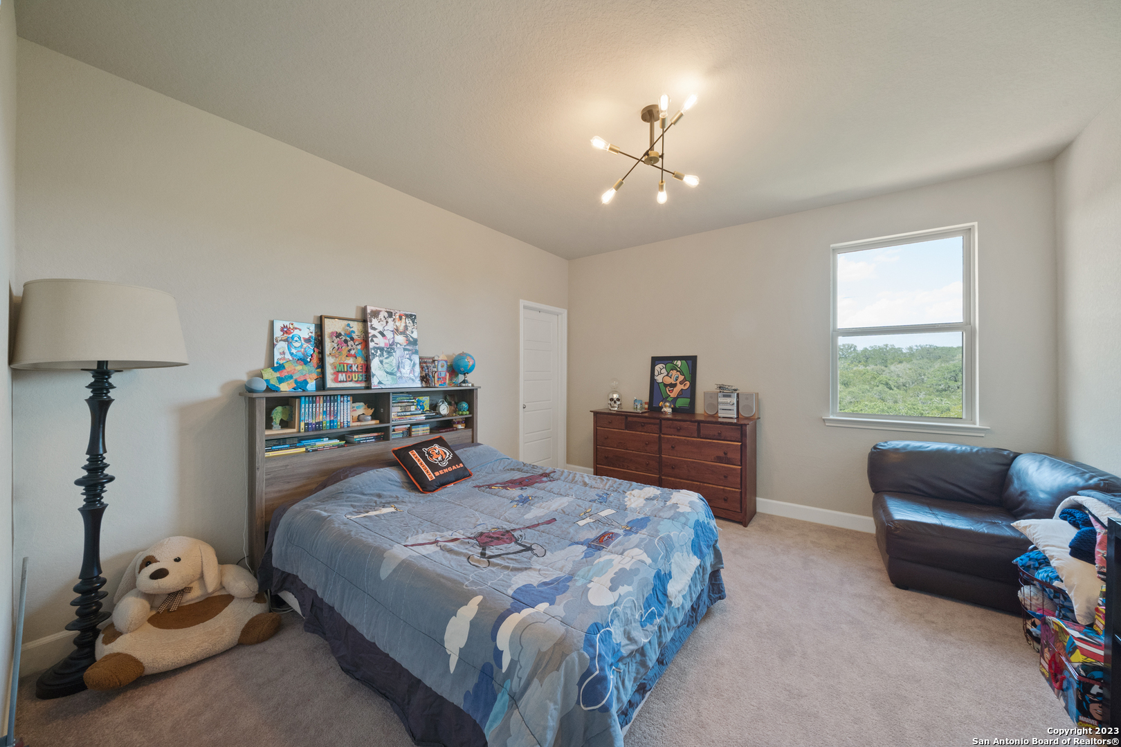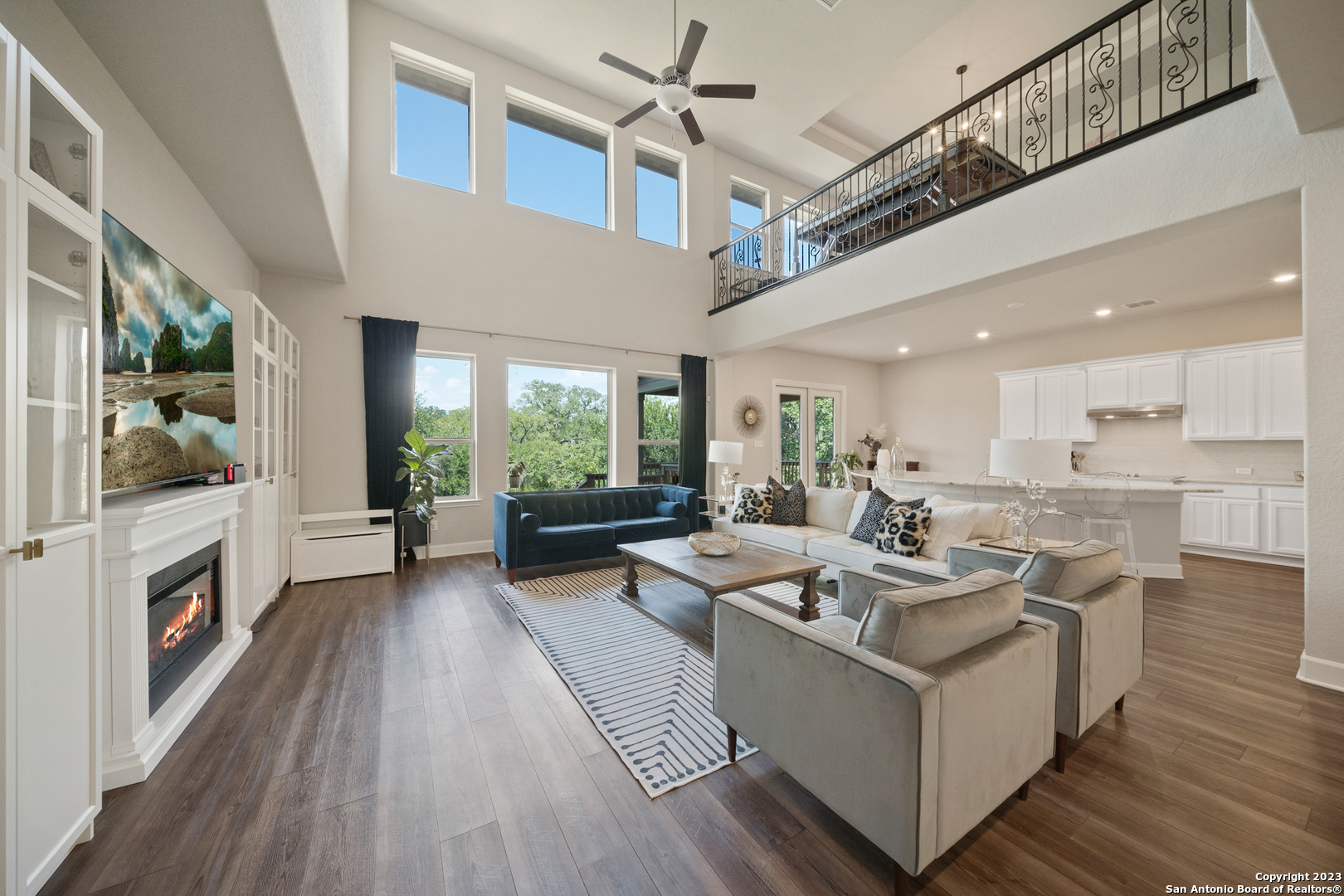 This exquisite two-story home boasts 5 bedrooms, 3.5 baths, plus a study, and spans 3763 square feet of living space. Nestled on a cul-de-sac street, it occupies a 60x120 lot with stunning views of a greenbelt to the rear. The home welcomes with great curb appeal and vinyl wood flooring throughout. The foyer opens up to a striking rear view, and the study is strategically placed at the entrance for privacy. The first floor features an open layout with high ceilings, a spacious living room leading into a gourmet kitchen complete with a large island, stainless steel appliances, built-in oven, microwave, 42-inch cabinets, and ample counter space. A butler's pantry and walk-in pantry connect to the formal dining room, adorned with an elegant chandelier. The lower level also includes a half bath, utility room, and a luxurious master suite with an ensuite bathroom offering dual vanities, a makeup vanity, walk-in closet, linen closets, garden tub, and separate shower. Ascend the wrought iron staircase to discover a game room with captivating views, four additional bedrooms with walk-in closets, and two full bathrooms featuring tiled floors and tub-shower combos. The upper bedrooms are carpeted and well-maintained. Additional amenities include a three-car garage, full sprinkler system, water softener, reverse osmosis, and security system. The backyard's covered patio is perfect for enjoying a glass of wine or morning coffee with views of the rear bluff. Conveniently located near HEB, TX-211, Loop 1604, and an elementary school, the neighborhood offers a pool and playground. This home has much more to offer, making it must-see.
