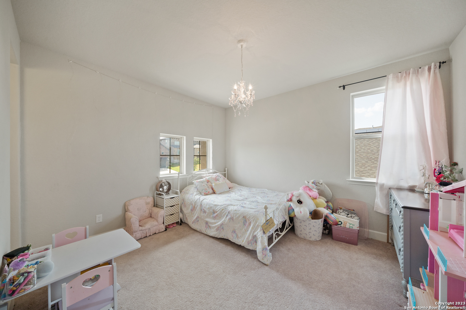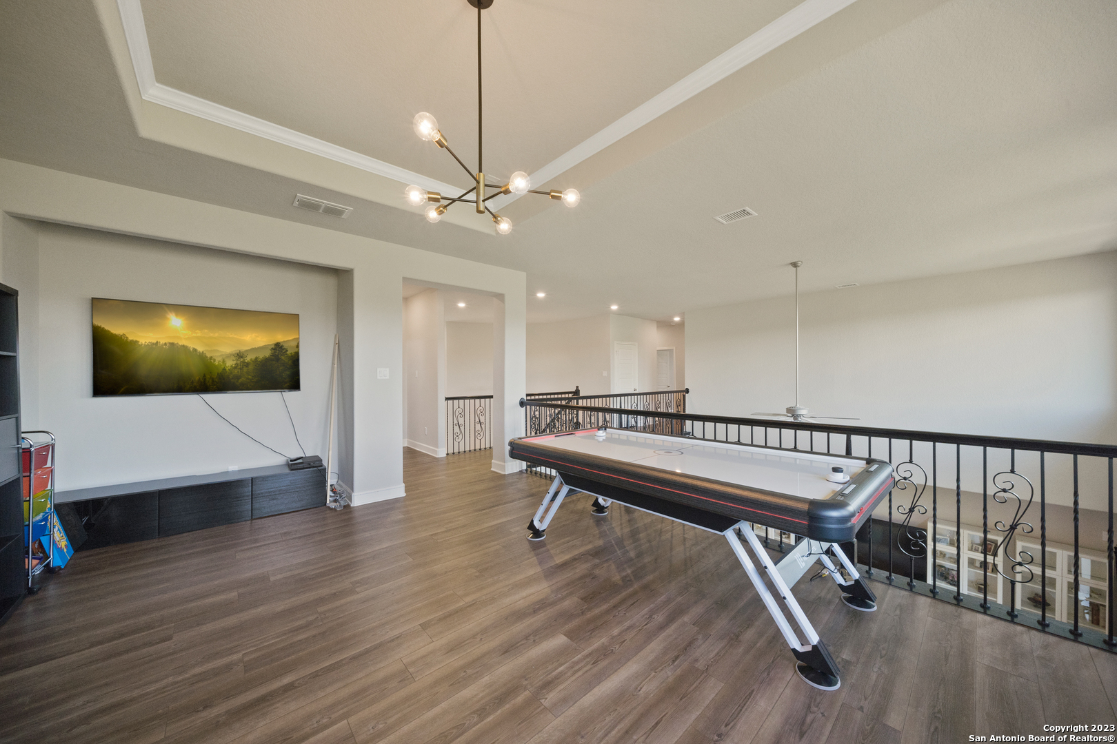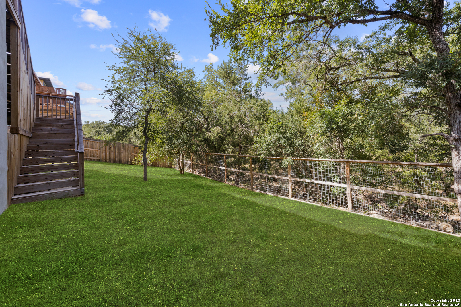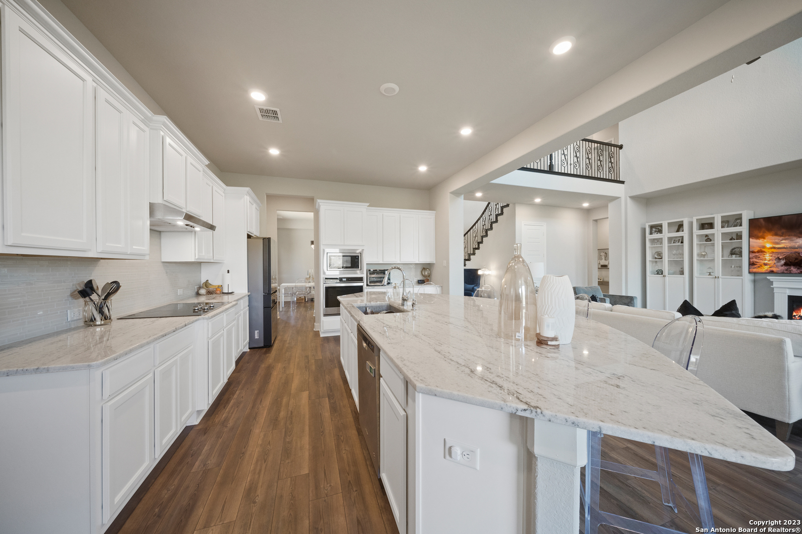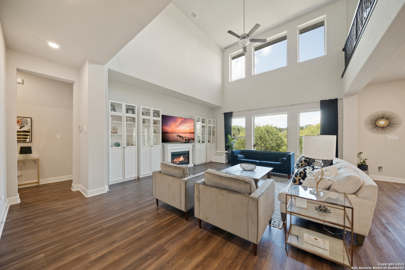 This exquisite two-story home boasts 5 bedrooms, 3.5 baths, plus a study, and spans 3763 square feet of living space. Nestled on a cul-de-sac street, it occupies a 60x120 lot with stunning views of a greenbelt to the rear. The home welcomes with great curb appeal and vinyl wood flooring throughout. The foyer opens up to a striking rear view, and the study is strategically placed at the entrance for privacy. The first floor features an open layout with high ceilings, a spacious living room leading into a gourmet kitchen complete with a large island, stainless steel appliances, built-in oven, microwave, 42-inch cabinets, and ample counter space. A butler's pantry and walk-in pantry connect to the formal dining room, adorned with an elegant chandelier. The lower level also includes a half bath, utility room, and a luxurious master suite with an ensuite bathroom offering dual vanities, a makeup vanity, walk-in closet, linen closets, garden tub, and separate shower. Ascend the wrought iron staircase to discover a game room with captivating views, four additional bedrooms with walk-in closets, and two full bathrooms featuring tiled floors and tub-shower combos. The upper bedrooms are carpeted and well-maintained. Additional amenities include a three-car garage, full sprinkler system, water softener, reverse osmosis, and security system. The backyard's covered patio is perfect for enjoying a glass of wine or morning coffee with views of the rear bluff. Conveniently located near HEB, TX-211, Loop 1604, and an elementary school, the neighborhood offers a pool and playground. This home has much more to offer, making it must-see.
